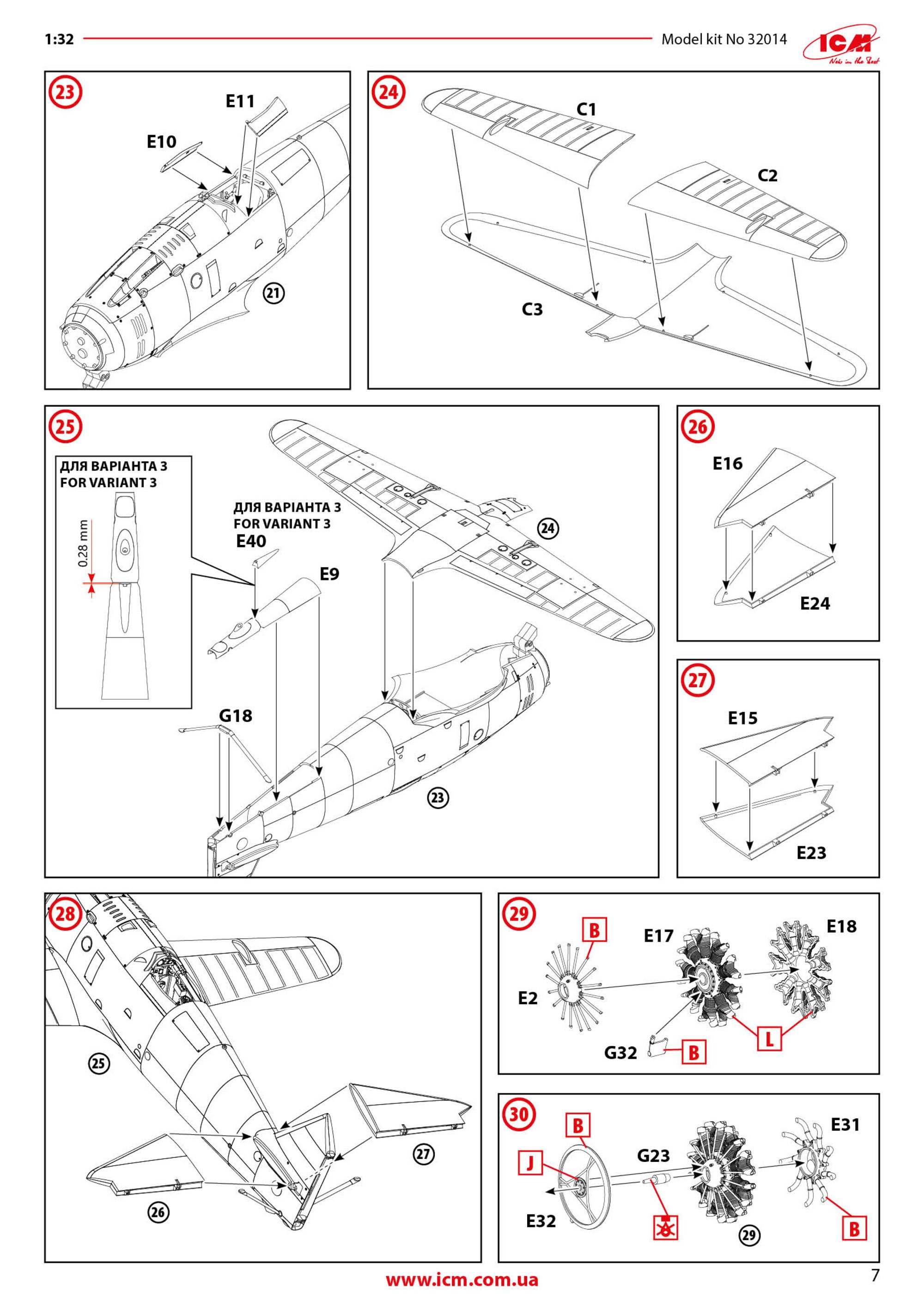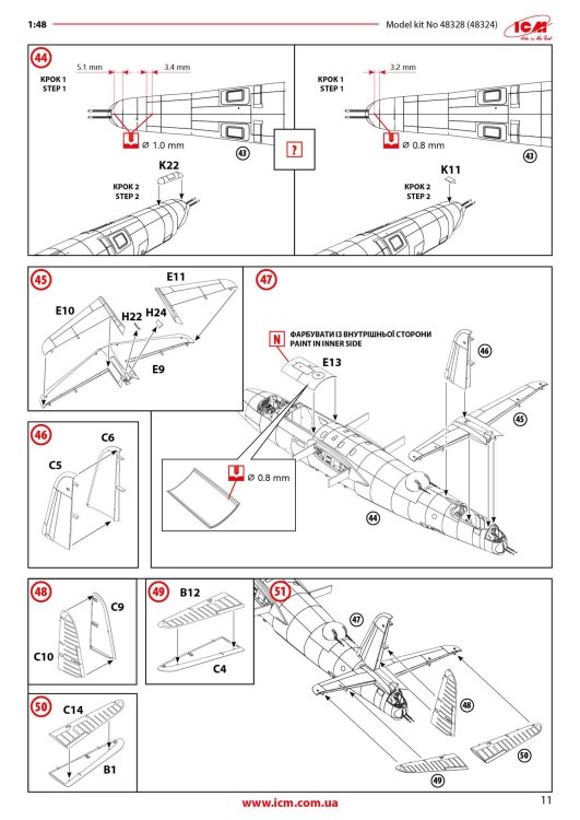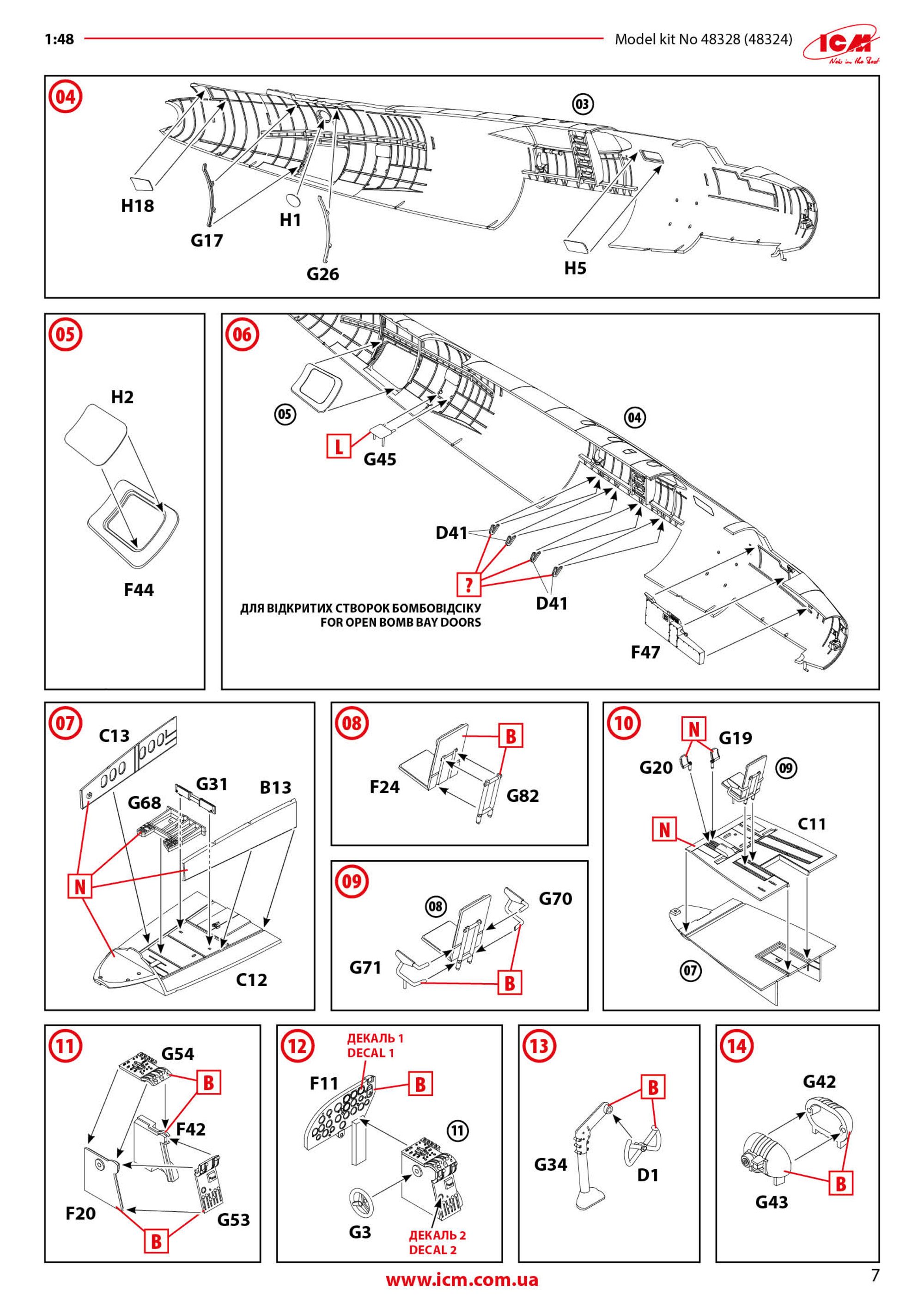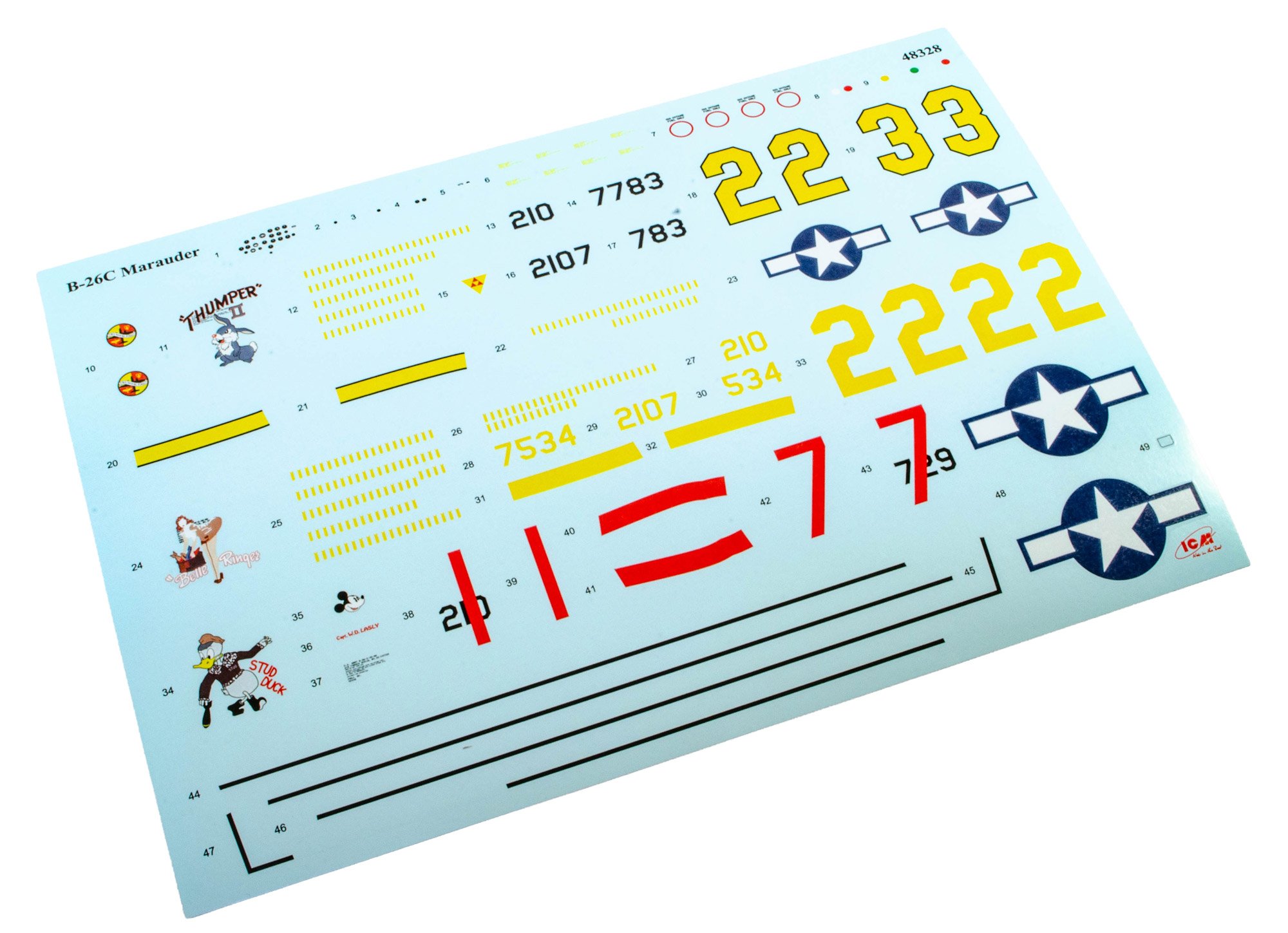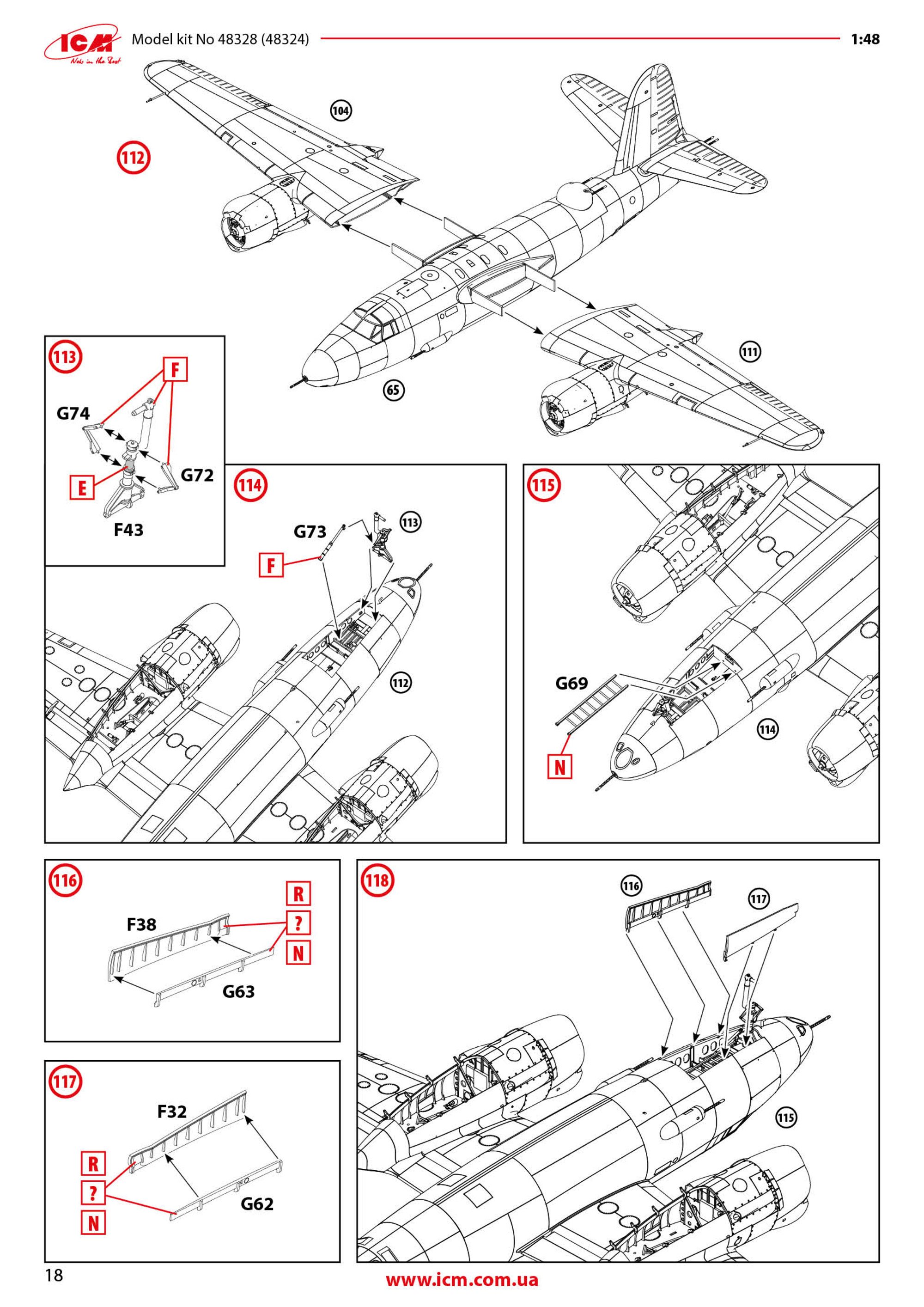 1:48 B-26C-45 Marauder ICM Catalogue # 48328 Available from Scale Model Shop for £67.49 The Martin B-26 Marauder was an American twin-engine medium bomber developed in the late 1930s and early 1940s for the U.S. Army Air Corps. First flying in 1940, it was designed for high speed and efficiency, featuring a sleek, narrow wing and powerful engines. These features made it one of the fastest bombers of its time, but they also resulted in demanding flight characteristics, especially during take-off and landing. Early in its service, a high accident rate earned it the nickname “Widowmaker,” raising concerns among pilots and commanders. As World War II progressed, improvements in pilot training and aircraft design greatly reduced accidents. The B-26 was deployed widely in Europe, North Africa, and the Pacific, with its most significant impact in the European Theatre. There, it was used primarily by the Ninth Air Force for medium-altitude bombing missions against German transportation networks, airfields, and military installations. Its speed, durability, and ability to carry a substantial bomb load made it an effective tactical bomber once crews mastered its handling. By the later years of the war, the B-26 had earned a strong reputation for reliability and survivability. It achieved one of the lowest loss rates of any American bomber in combat, thanks to its rugged construction and disciplined operational use. After World War II, the Marauder was quickly retired from frontline service as newer aircraft became available. Nevertheless, it remains remembered as a plane that overcame early difficulties to become one of the most successful medium bombers of the war. The kit This is around the 9th or 10th incarnation of the ICM B-26 Marauder kit since its initial release in 2024…and remember we are only just into February of 2026. This time we see the B-26C-45 (Block 45) The B-26C-45 Marauder was a specific production block of the Martin B-26C; the Omaha-built counterpart to the Baltimore-built B-26B series. The Block 45 possessed larger wings and tail, refined defensive armament and sights, stronger bomb gear and standardised late-production fittings. The kit itself is packaged into ICM’s standard and very robust corrugated box with a top opening flap, and a thinner, glossy and separate product lid. Inside the box, we are met with a number of thick cellophane sleeves that contain NINE sprues of light grey styrene and ONE clear sprue. The size of the model is hinted at with the main fuselage halves. Like all/most ICM kits, the exterior doesn't contain rivets but is plenty rich in just about all other detail. The finish of these large parts is excellent. Internally, you can see stringer and former detail that will adorn the crew areas. You can see here that the wings aren't just simple tab and slot connections. There are two bulkheads which flank the bomb bay and these have the mini spar sections onto which the completed wings will slide. The tail unit sits atop of the rear fuselage and again, aren't just surfaces which plug into the fuse. There are some holes that will need drilling out of these parts, specific to this version. The manual clearly illustrates these. You can see some bomb bay bulkheads in this sprue, BUT, these aren't used in this build. Instead, we have alternative parts which you'll see soon. In fact, there are only eight parts that will be used off this sprue, and they aren't any of the larger ones either. Most of this sprue is redundant. On these two sprues, you will find many common parts for which there are duplicates, such as props, engine parts, ordnance, weapons, optional cheek gun pods (fitted to one machine), cowl parts, u/c door hinge units, and main gear bay doors. Absolutely lots of finesse in the moulding here. No flash or awkward elector pin marks. Another detail sprue. There's only one single part not being used here, showing you the sheer level of detail and number of parts that will go into your final build. ICM state this version of the Marauder contains 362 parts, accounting for the optional gun pods on one machine. Parts on this sprue include cockpit and bulkhead details, bomb rack ladders, armaments, bomb bay door actuators (if posing the doors open), gear scissors, cockpit access ladder, etc. All parts here are slated for use. Here you will find more cockpit elements, parts for the split landing flaps, crew area and ammunition feed detail, wall mounted bomb racks, turret details, u/c gear bay parts, etc. The most obvious parts here need no explanation. The wings are simply fitted out with their internals for the gear bays and then the halves can be glued together before things like ailerons, flaps and nacelles are added. Other sprue it4ms include bulkheads, turret mounting plate and both sections of the forward cockpit floor. Here are the bomb bay fore and aft bulkheads with their associated wing spar detail onto which the main wings will mount, as well as the single piece upper tail section with their set dihedral, as well as the lower panels, supplied as individual parts. There is more split flap detail here, and crew floor sections for the various areas such as the tail gunner, and also the ceiling for the bomb bay. This sprue almost mirrors the previous one containing the wing sections. On here though, you will find parts for the internal nacelle gear bays as well as the nacelles themselves which are moulded as halves. A single clear sprue is included, protected by a foam wrap and separately sealed. The clarity of these parts is excellent. Both of the main cockpit windshields are for use with this release, depending on which machine you build. One of them has more framing than the other. Only one of the glazed nose parts can be used though, common to all three machines offered in this release. Decals A single decal sheet is included, with markings for THREE machines. These also include walkway lines and a small number of stencils, as well as some 