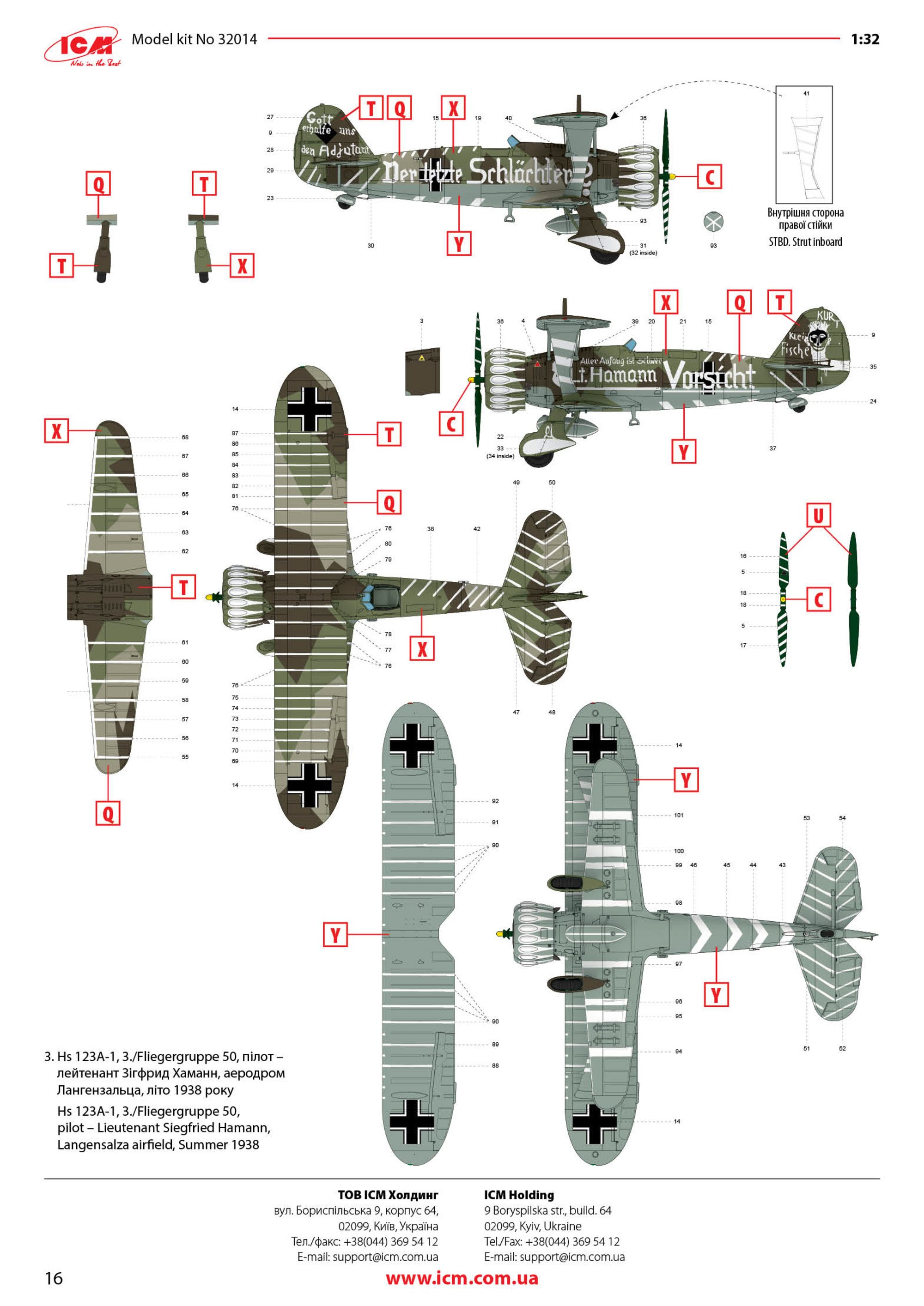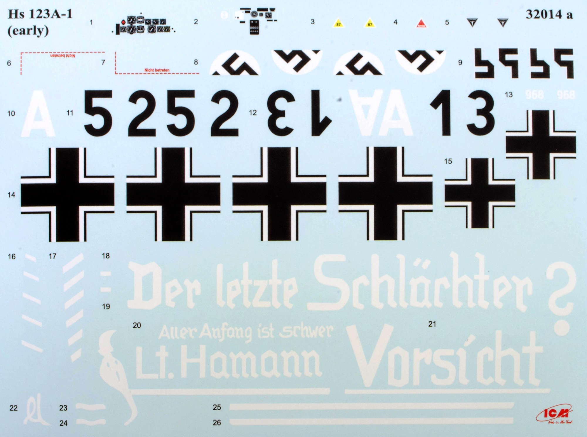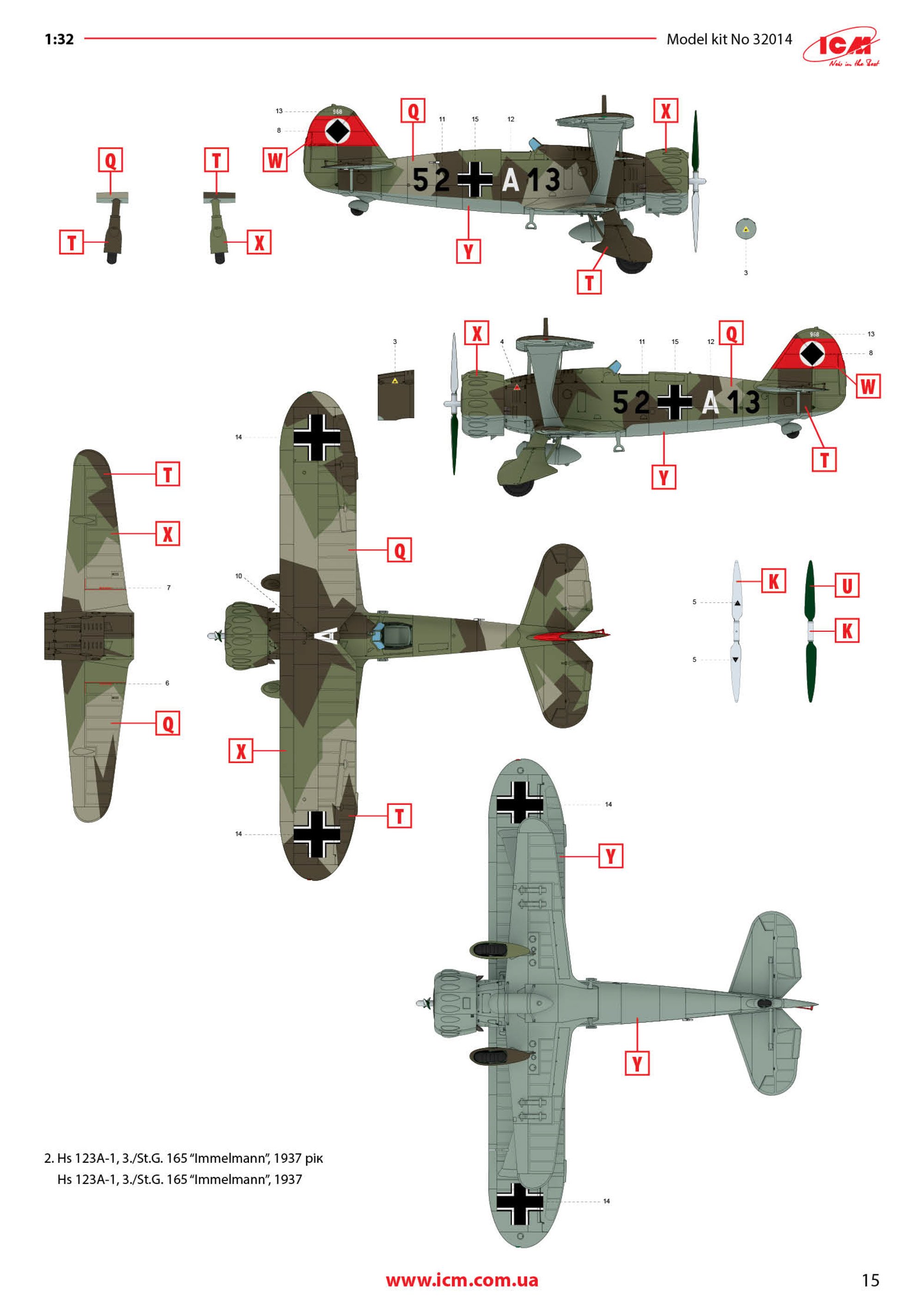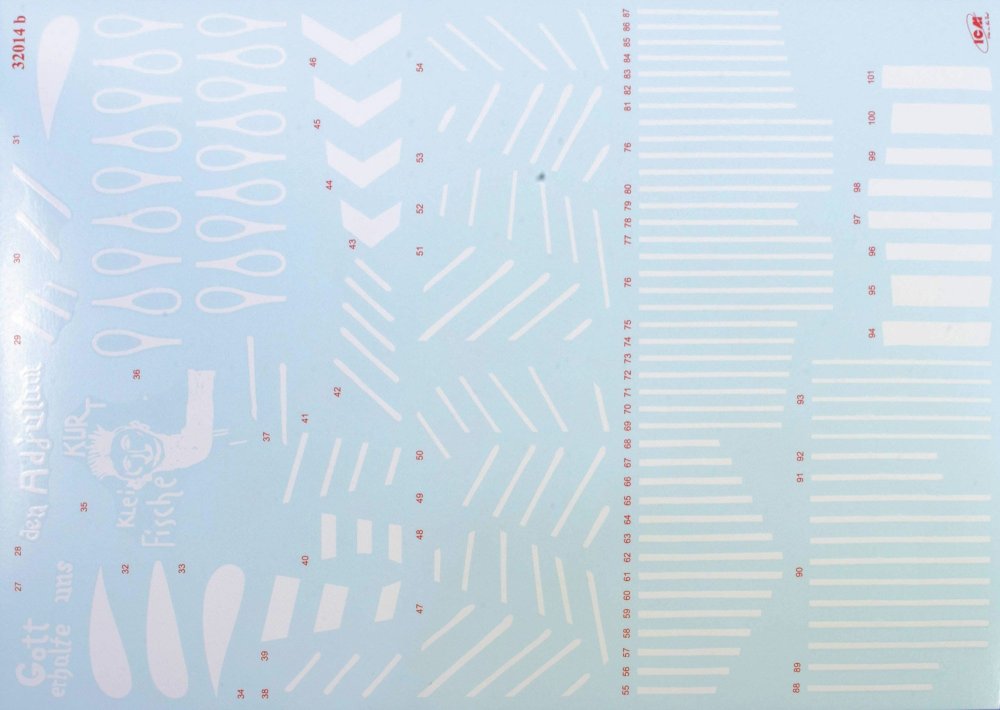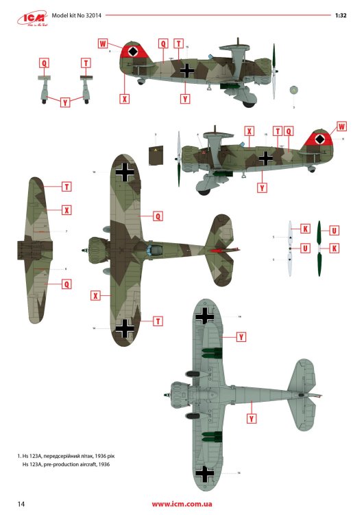 1:48 Hs 123A-1 ICM Catalogue # 32016 Available from Jadlam for £47.49 The Henschel Hs 123A-1 was a German single-seat biplane dive bomber and ground-attack aircraft developed in the early 1930s, during a period when the Luftwaffe was still in its formative stages. Designed by Henschel Flugzeug-Werke, the Hs 123 first flew in April 1935 and was initially intended to serve as a modern dive bomber for Germany’s rapidly expanding air force. At the time, biplane designs were becoming outdated, but the Hs 123 stood out for its strong construction, excellent manoeuvrability, and reliability. The A-1 variant was the first production model and entered service in 1936, helping to establish Germany’s early close air support and tactical bombing capabilities. The Hs 123A-1 saw its first combat use during the Spanish Civil War (1936–1939), where it was flown by the German Condor Legion in support of Nationalist forces. In this conflict, the aircraft proved highly effective in ground-attack missions, using bombs and machine guns to strike enemy troops, vehicles, and fortifications. Pilots praised its ruggedness and ability to operate from rough airfields close to the front lines. The aircraft’s radial engine produced a distinctive sound in dives that was designed to intimidate enemy troops, adding to its psychological impact. Experiences in Spain demonstrated that, despite its outdated appearance, the Hs 123A-1 was well suited to low-altitude battlefield support. During the early years of World War II, the Hs 123A-1 continued to serve with the Luftwaffe in campaigns in Poland, France, and on the Eastern Front. Although more modern monoplanes were becoming standard, the Hs 123 remained in use because of its durability and effectiveness in harsh conditions. It was especially valued in the Soviet Union, where it could operate from primitive airstrips and withstand heavy ground fire. By 1942, most Hs 123 aircraft had been replaced by newer designs such as the Junkers Ju 87, but some remained in frontline service until 1944. The Hs 123A-1 is remembered as one of the last successful combat biplanes and as an important contributor to early German close air support doctrine. The kit This kit is ICM's fourth incarnation of the Henschel Hs 123 kit, since its inception in 2024. For me, this probably has the most bizarre but extremely attractive scheme that ever adorned this type. The kit itself is packaged into one of ICM's very sturdy top flap opening boxes, with a separate glossy lid depicting that particular machine that I mentioned. Inside, there are EIGHT sprues in grey styrene, and one in clear. There is also a 16 page, full colour instruction booklet, and TWO decal sheets. Ok, let's take a peek... Not too many parts on this sprue, but we do start with a view of the fuselage halves. The kit is moulded in ICM's usual mid/light grey styrene which melts beautifully with a decent cement like Tamiya's hot stuff. The fuselage is typical of ICM in that there's no rivet detail, but the panel lines are nicely represented with some finesse. If you want rivets, then it's time to put Rosie to use. You could, I suppose open the louvres up a little, but I'm not convinced that it would be necessary as the gap would be tiny. Some wash in there would probably have the same effect. Internally, the fuse has some moulded detail onto which to add further detail. One particular machine will need hole(s) drilling out, clearly shown in the manual. Also supplied here is the forward upper fuse with integral MG channels, and a two-part drop tank that will be slung underneath he fuse centreline. Three parts comprise the lower wing, with the underside being full span (yet relatively small in 1:32). Again, no rivet detail, but pretty much everything else. The landing flaps are moulded in a closed position. The lower wing doesn't have ailerons, so no need for such details. The strut sockets are reasonably deep too, meaning fitting and mounting the upper wing should be quite easy. All parts here are used except for two upper wing inserts which would be used to hang the ailerons. There is a set to use here, so not quite sure what the difference is except for a possibly different aileron style. Here you will fine the aileron, elevator and rudder halves. all with excellent fabric and rib details...not too harsh to my eye. There are TWO of these sprues, duplicating all of the parts of which there are two or more. Here you will find undercarriage struts, spats, ordnance (plus percussion bombs), wheels, bomb racks, fuselage MGs, etc. Everything on this sprue is to be used with this release. This is where you'll find many of the cockpit details, as well as two-part intake unit, cabana struts, tailplane support struts (moulded as a single part), engine exhaust array, and things such as control surface push/pull rods. Now we can see the various parts which construct the BMW 132D radial engine, These are moulded in beautiful detail, and with some quite fragile parts that could use some decent quality nippers to remove from the sprue. You will also see the multipart engine cowl with its familiar blisters, wing struts, tailplane halves, two-blade prop, cockpit bulkheads, seat, and instrument panel etc. The entire upper wing is moulded in two full-span parts, minus the ailerons. The detail nicely represents the fabric covered original with its dope-shrunk scalloped surface. There is only one clear sprue, and it's tiny. This comprises the windscreen and wingtip lights. You can't see in this photo, but the clarity of the parts is every bit as good as other contemporary manufacturers. Decals The are TWO decal sheets in this release, catering to THREE different schemes. One sheet carries decals for just one single machine, meaning all those whacky white lines and graffiti don't have to be done by hand or masked. All decals are thinly printed and in perfect register, with minimal carrier film. Colour is solid, which is just as well with all the w