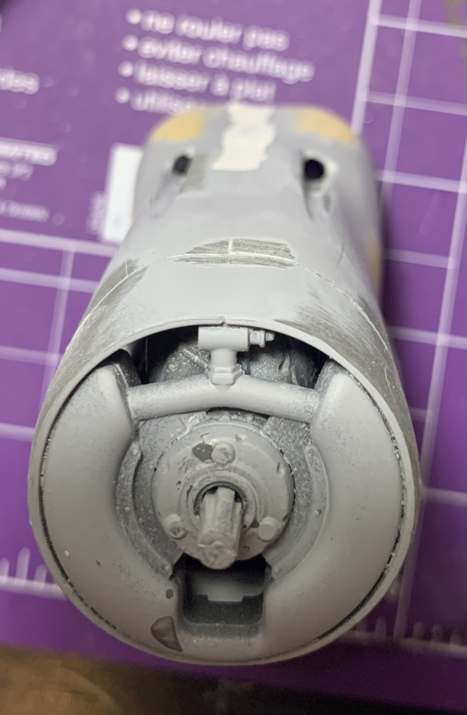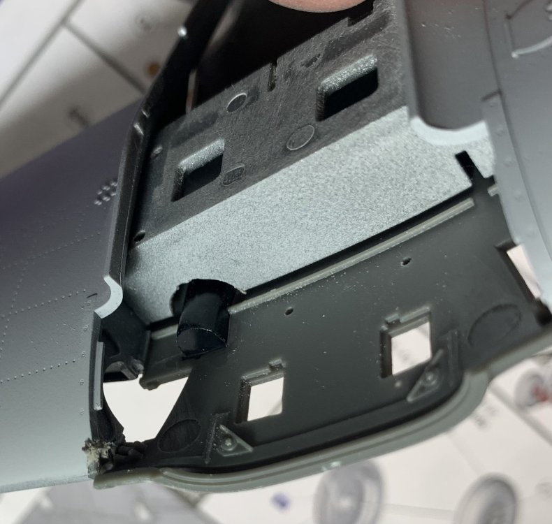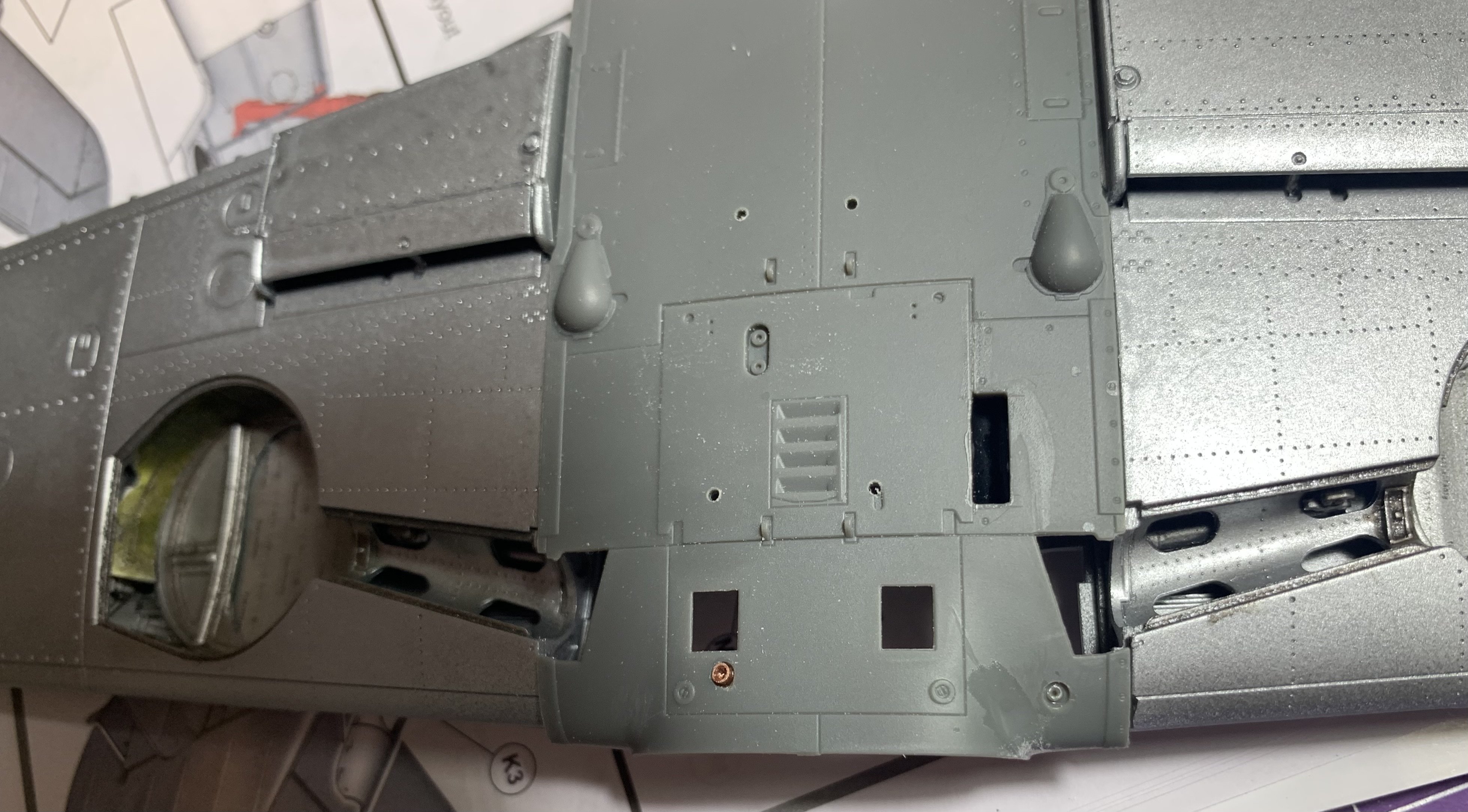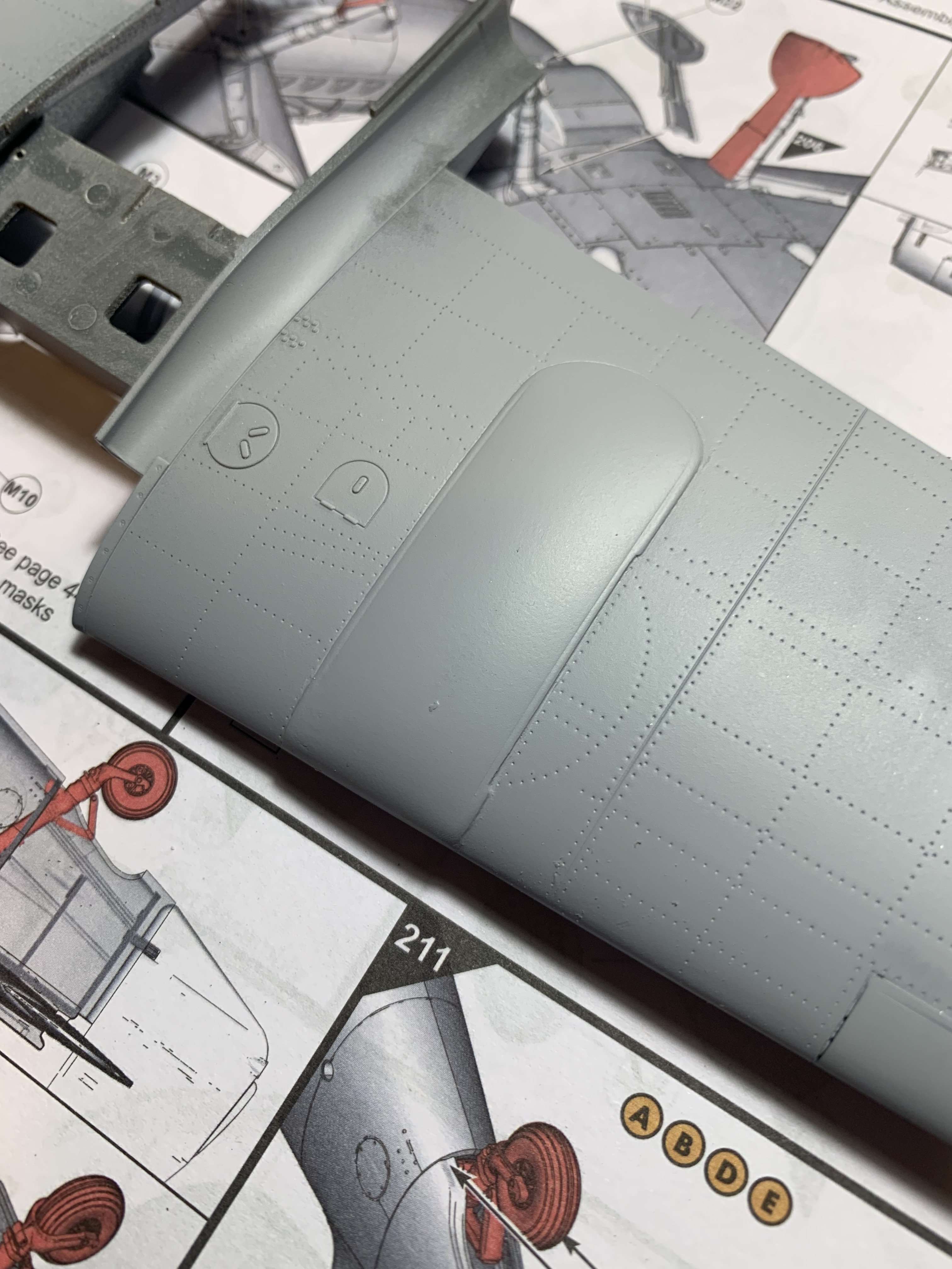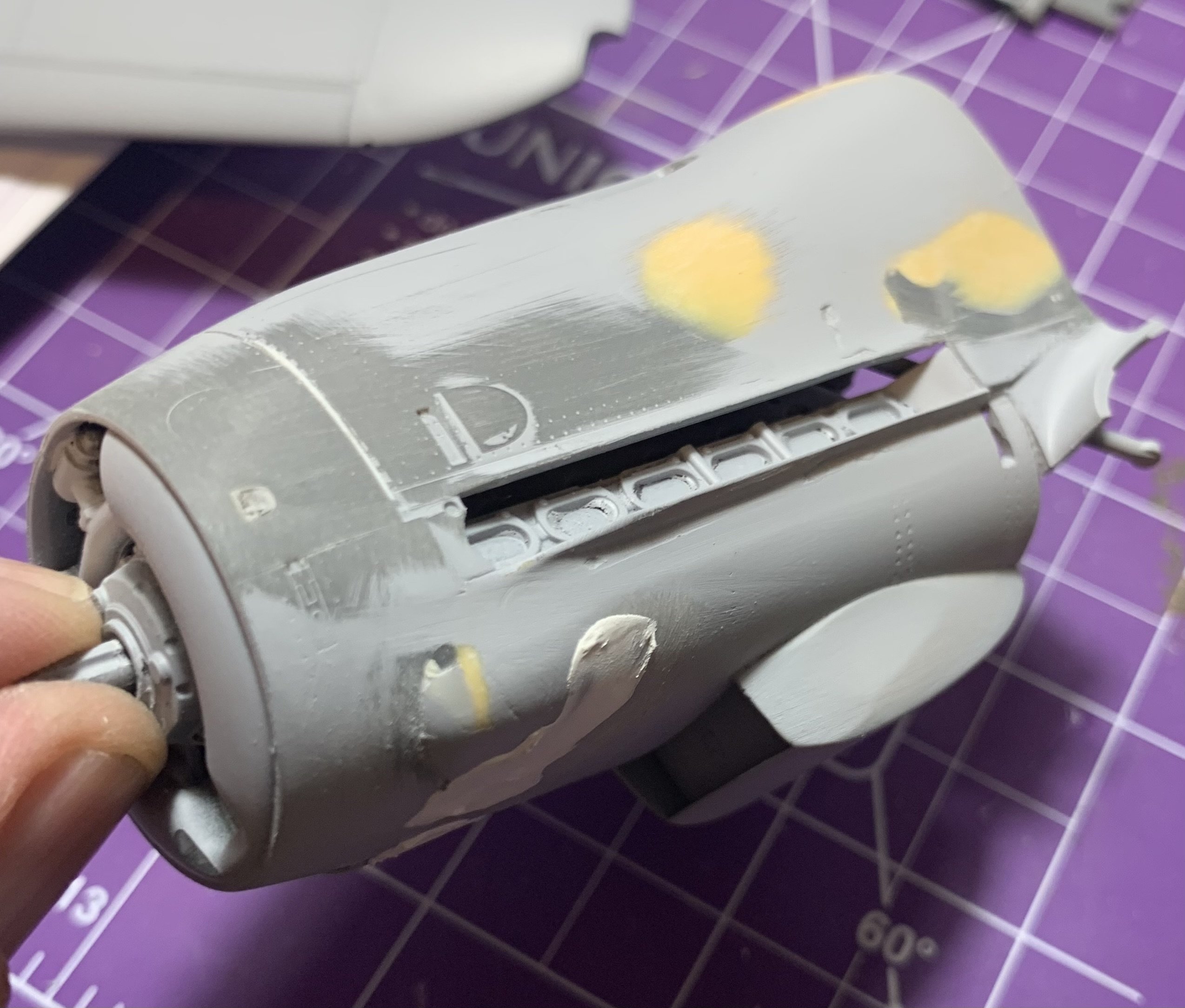 The progress is slow, I can work behind my bench only for short period of time. Usually ten minutes at the time. The main wing is almost ready. I finalized the shape of the wing bulges and created space for the ejection port shoot that is somewhat compromising the integrity of the gear leg assembly. I’ve also been working on the shape of the power egg , however the progress is much slower there, since everything has to be recreated from nothing. The original parts serve as a locators for positioning if the exhaust , gun ports etc. I know, one would say that there’s not much difference between the G and K models , but in reality everything has to be altered , scratched build or modified in one way or the other