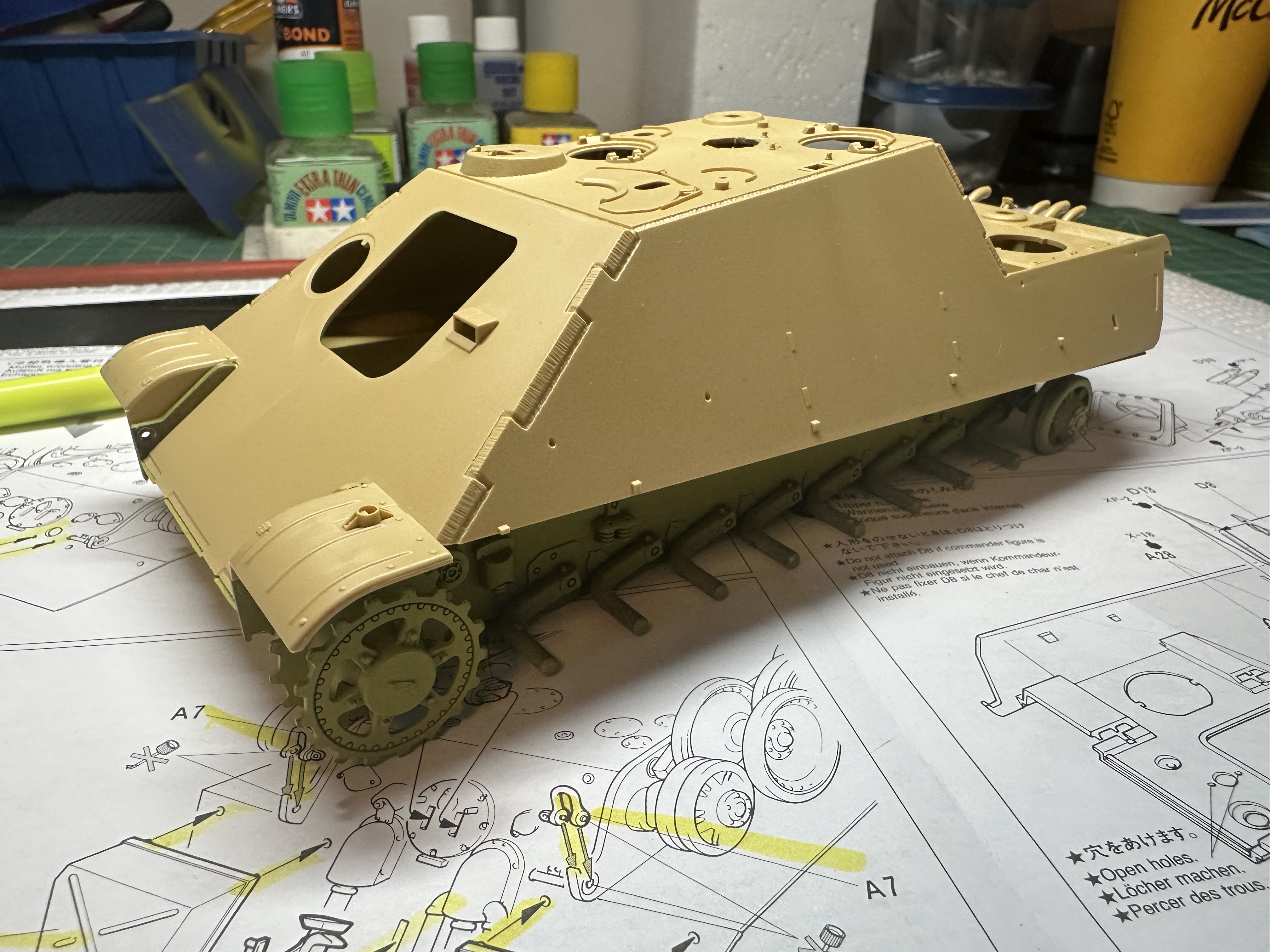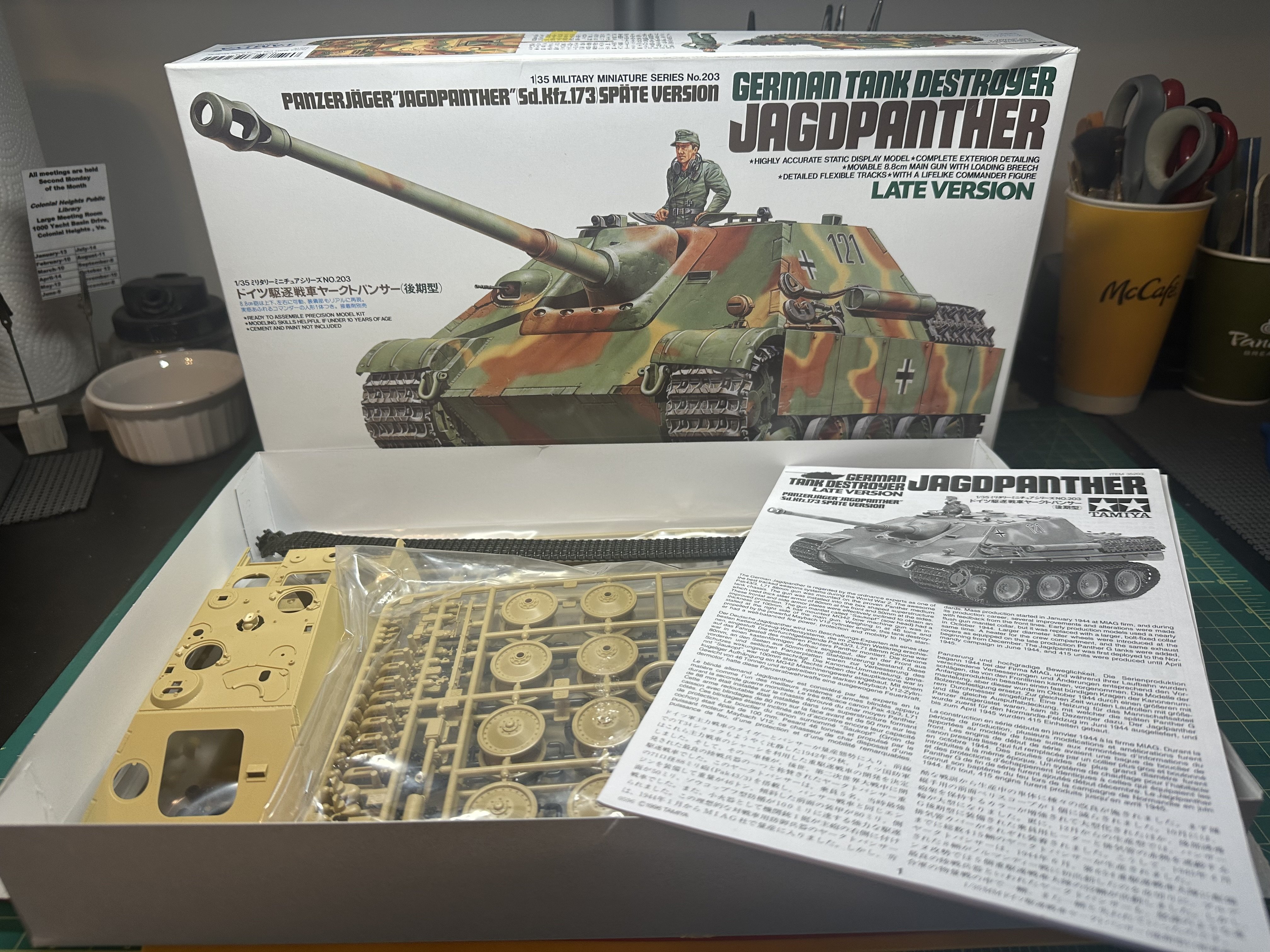 Tamiya 1/35 Jagdpanther Late Version build thread (1/29/26). Winter GB! The German Jagdpanther Late Version (often representing the G2 variant) was a formidable World War II tank destroyer built on the Panther chassis, featuring a powerful 88mm PaK 43/4 L/71 gun. Late versions, produced from late 1944 to 1945, included features like a one-piece gun barrel, simplified engine deck, and sometimes lacked Zimmerit coating It served on the Eastern and Western Fronts. During the last stages of the war, limited German production resulted in small production numbers, shortage of spare parts, and shortened crew training periods of increasingly young operators.