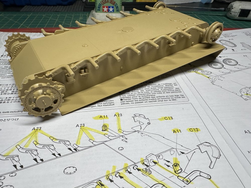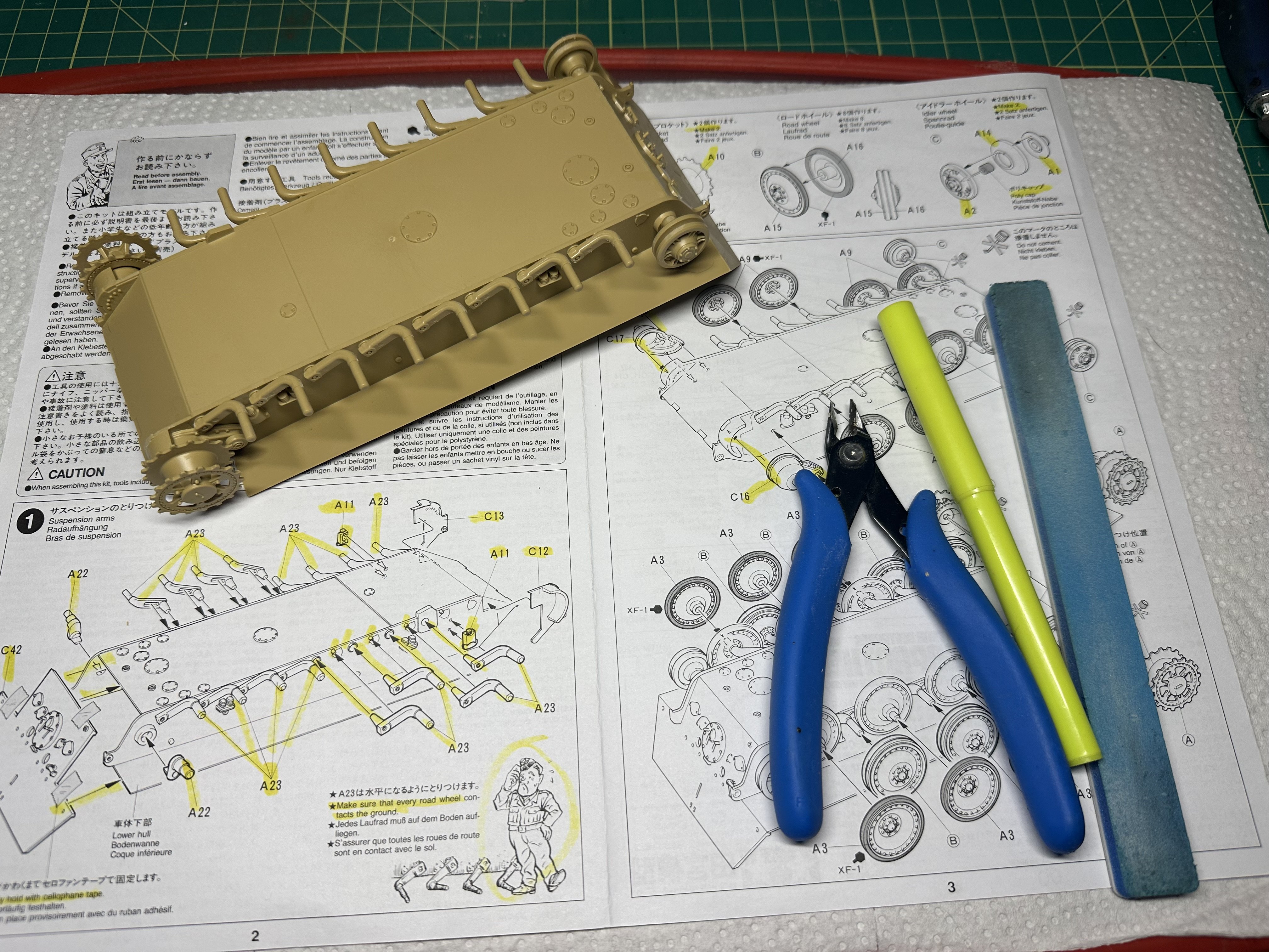 And we’re off to the races!!! Complete step one constructing the lower hull, suspension, drive sprocket and ideal wheels!!! I’ve built this kit before so it’s like revisiting an old friend!! -