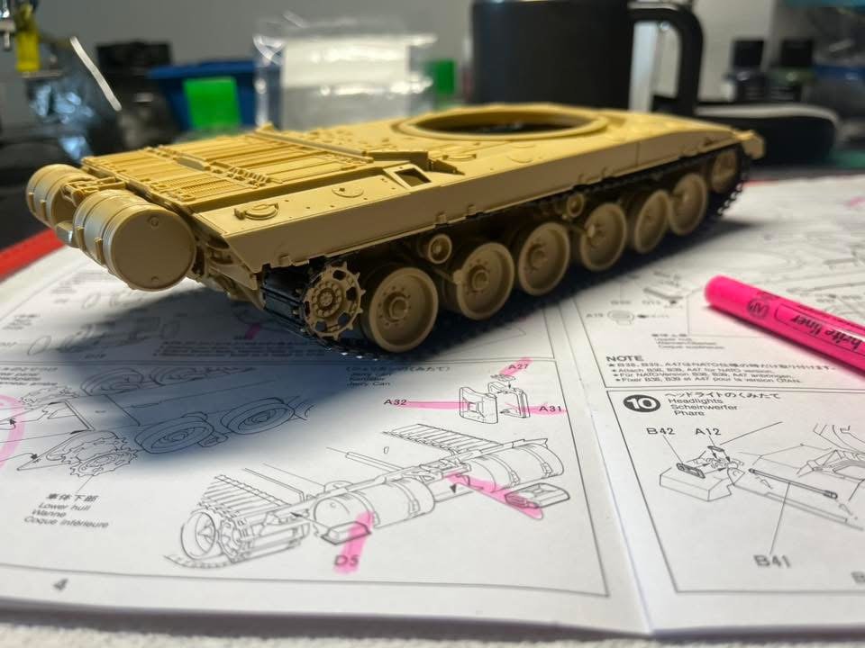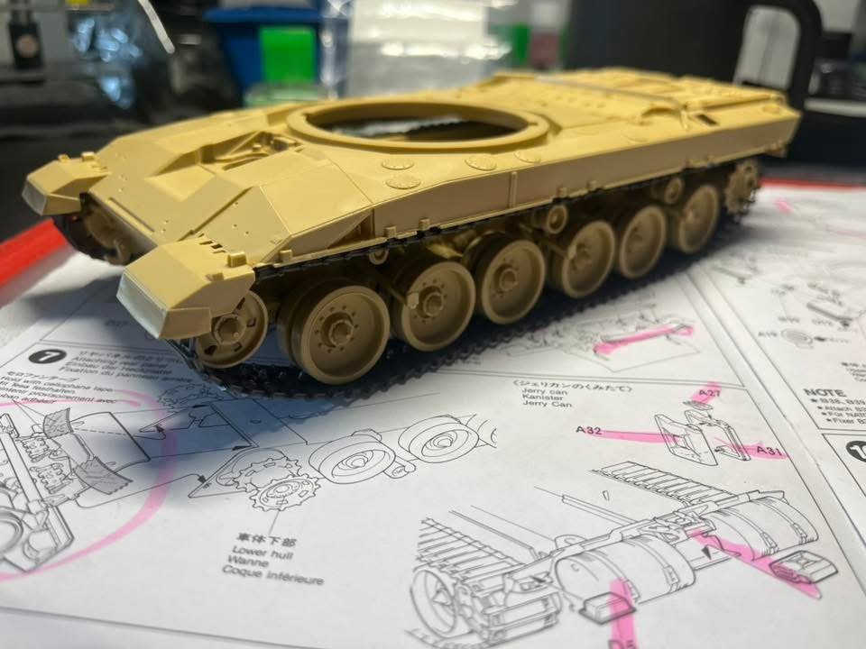 More nerd model building before tackling a few RV projects this afternoon. Added a bit of track sag that can be seen under this missing side skirts, assemble 16 spare track sections that will be mounted to the turret sides and finally primed the tank commander figure. -