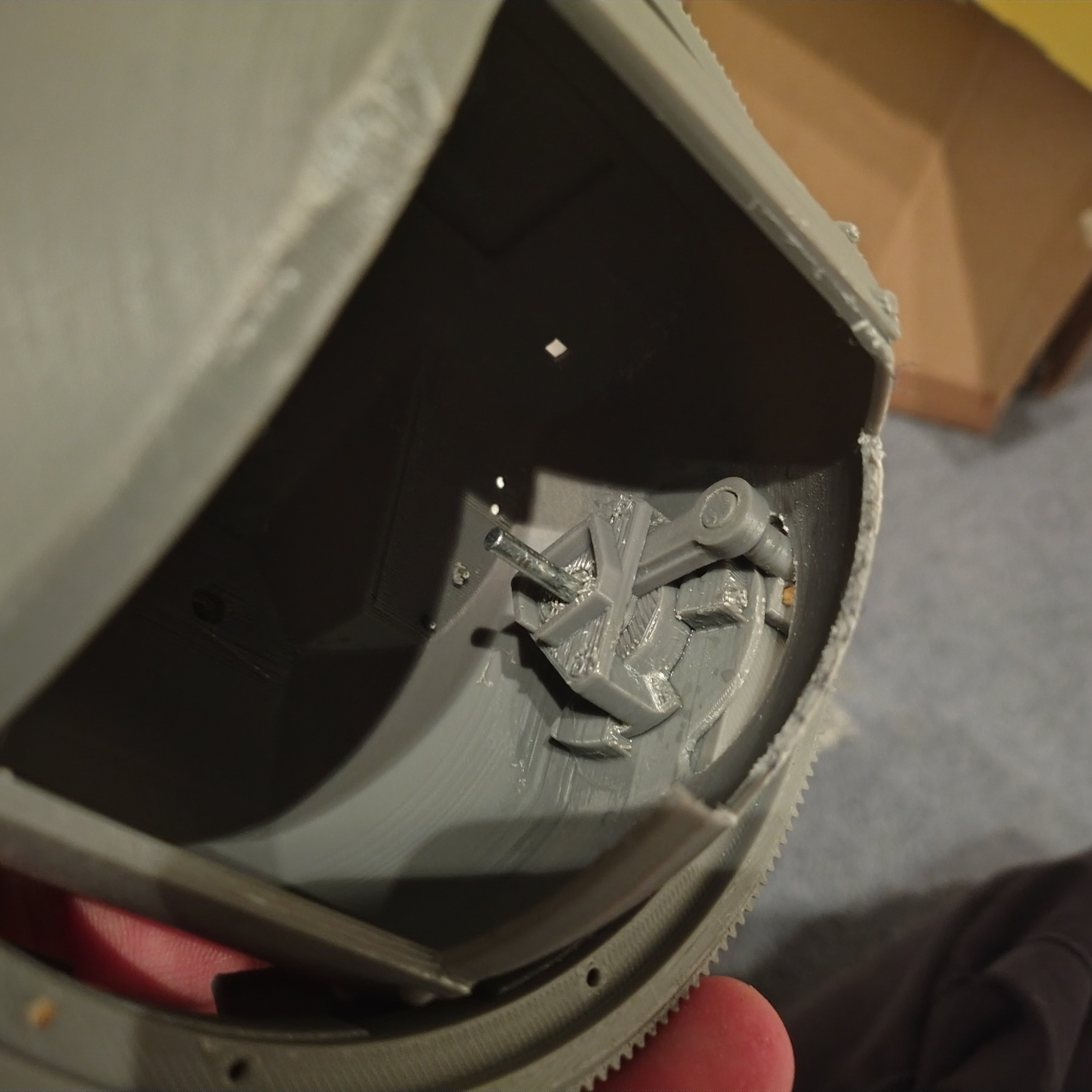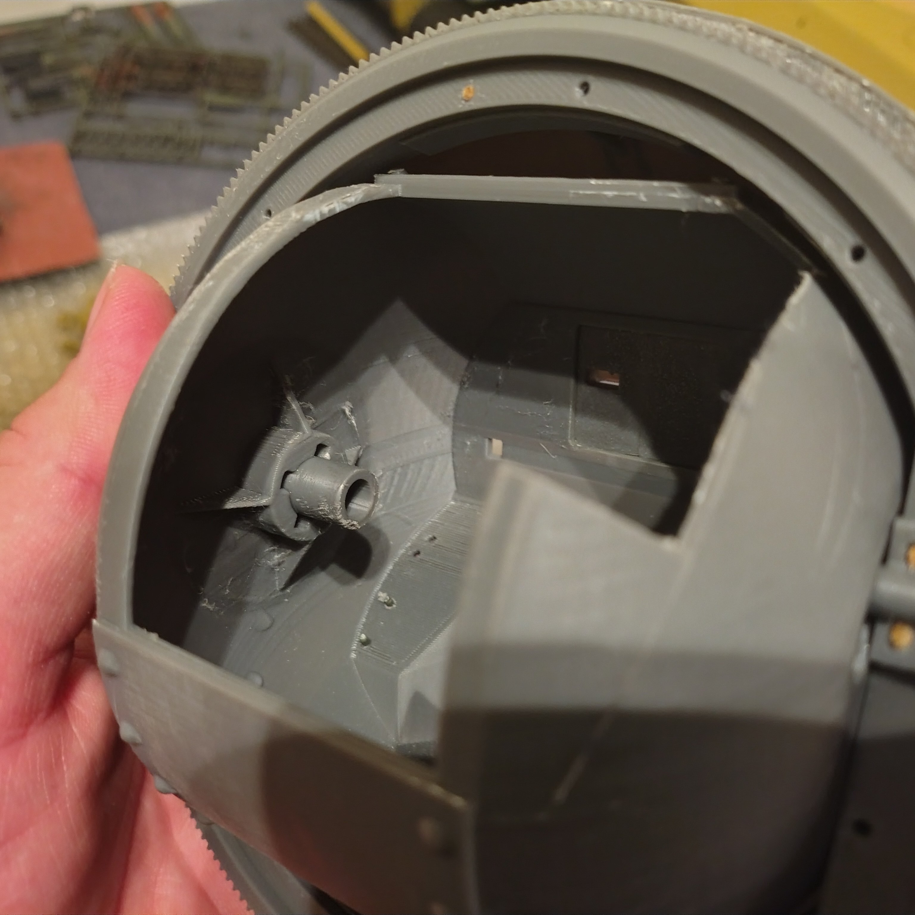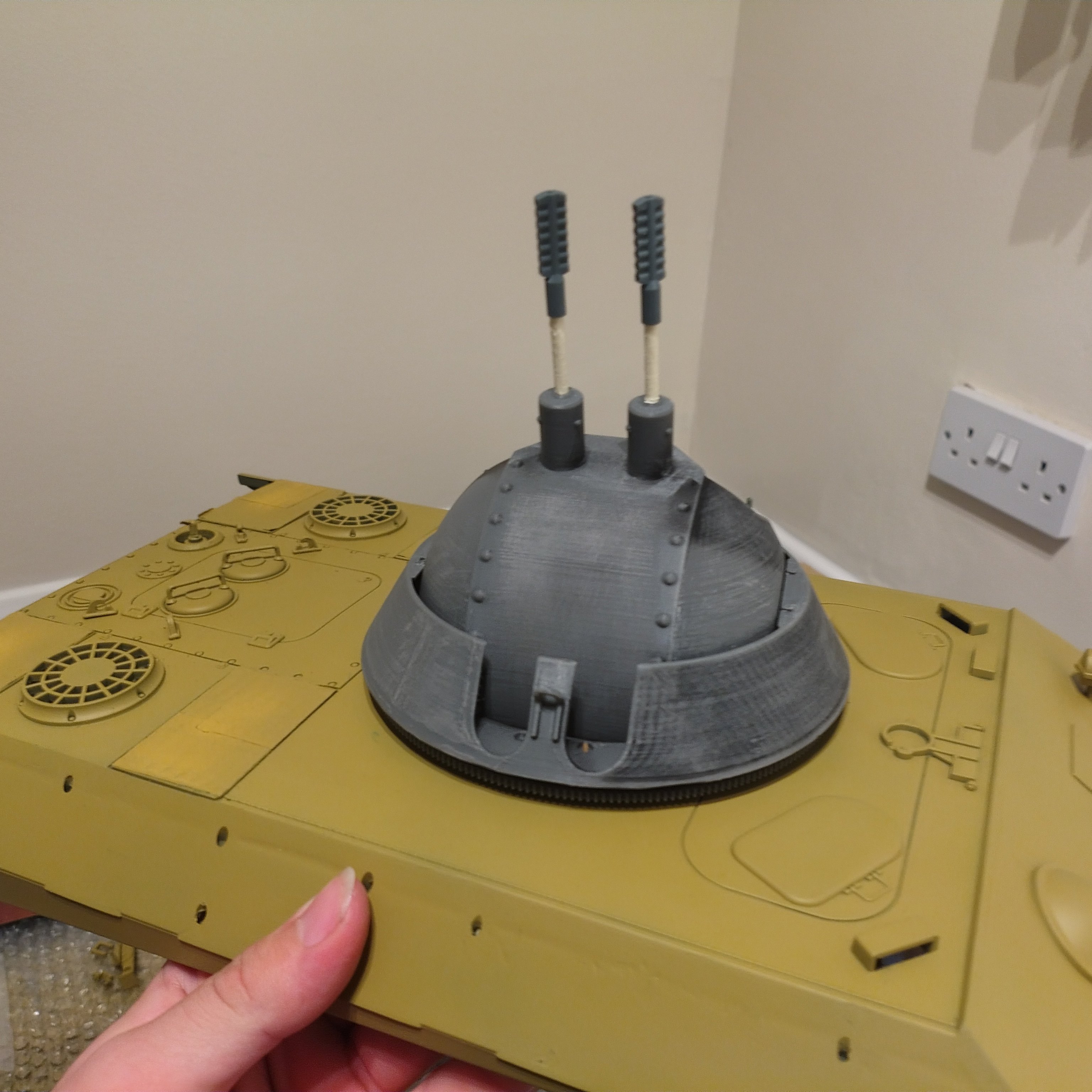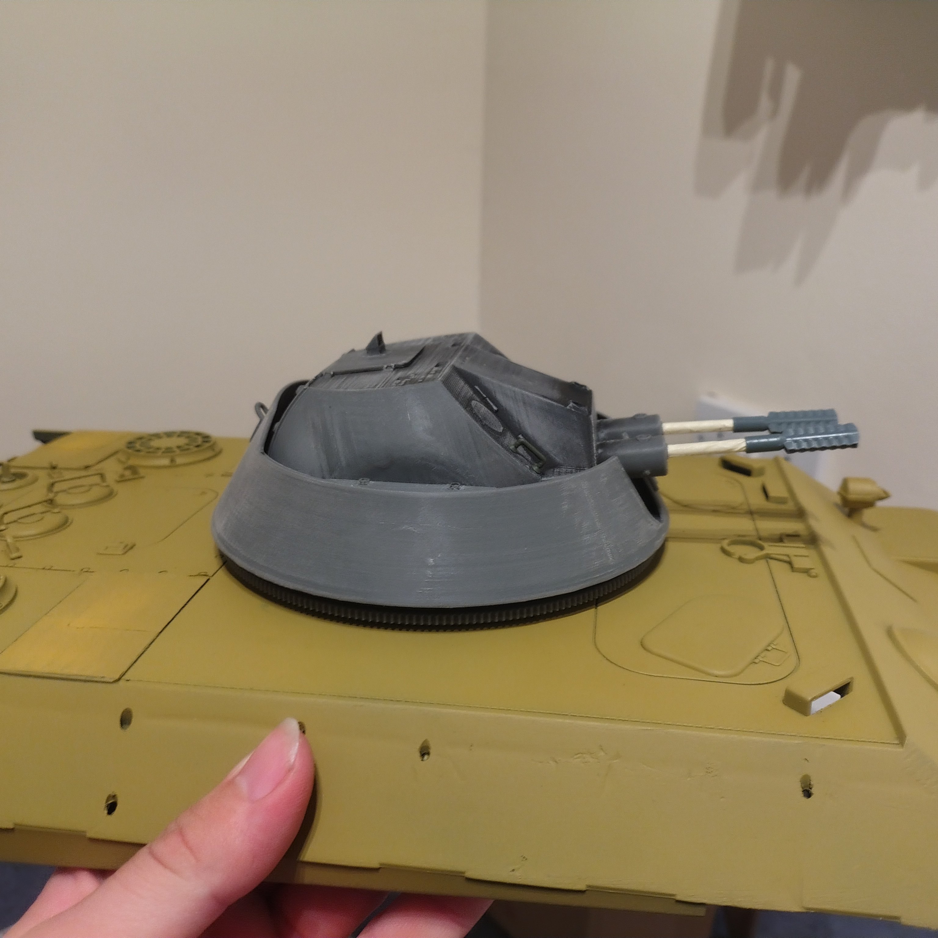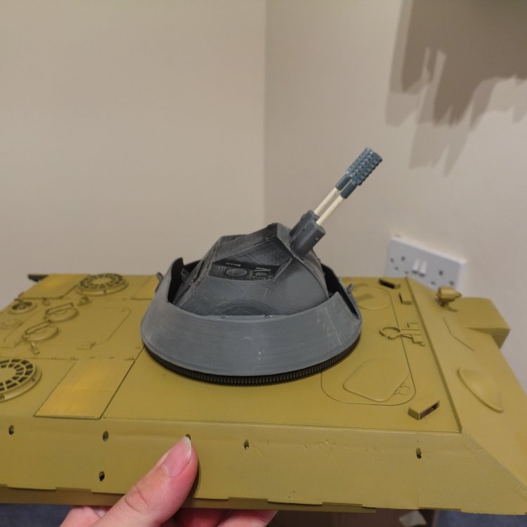 After a busy week I got some time to work on this monstrosity. I have worked out how to modify the existing elevation and depression gearbox to work with the new turret. Still got some bits to do on it but getting there now. The mechanism is deceptively simple. The pin sticks through the side of the turret and connects to the metal bar going through the support that locks into the side of the turret. As with the other side these 2 parts that lock in also provide the pivot point for the central part of the turret. As for the gearbox that's now going to have the metal bar fixed into were the drill bit is on this image and also be assured inside the turret onto the shiny metal shaft you can see in the image above.When all this is in place what should happen is when the motor receives the signal to move one way or another it doesn't actually turn anything instead it moves around the central axis (drill bit in the image and shiny metal bar in the first image) rotating whatever is attached to it. (Hopefully). Also got some added details that have arrived. And now been painted along with some nice little bolts. And lastly. Here's the upper hull shows with the turret sat ontop of it. This won't be how it sits when finished as the rotation gear is also attached under it were as when finished it will be inside the hull. -