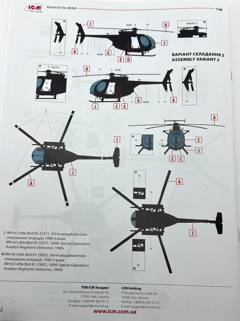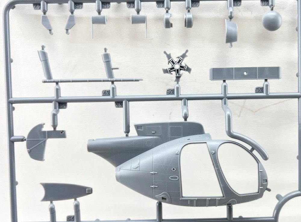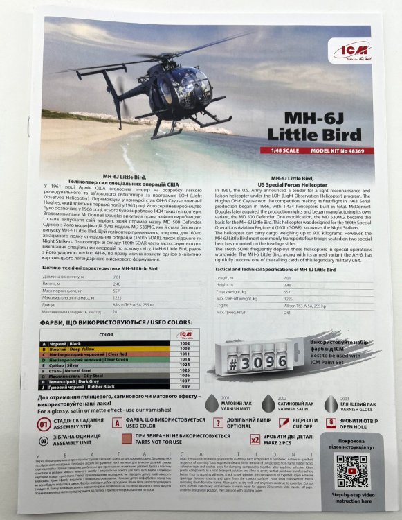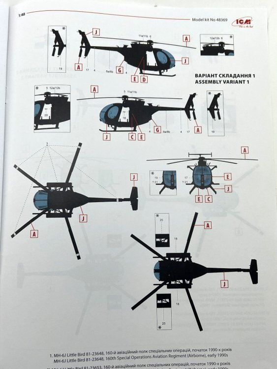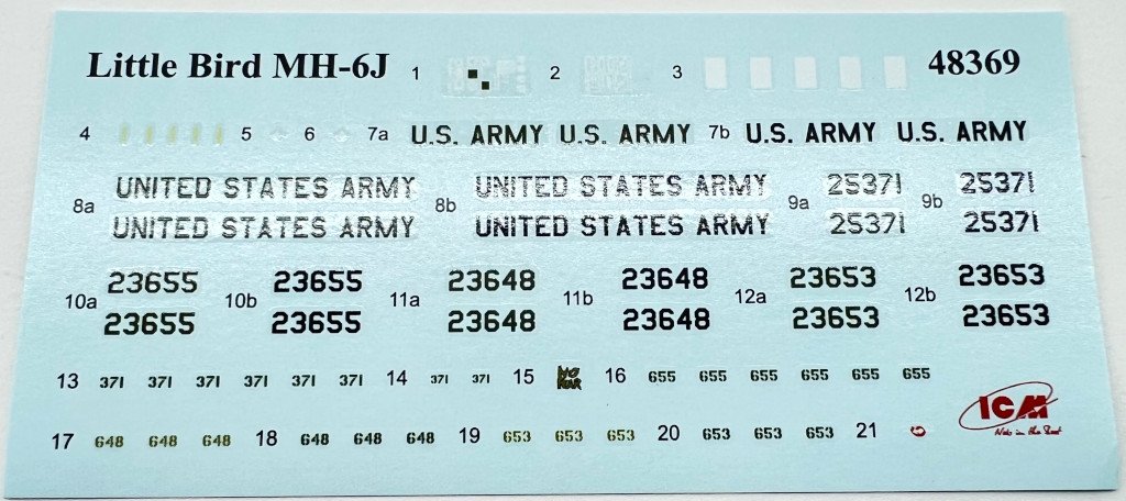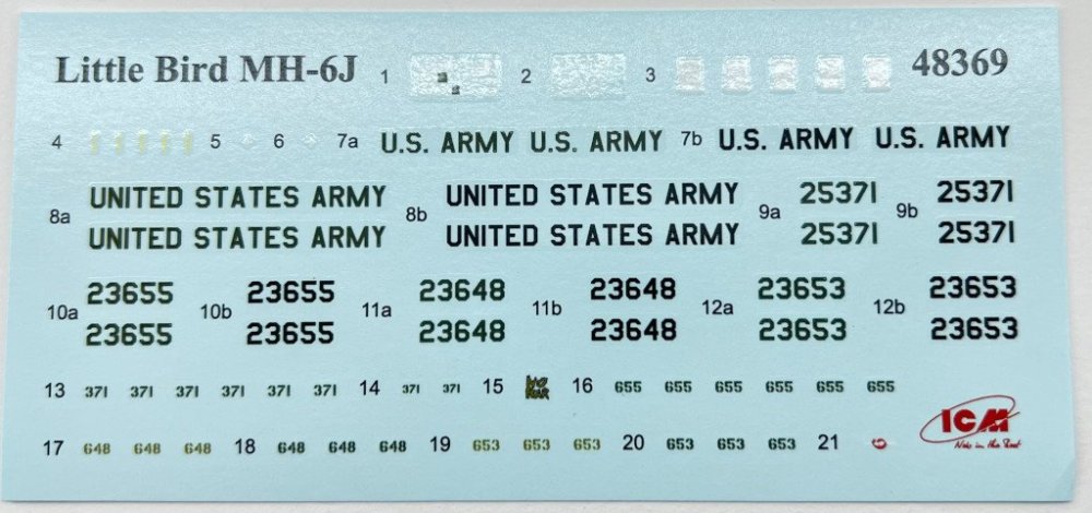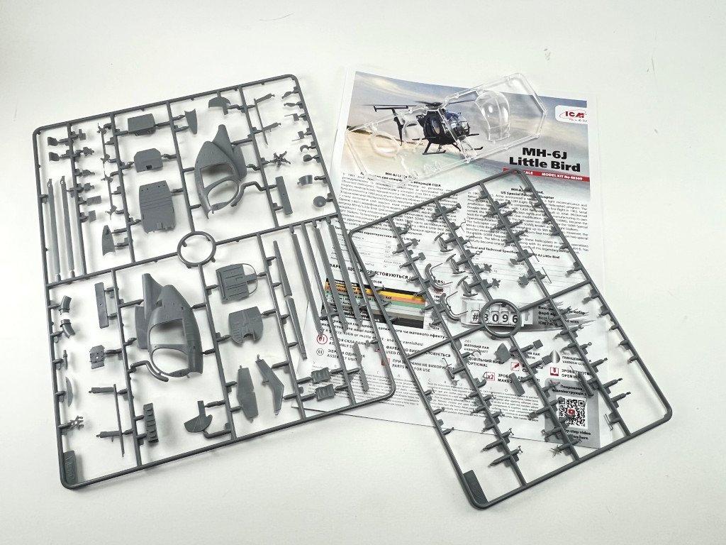ICM 1:48 MH-6J Little Bird US special Forces Helicopter Ref: 48369 Price Tag : 31,20€ Available here Introduction The MH‑6J Little Bird is a specialised variant derived from the Hughes/MD 500 family, originally developed under the 1960s LOH program and later refined to meet the needs of the 160th Special Operations Aviation Regiment (SOAR), the famed Night Stalkers. Designed for rapid insertion and extraction of special forces, it combines compact dimensions, exceptional agility, and the ability to carry operators on external benches, making it ideal for discreet missions in complex environments. These characteristics have made the Little Bird an icon of modern special operations—and an especially appealing subject for scale modellers. In terms of modelling offerings, since the 1980s Hasegawa, Fujimi and Academy / Minicraft, have released several kits of the Hughes 500 family, mostly covering the early OH‑6 and MH‑6 variants of this versatile light helicopter. However, the more recent iterations of this little “bird” have long been overlooked—until this new release from ICM, which finally provides a modern, well‑detailed tooling of this specialised version. What’s in the Box Inside the box we find two (!!) grey sprues and one sprue with the clear parts, for a total of 147 parts, plus an instruction booklet, a decal sheet, and an ICM colour chart. I must admit that when I first received the box, I was expecting something… well, larger 😊 — but great surprises often come in small packages! My first impression was indeed: so few parts? 😄 Two sprues! A more detailed inspection quickly confirmed my expectations. The fuselage comes with recessed panel lines and raised rivets, exactly as it should. The layout of the parts allows for a quick and straightforward build. One detail that stood out while reviewing the instructions: out of all the parts, only two are not used in this model! Quite unusual! 😄 Sprue A This sprue provides the main structural elements of the model. The fuselage is supplied in two longitudinal halves (left and right), and the external detail immediately stands out: recessed panel lines for the engine covers and maintenance access panels and raised rivets and reinforcement plates with the correct size and definition for a compact kit like this. The main structural cockpit components are also present, such as the floor and the firewall separating the cockpit from the transport area. Avionics and flight control components are included and display very good detail, which will stand out beautifully once painted. The seats do not include moulded-on seatbelts. One must scratch-build them or use aftermarket replacements. The tail is moulded as a separate piece, which eases assembly and handling, and can conveniently be added after painting. The tailplane is provided in four individual parts, each featuring subtle raised reinforcement plates. No engine is included — only the exhaust nozzle. Sprue B This sprue supplies the smaller components that complete the model. Here we have various antennas and external avionics/communication boxes. All the components for the main rotor are included here, providing an accurate representation of this critical part of the helicopter. Additional small cockpit parts are present, such as pedals, cyclic sticks, and engine collective controls. An interesting and original detail is the inclusion of door handles (both interior and exterior). One of the build options allows the model to be displayed with or without the cockpit doors. Sprue G This small sprue contains the clear parts, which are free from distortion and scratches. The photos do not do justice to their quality. The large, slightly concave front windscreen immediately stands out and fits onto the nose section. The front doors and various navigation lights make up the remaining pieces. The framing detail is excellent, with raised rivets that look fantastic once painted. For those who prefer to cut their own paint masks, the raised frames will greatly ease the process. Decals The small decal sheet provides markings for four aircraft, all belonging to the 160th SOAR Two stencil options are included for each aircraft: buzz numbers and U.S. Army identification in black, or in olive drab. Instrument panel dials are included (separate, without background). A small “no fear” inscription is supplied for one aircraft, to be placed on the nose. The rest of the stencils are generic. White rotor-blade stripes are also provided as decals. The quality is in line with ICM’s usual standard, with good colour saturation, minimal carrier film, and sharp printing. Instructions As typical of ICM, the A4 booklet with 12 pages presents the assembly 67 steps clearly and without ambiguity, making it easy to follow. The first page lists the colours needed for the full paint scheme. Marking Options As noted earlier, four marking options are included — all aircraft from the 160th SOAR, circa the 1990s, and all painted in a single dark shade (a greyish black) with low-visibility markings appropriate for the stealthy role these aircraft performed. Conclusion This is a small but excellent model of an iconic helicopter, immortalized in the film “Black Hawk Down”. The simplicity of the parts makes it appealing both to beginners and to experienced modellers. Without doubt, this new kit of this compact helicopter will surely lead to other versions in the near future (hopefully!), such as armed, naval, or even civilian variants. Until then, we have this little modelling gem — highly recommended! My thanks to ICM for providing the review sample!