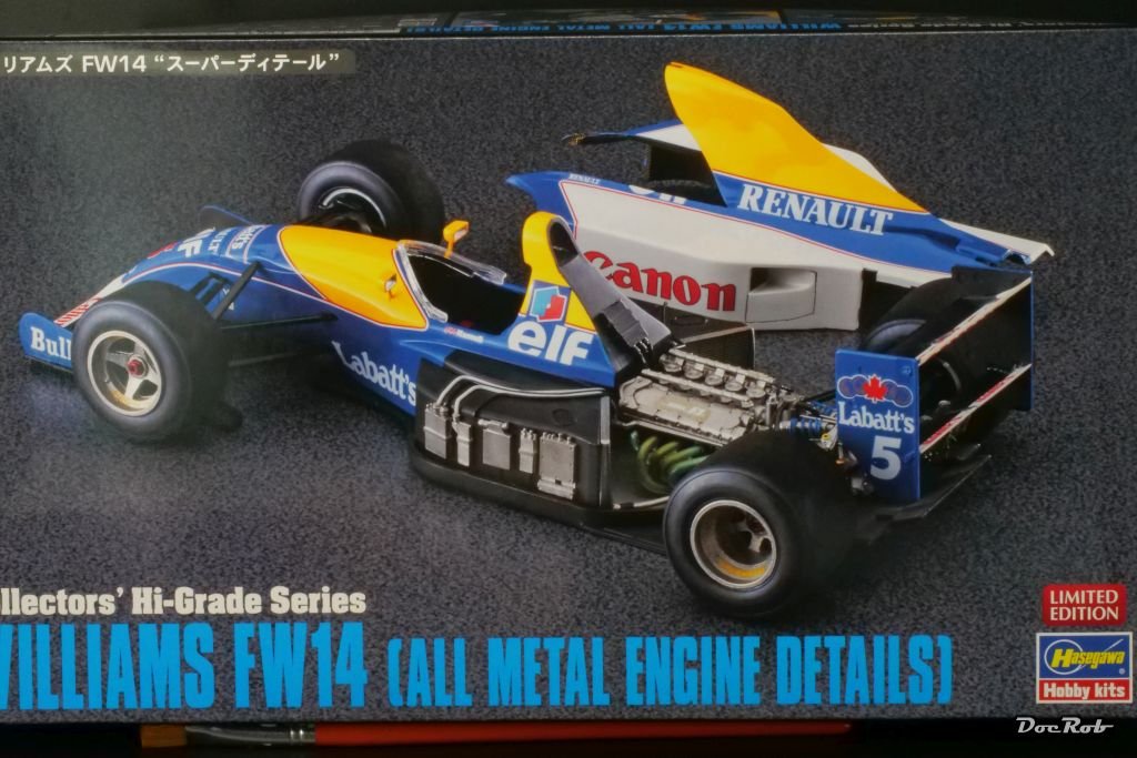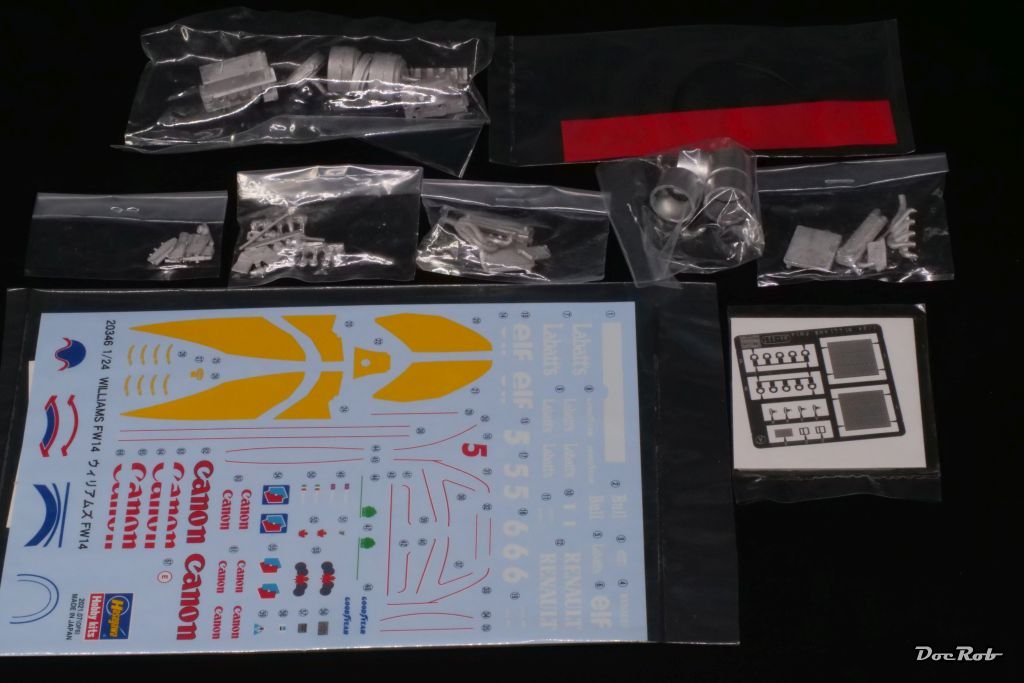 Got this little beauty along with some tools from Japan. It´s the "all metal" version of the Williams FW14 from Hasegawa in 1/24. All metal means, that the engine, exhausts, rims and other accesories are made from cast metal, the outer rims are turned aluminum and there is some PE included and some material for fabric seat belts.