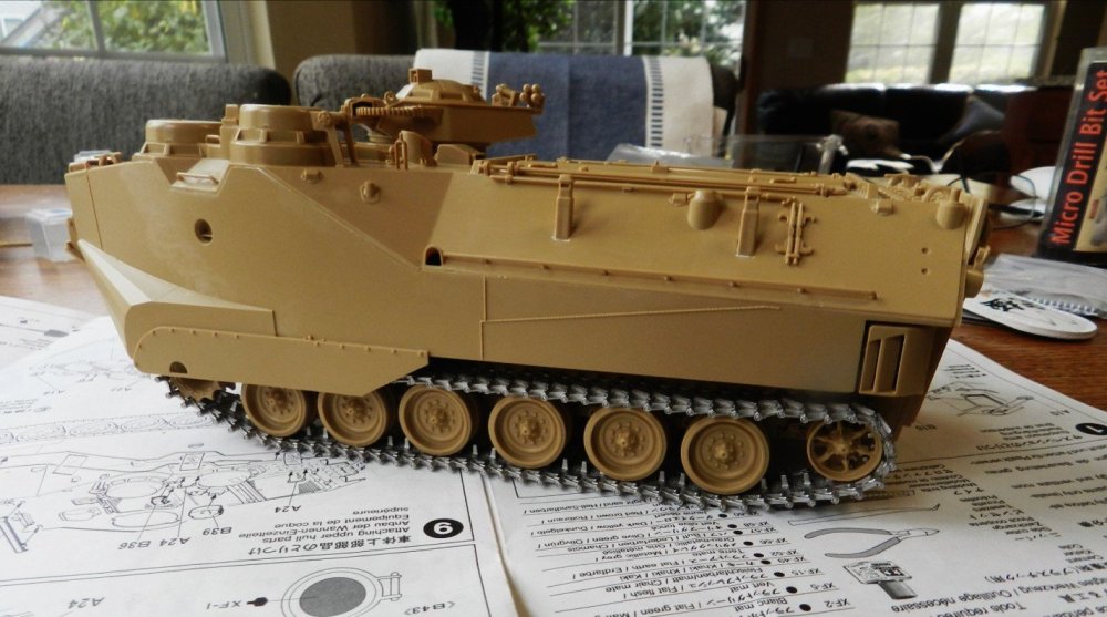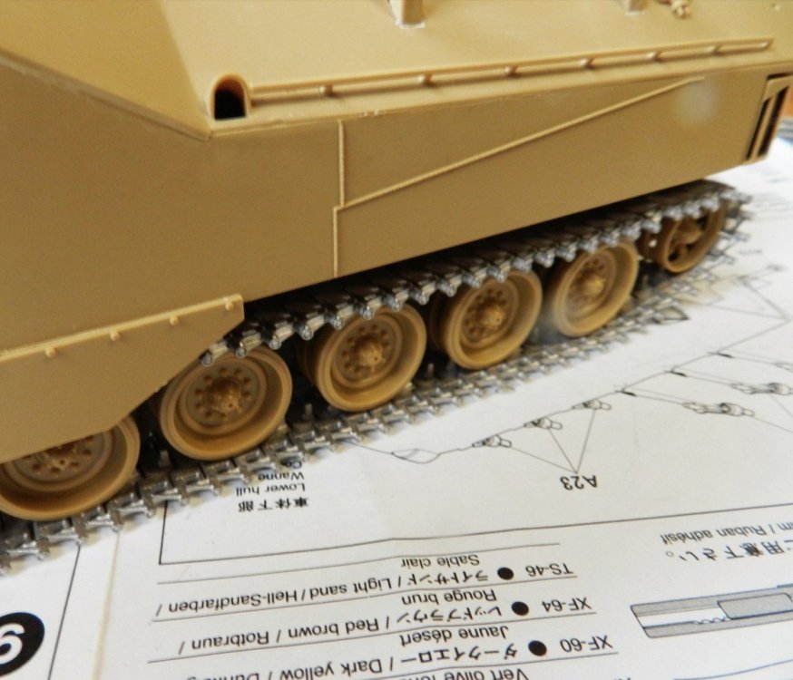 Been working on this.....Tamiya AAVP7A1. Assembly done. Putting a set of Friulmodel tracks on. I had to modify the kit's sprockets by inserting a styrene disc inside the sprocket halves to widen the distance between the teeth to fit the tracks.......It worked pefectly😀 I finished one side. I also still have to paint the H 39 I posted last time The tracks are Friulmodel ATL-78. Same as the early M2 Bradley. -