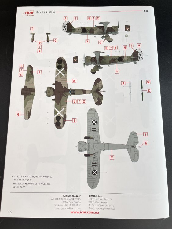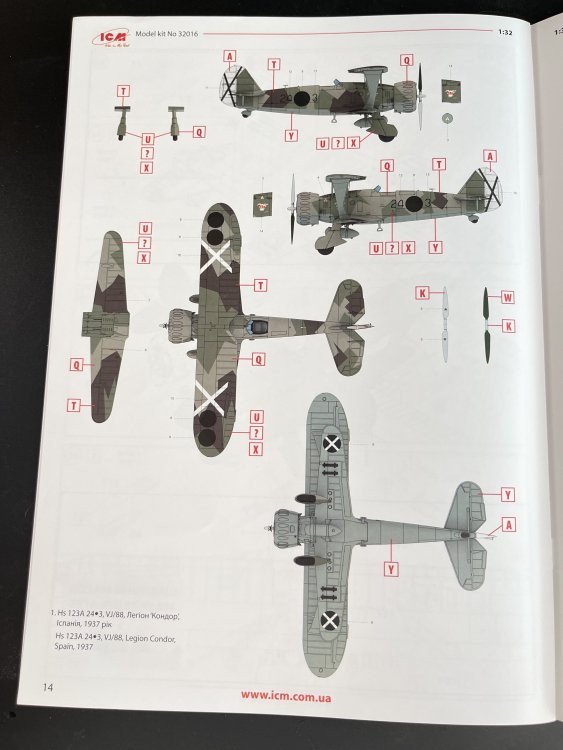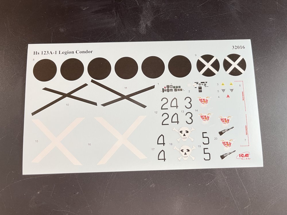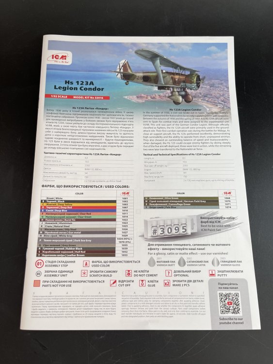 1:32 Henschel Hs 123 Legion Condor ICM Catalogue number 32016 Price: around 53,99€ The Henschel Hs 123 was a rugged German biplane dive bomber and close air support aircraft developed in the early 1930s, entering Luftwaffe service in 1936. Despite its dated biplane design, it excelled in maneuverability, short-field operations, and survivability during low-level attacks, seeing combat in the Spanish Civil War (as the "Legion Condor" variant), the one that we are reviewing here, the invasions of Poland and France, and extensively on the Eastern Front until 1944. Production ended in 1938 after about 1,100 units, but its simplicity kept it relevant. ICM release now the early version, that was present in the Legion Condor. We, at Large Scale Modeller, already reviewed the Late version here. Both share identical sprues (about 200 parts in medium grey styrene, plus clear parts), differing only in decals, instructions, and minor optional parts for historical accuracy, as the headrest. The kit arrived in ICM's sturdy, lift-off-top box with attractive artwork, please Revell, do it as well. Inside the box, eight grey sprues (A–G, with F duplicated for undercarriage/bombs), one clear sprue, a single decal sheet, and a 20-page A4 instruction booklet. The plastic is in gray color, a bit soft on touch, So, on the sprue A we got fuselage halves with excellent panel line detail, no rivets, upper front decking, external fuel tank. Sprue B and C, the Upper and lower wings with one-piece lower wing with flaps and separate ailerons/elevators for posing. The wings also have some really nice surface detail. Now the sprue D brings control surfaces, optional early/late hinge mounts, with the subtle internal structure details. As for the Engine, everything is in the sprue E and also for the cockpit. You got the BMW 132K radial engine (detailed cylinders, separate exhaust stacks, valve covers, and triform cowling braces) and tailplane. The engine cowling is supplied in nine parts. I personally don’t appreciated so many parts on the cowling but it`s probably the only way to open it to display the engine. Here you also find the headrest used on the late version. Concerning the cockpit, two instrument panels are included with raised detail to simulate instrument placement. You can choose if you want to paint or decal. The OOB cockpit detail is quite good as all ICM release with a minus, the seatbelts. There are none on the box and the seat don’t have them engraved. The sprue F comes in duplicated as it bring us the undercarriage legs, wheel spats and bombs. As for the G sprue, the final parts are the struts (as this is a biplane) for the cabane and interplane. These structs are quite thin and well-ejected. Here we also find some smaller detail like a flare gun, engiens exhauts, cockpy stic, elevatores etc. The decals, as usual are very good in color saturation, solid color, quite thin and perfect registration. All three options, all in pre-war RLM 61/62/63 splinter over 65: 1. Hs 123A "24 3" VJ/88, Spain, 1937 2. Hs 123A "24 4" VJ/88, Spain, 1937 3. Hs 123A "24 5" VJ/88, Spain, 1937 The Clear parts As usual are pristine and very clear with no distortion at all. Also in this clear part, of course, the wingtip nav lights. A masking template of the windshield is given. In this model, is a minor job and not hard to do. The instructions. The usual standard from ICM with a booklet with the first and last page in satin paper and the rest in normal paper. It has 70 building steps with exploded views, color call-outs (ICM paints only). Its quite clear and easy to follow. A side note for the engine assembly and those eight cowling parts, as take your time with dry fit and alignment of all parts. The color table chart only have ICM paint range so you can get the full range at Art Scale Kit Anyway, the instruction manual is detailed and easy to follow. It includes step-by-step assembly diagrams, color callouts, and decal placement guides. Conclusion ICM's 1:32 Henschel Hs 123 is a beautiful model kit, with very good detail out of the box. I really love the painting of the Legion Condor. So, if you like Legion Condor, 1:32 scale and biplanes you must get one of this beauties VERY Highly recommend this to intermediate modeler My thanks to ICM for making this fantastic model.