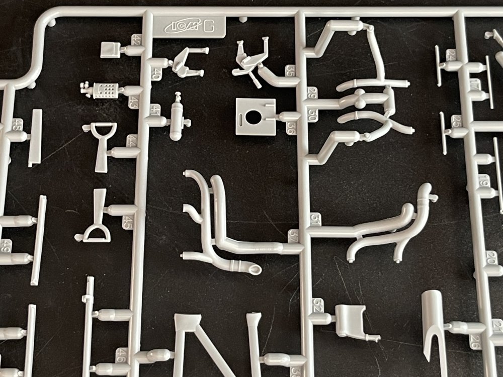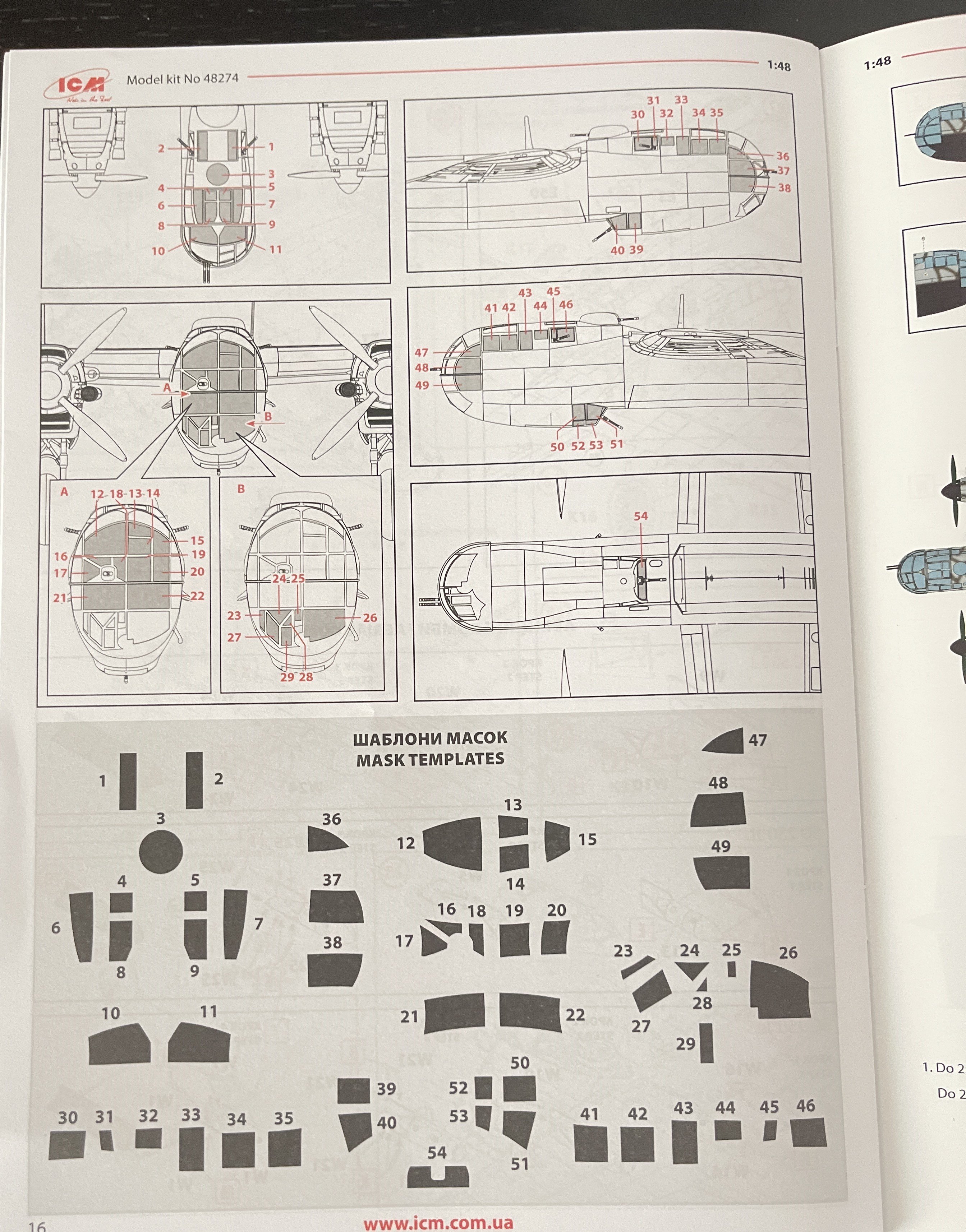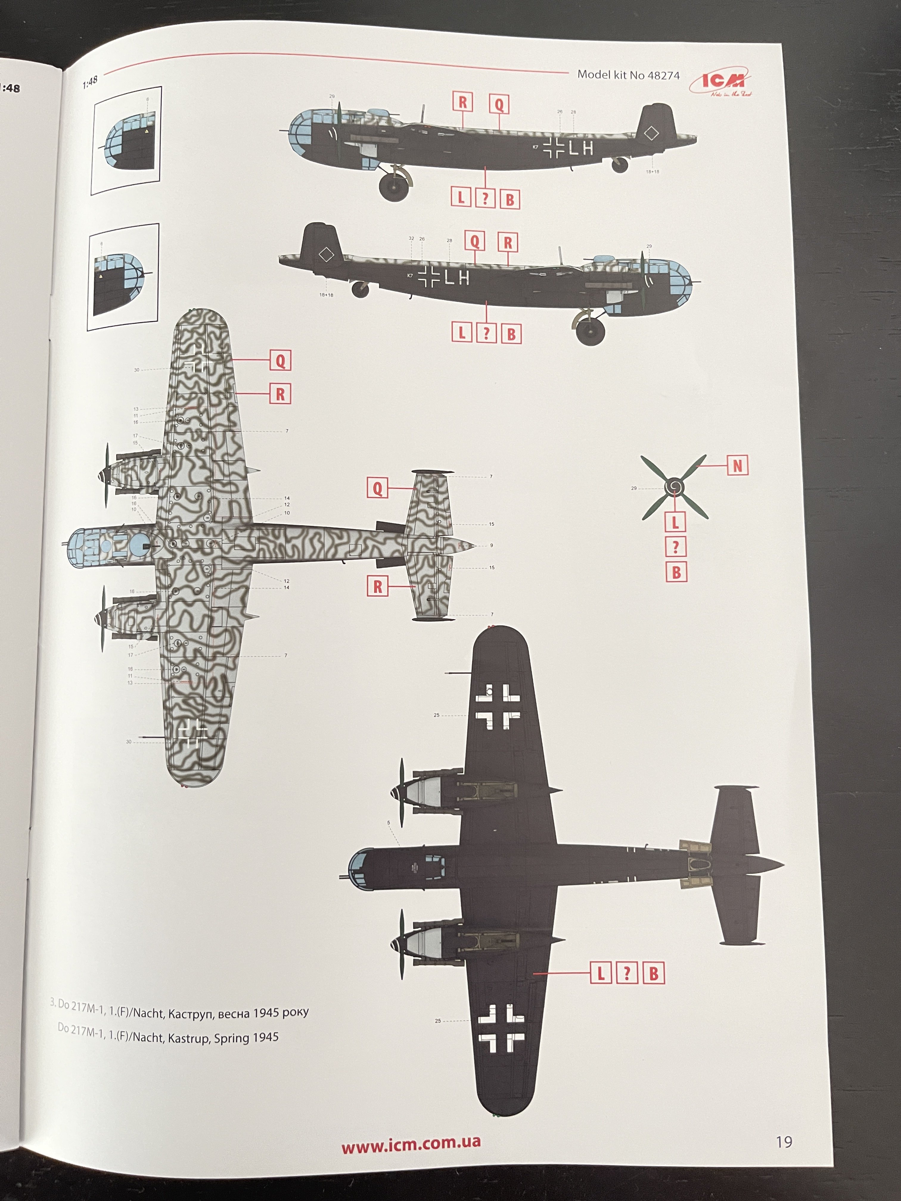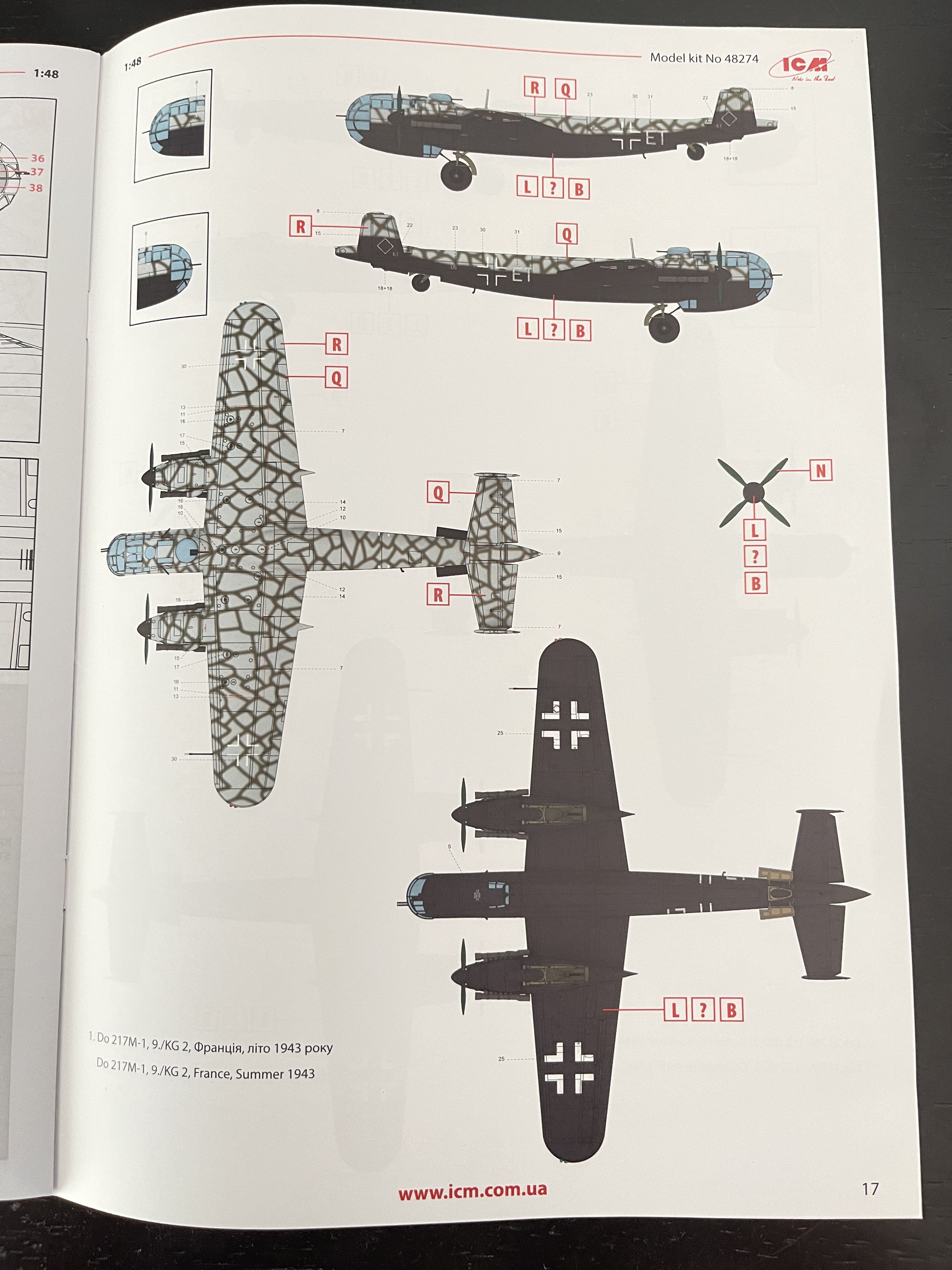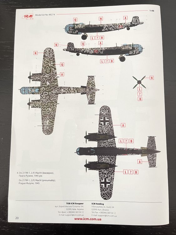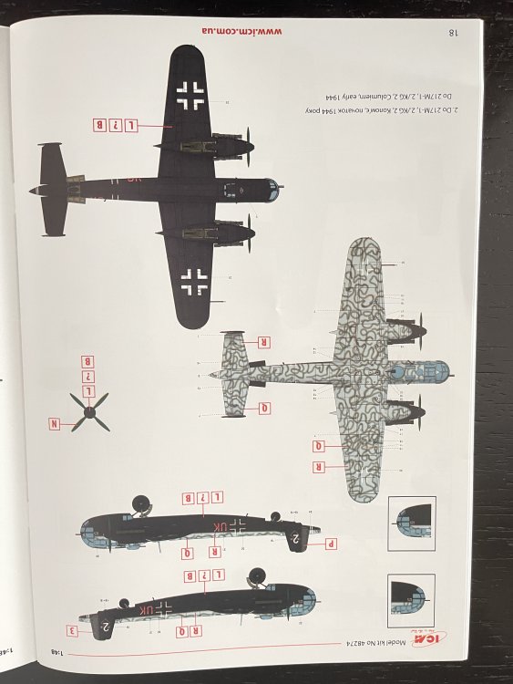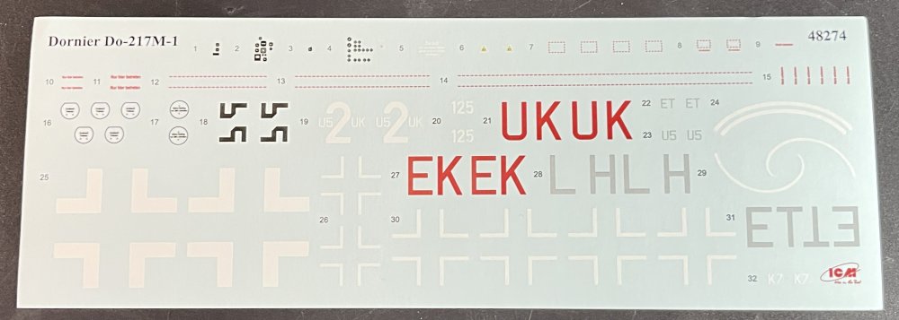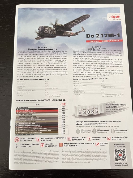 1:48 Dornier Do-217 K-1 ICM Catalogue number 48273 Price: around 64,95€ The Dornier Do 217 K-1 was a German medium bomber developed during World War II as part of the broader Do 217 series, which evolved from the earlier Dornier Do 17, known as the "Flying Pencil" for its slender fuselage. The Do 217 K-1, introduced in the autumn of 1942, represented a significant advancement over its predecessors, incorporating a redesigned, aerodynamically streamlined nose and cockpit to improve performance. The Dornier 217 K-1 was a German WWII era medium bomber, developed from the previous Do 217 E medium bomber series. Unlike the previous Do 217 E, the Do 217 K-1 nose and cockpit was redesigned and aerodynamically streamlined, resulting in lower drag and higher speed. The crew of five was sitting inside the new fully glazed canopy. Compared to the Do 217 E the defensive armament was redesigned as the forward firing 7,92 mm MG 15 machine gun was replaced by twin MG 81 7,92 mm machine gun and the rear facing MG 15s were replaced by a single mounted MG 81. The offensive armament was removed. Maximum bombload of 4000 kg of bombs either in bomb bay or on external racks under the wings remained unchanged, although a single SC 1800 bomb could now be carried inside the bomb bay. The first Do 217 K left the factory in September 1942 and served throught the war as night bombers and against enemy shipping. The Do 217 is faster than most of other bombers it will meet in battle, being capable of taking out up to four bombing points when utilizing the Flamm C250 incendiary bombs or up to four bases utilizing the four SC 1000 bombs, depending on the maximal battle rating of the said match. Do 217 K is also very capable due to its heavy bomb load and the powerful SC 1800 bomb containing 1000 kg of TNT eq. and 30 metres wide destruction radius. Do 217 can also be used in naval battles as it comes equipped with a pair of F5W torpedoes with 3 km range and 300 kg TNT eq. However these might prove hard to use as the Dornier have to slow down to sub 301 km/h making it an easy target for the naval gunners. Despite being a bomber, the Dornier is also quite maneuverable with maximal structural limit being 700 km/h.[1] Just a brief history for a very well know aircraft. So, let`s crack the box to check one of the most wanted and eagerly awaited model of the year of ICM catalogue. The usual ICM flip top cardboard with a separate card lid showing the artwork. I like ICM artbox, they are quite good. Not my favorites but I like them. Inside you have sprues separated in two plastic bags and the clear parts in another bag and full protected. Opening the box, you get a total of 13 gray branches and two clear branches. The clear parts are individually packaged in protective bags. There is a lot of parts in this box that you will not use. The C and D sprues you will use less the 30 % of it. There are also same parts for the night version, that I check the instructions of it (as I don’t have the J version). Is the sprue H for engines, cowlings, and propellers is exactly the same for their radial engines. But let’s check it all. The first big thing here is the clear parts. This version has its one clear parts (the sprue J) as that is obvious considering the huge front gondola and the upper canopy is also new. The clear parts are perfect! Even in this shape… As usual are pristine and very clear with no distortion at all. Sprue K is also completely new and brings the two new fuselage halves as the largest parts, including parts for the interior, the armament and the fuselage tail. As we have both fuselage for the night fighter and this version, we make a little comparation. As you can see, the new fuselage is shortened at the front to accommodate the new full glazing, and the rear can be equipped with two different versions. You get both fuselages. It’s a totally new mold for the fuselage. Kudos to ICM The cockpit is quite big and there’s a lot of glazing to see inside. So, straight from the box, you can get a good cockpit detail has you have in the box side consoles, small instrument panel with three-dimensional components. So, with some work, the decals and some carefully painting you can get a great cockpit straight from the box, excepted for the seatbelts. As usually, for the seatbelts you need to use some aftermarket seatbelts. The sprue W gives 500 and 250 kg bombs very well detail. Passing on a first general view, is a typical ICM quality plastic, with no distortion, no flash, with very good surface detail. On sprue A, the fuselage halves and tail. Well on this release, these fuselage halves are not used. Sprue B On this sprue, full span wings, with upper and lower halves. Really nice molding. A rivet counter could have some extra detail. Sprue C Mostly all parts on this sprue will not be used. This model will give a lot of extra parts to your spare box. So just a few parts of the undercarriage bay. Sprue D Two sprues in fact, with all the parts for the engine DB603A, propellers and engine nacelles, nothing used on this version that wear the BMW 801D (both with 1700hp each). Well, on this model kit, only the wheels, landing gear are the only parts to be use. Sprue E This sprue brings us the flaps, upper turret (and all its details) instrument panels, side cockpit consoles and undercarriage bay. As for the side cockpit consoles, will not be use as the cockpit detail for this one is on the new K sprue. The instrument panels are quite good in raised detail and you have a decal set for the instruments bazels. Sprue G It supplies the engine mounts and undercarriage fairings. The night fighter nose cone is no needed for the build. The instructions. The usual standard from ICM with a booklet with the first and last page in satin paper and the rest in normal paper. The color table chart only have ICM paint range and it start to make some sense (at least in Europe) as you start to have some online store that sell them as Art Sc