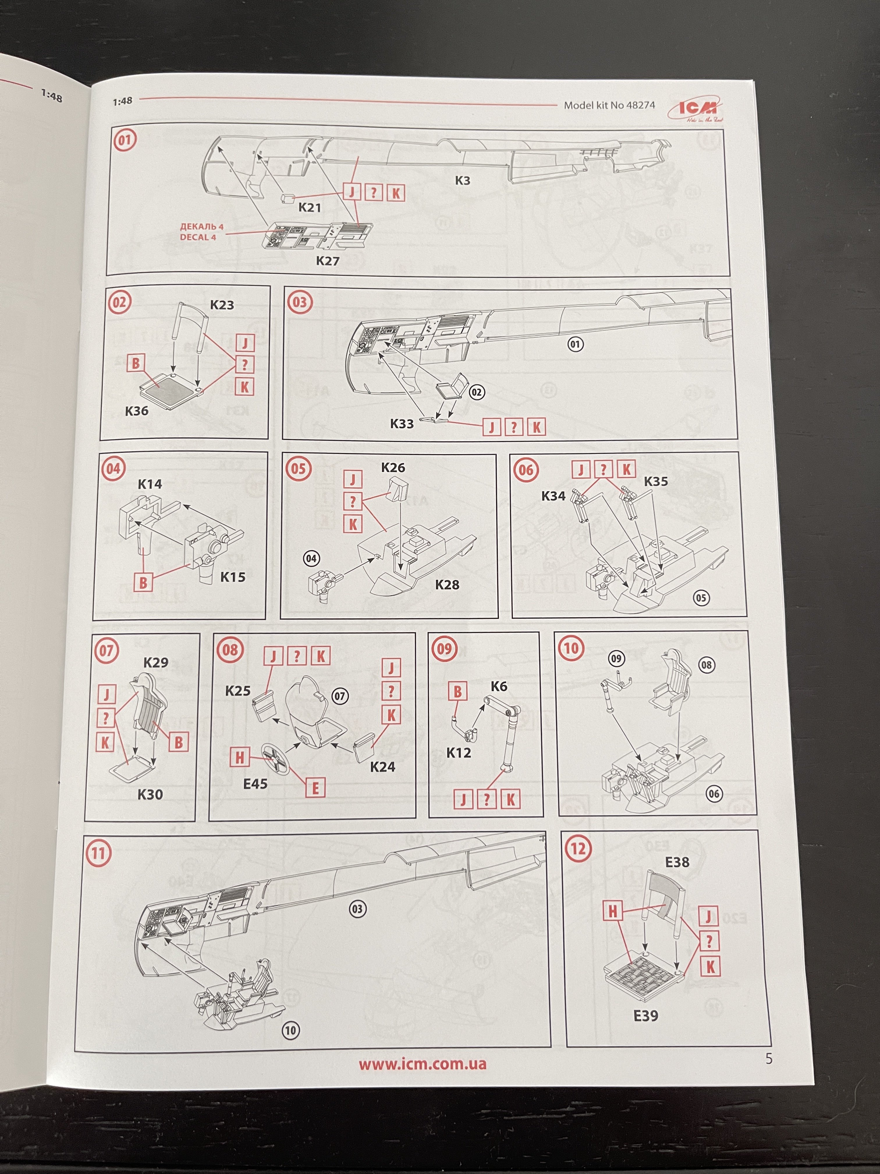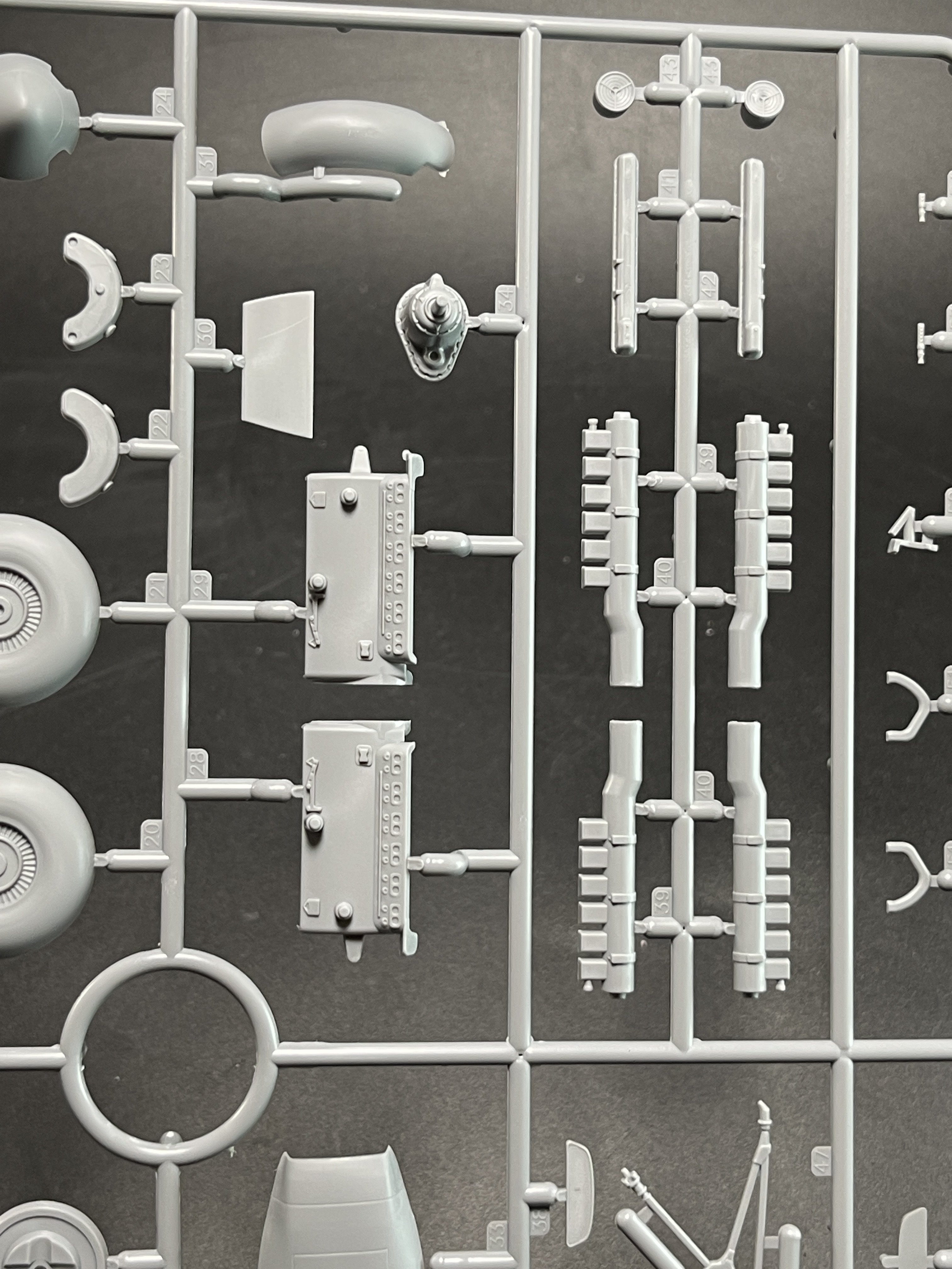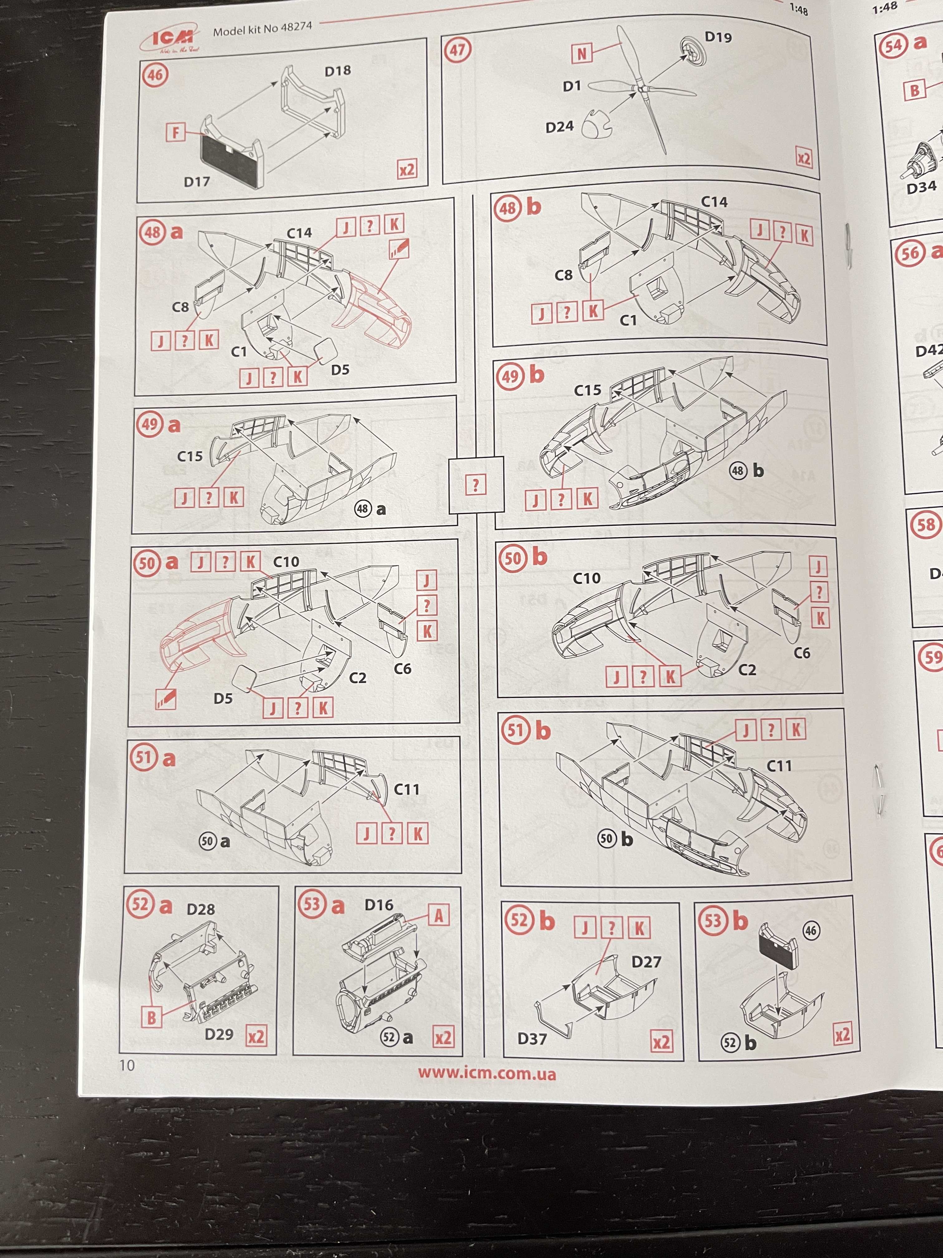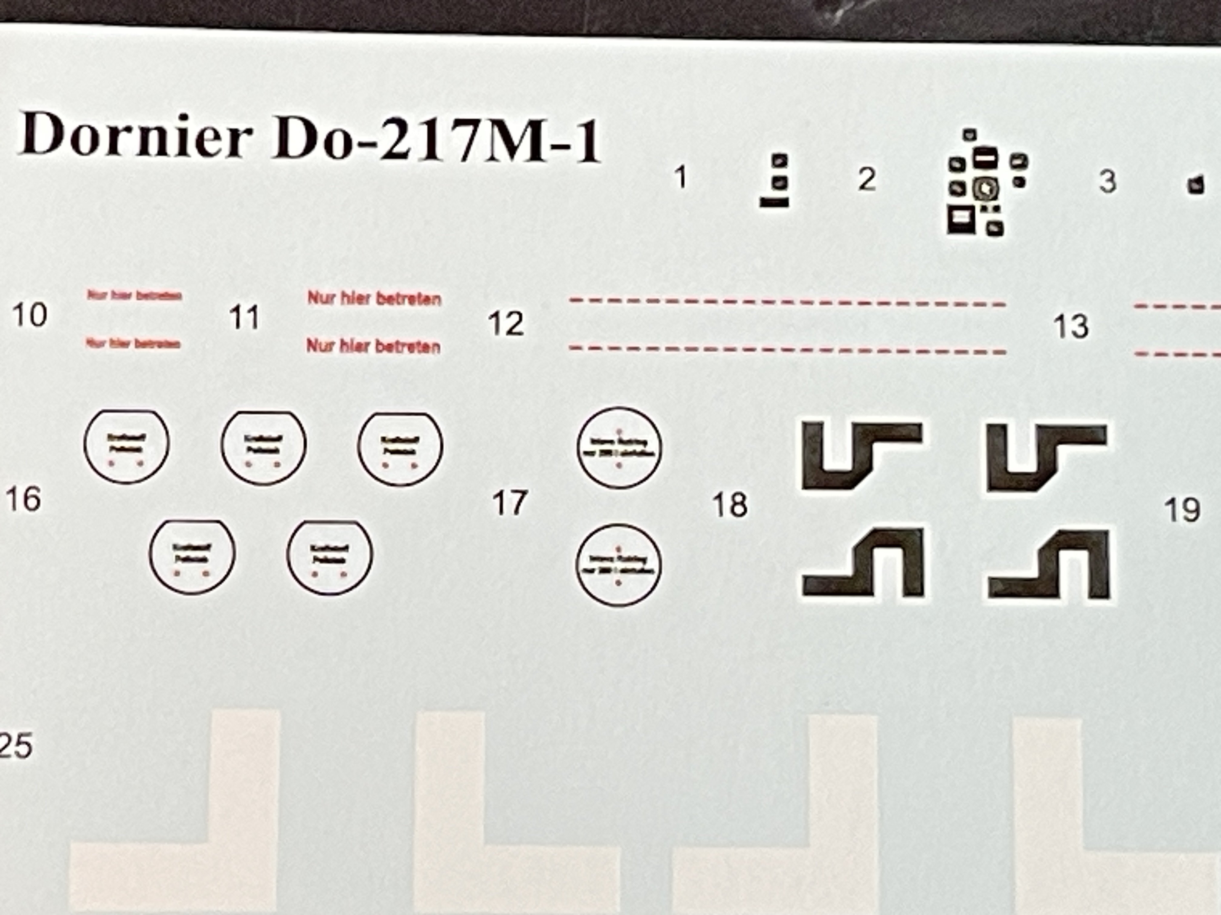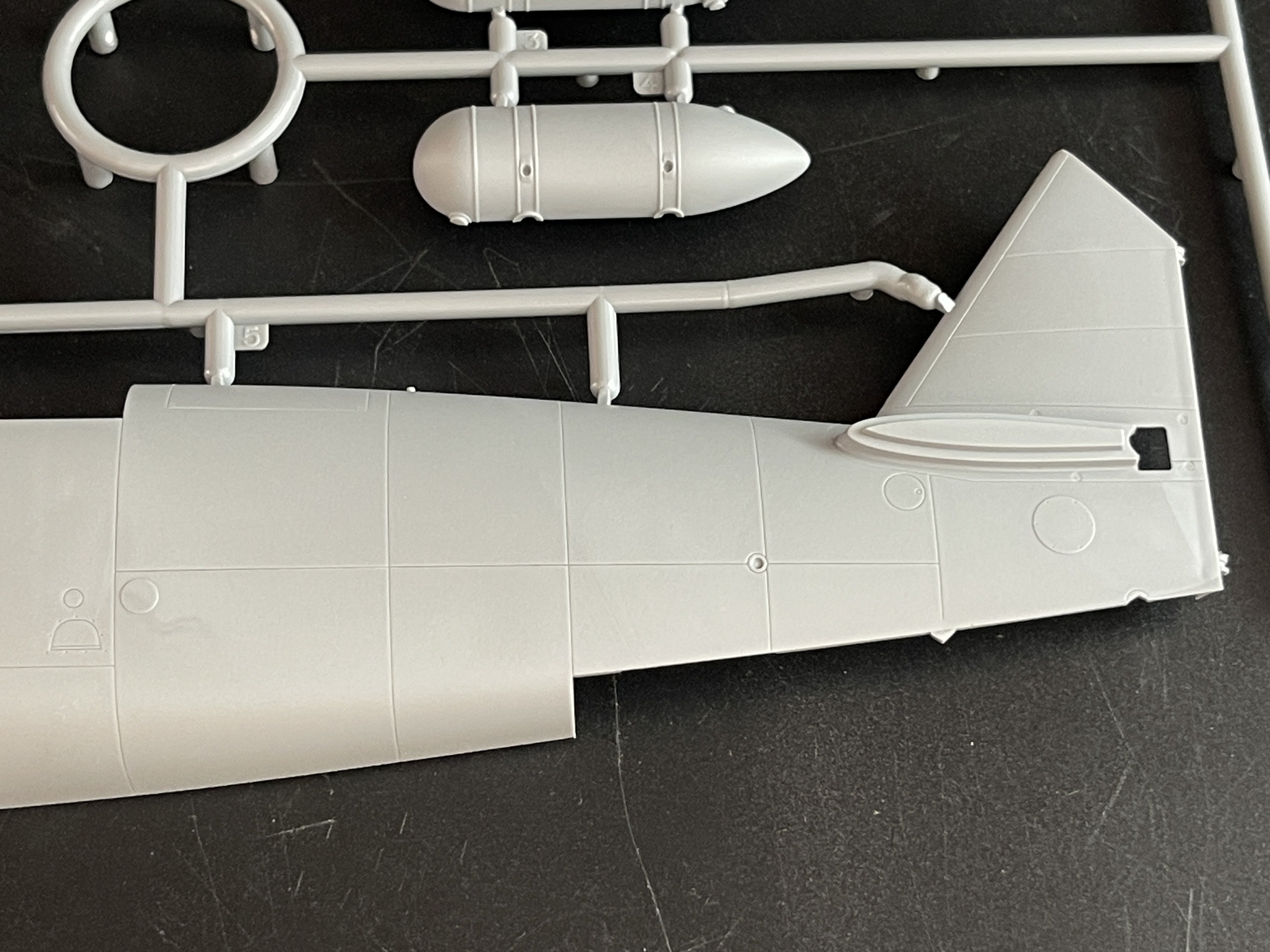 1:48 Dornier Do-217 K-1 ICM Catalogue number 48273 Price: around 64,95€ The Dornier Do 217 K-1 was a German medium bomber developed during World War II as part of the broader Do 217 series, which evolved from the earlier Dornier Do 17, known as the "Flying Pencil" for its slender fuselage. The Do 217 K-1, introduced in the autumn of 1942, represented a significant advancement over its predecessors, incorporating a redesigned, aerodynamically streamlined nose and cockpit to improve performance. The Dornier 217 K-1 was a German WWII era medium bomber, developed from the previous Do 217 E medium bomber series. Unlike the previous Do 217 E, the Do 217 K-1 nose and cockpit was redesigned and aerodynamically streamlined, resulting in lower drag and higher speed. The crew of five was sitting inside the new fully glazed canopy. Compared to the Do 217 E the defensive armament was redesigned as the forward firing 7,92 mm MG 15 machine gun was replaced by twin MG 81 7,92 mm machine gun and the rear facing MG 15s were replaced by a single mounted MG 81. The offensive armament was removed. Maximum bombload of 4000 kg of bombs either in bomb bay or on external racks under the wings remained unchanged, although a single SC 1800 bomb could now be carried inside the bomb bay. The first Do 217 K left the factory in September 1942 and served throught the war as night bombers and against enemy shipping. The Do 217 is faster than most of other bombers it will meet in battle, being capable of taking out up to four bombing points when utilizing the Flamm C250 incendiary bombs or up to four bases utilizing the four SC 1000 bombs, depending on the maximal battle rating of the said match. Do 217 K is also very capable due to its heavy bomb load and the powerful SC 1800 bomb containing 1000 kg of TNT eq. and 30 metres wide destruction radius. Do 217 can also be used in naval battles as it comes equipped with a pair of F5W torpedoes with 3 km range and 300 kg TNT eq. However these might prove hard to use as the Dornier have to slow down to sub 301 km/h making it an easy target for the naval gunners. Despite being a bomber, the Dornier is also quite maneuverable with maximal structural limit being 700 km/h.[1] Just a brief history for a very well know aircraft. So, let`s crack the box to check one of the most wanted and eagerly awaited model of the year of ICM catalogue. The usual ICM flip top cardboard with a separate card lid showing the artwork. I like ICM artbox, they are quite good. Not my favorites but I like them. Inside you have sprues separated in two plastic bags and the clear parts in another bag and full protected. Opening the box, you get a total of 13 gray branches and two clear branches. The clear parts are individually packaged in protective bags. There is a lot of parts in this box that you will not use. The C and D sprues you will use less the 30 % of it. There are also same parts for the night version, that I check the instructions of it (as I don’t have the J version). Is the sprue H for engines, cowlings, and propellers is exactly the same for their radial engines. But let’s check it all. The first big thing here is the clear parts. This version has its one clear parts (the sprue J) as that is obvious considering the huge front gondola and the upper canopy is also new. The clear parts are perfect! Even in this shape… As usual are pristine and very clear with no distortion at all. Sprue K is also completely new and brings the two new fuselage halves as the largest parts, including parts for the interior, the armament and the fuselage tail. As we have both fuselage for the night fighter and this version, we make a little comparation. As you can see, the new fuselage is shortened at the front to accommodate the new full glazing, and the rear can be equipped with two different versions. You get both fuselages. It’s a totally new mold for the fuselage. Kudos to ICM The cockpit is quite big and there’s a lot of glazing to see inside. So, straight from the box, you can get a good cockpit detail has you have in the box side consoles, small instrument panel with three-dimensional components. So, with some work, the decals and some carefully painting you can get a great cockpit straight from the box, excepted for the seatbelts. As usually, for the seatbelts you need to use some aftermarket seatbelts. The sprue W gives 500 and 250 kg bombs very well detail. Passing on a first general view, is a typical ICM quality plastic, with no distortion, no flash, with very good surface detail. On sprue A, the fuselage halves and tail. Well on this release, these fuselage halves are not used. Sprue B On this sprue, full span wings, with upper and lower halves. Really nice molding. A rivet counter could have some extra detail. Sprue C Mostly all parts on this sprue will not be used. This model will give a lot of extra parts to your spare box. So just a few parts of the undercarriage bay. Sprue D Two sprues in fact, with all the parts for the engine DB603A, propellers and engine nacelles, nothing used on this version that wear the BMW 801D (both with 1700hp each). Well, on this model kit, only the wheels, landing gear are the only parts to be use. Sprue E This sprue brings us the flaps, upper turret (and all its details) instrument panels, side cockpit consoles and undercarriage bay. As for the side cockpit consoles, will not be use as the cockpit detail for this one is on the new K sprue. The instrument panels are quite good in raised detail and you have a decal set for the instruments bazels. Sprue G It supplies the engine mounts and undercarriage fairings. The night fighter nose cone is no needed for the build. The instructions. The usual standard from ICM with a booklet with the first and last page in satin paper and the rest in normal paper. The color table chart only have ICM paint range and it start to make some sense (at least in Europe) as you start to have some online store that sell them as Art Sc