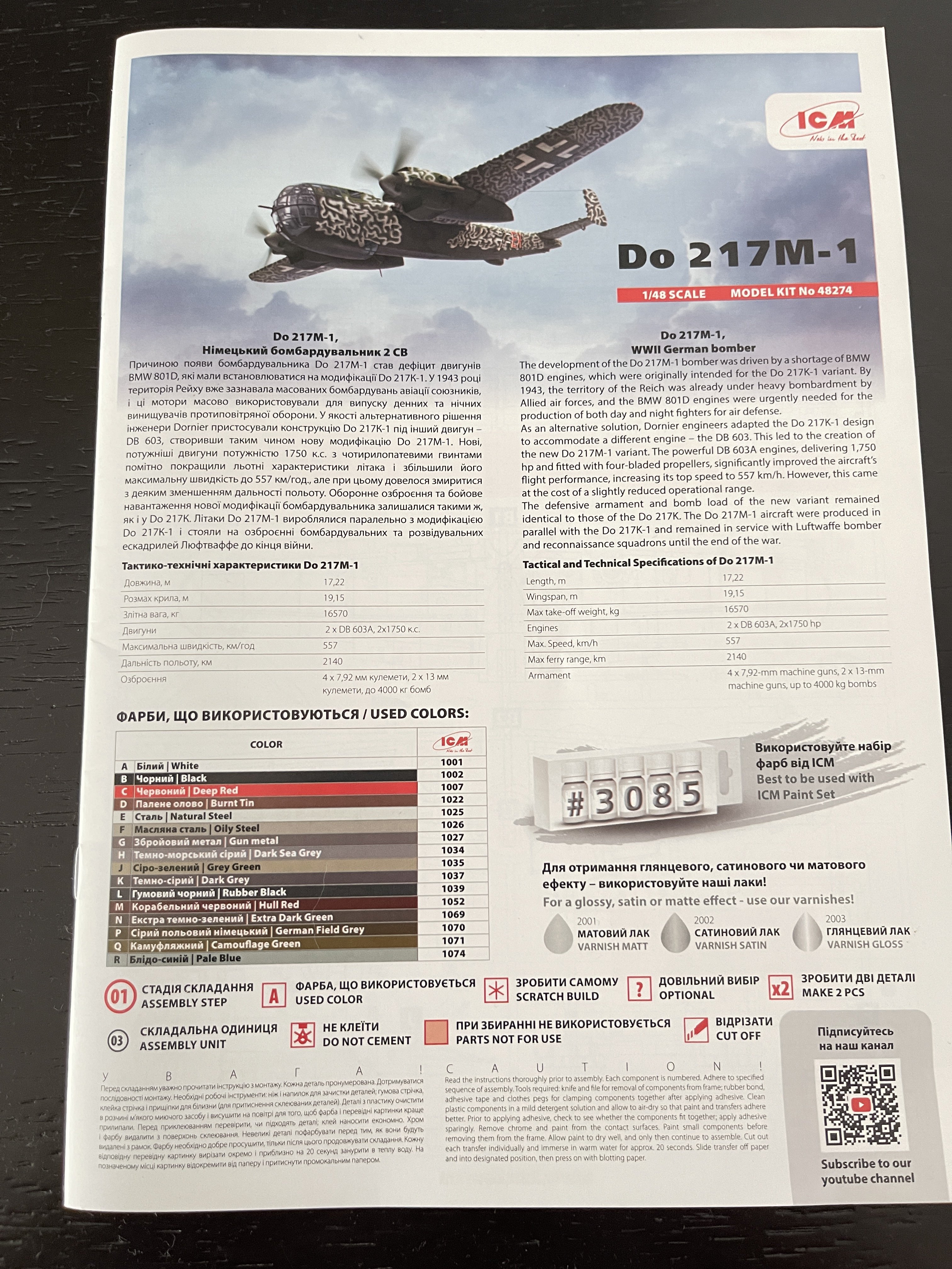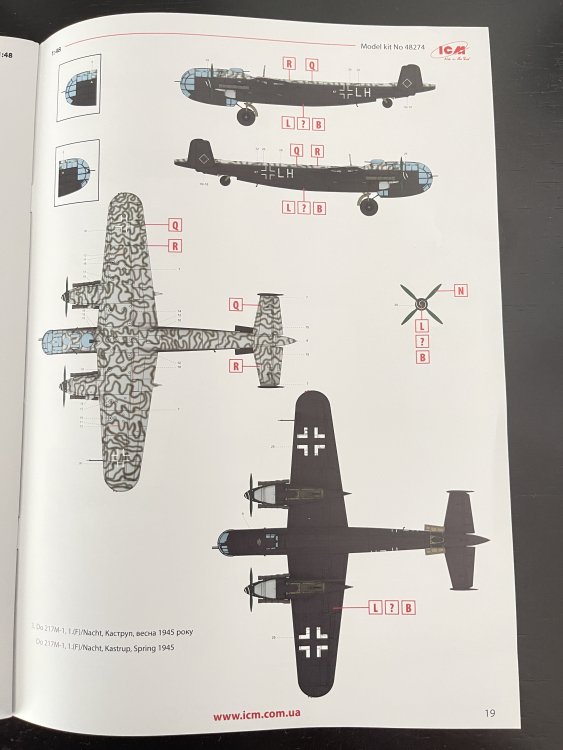 1:48 Do-217 M-1 ICM Catalogue number 48274 Price: around 64,95€ The Dornier 217 M-1 was a German WWII era medium bomber, developed from the previous Do 217 E medium bomber series. Unlike the previous Do 217 E, and similar to the Do 217 K-1, the Do 217 M-1 nose and cockpit was redesigned and aerodynamically streamlined, resulting in lower drag and higher speed. The crew of five was sitting inside the new fully glazed canopy. Unlike all the Do 217 versions before, new engines were chosen as the radial BMW 801 engines were in shortage. Instead,the Do 217 M used inline DB 603A engines found in He 219 and Do 335 or Italian G.56 fighters. New engines drastically improved the top speed of the bomber which increased by approximately 80 km/h. The defensive armament was changed again, the forward 7,92 mm MG 81 was replaced by heavier 13 mm MG 131 and the rear facing MG 81 machine guns were changed from single to dual mounted. The offensive armament was removed. Maximum bombload of 4000 kg of bombs either in bomb bay or on external racks under the wings remained unchanged, although a single SC 1800 bomb could now be carried inside the bomb bay. The Do 217M took part in Operation Steinbock, the last Luftwaffe offensive against British isles aswell as in sinking of the battleship Roma on her way to Malta. The Do 217 M-1 was introduced in Update 1.29 together with the other planes of the Dornier 217 family. The Do 217 is faster than most of other bombers it will meet in battle, being capable of taking out up to four bombing points when utilizing the Flamm C250 incendiary bombs or up to four bases utilizing the four SC 1000 bombs, depending on the maximal battle rating of the said match. Do 217 M is also very capable CAS due to its heavy bomb load and the powerful SC 1800 bomb containing 1000 kg of TNT eq. and 30 metres wide destruction radius. Do 217 can also be used in naval battles as it comes equipped with a pair of F5W torpedoes with 3 km range and 300 kg TNT eq. However these might prove hard to use as the Dornier have to slow down to sub 301 km/h making it an easy target for the naval gunners. Despite being a bomber, the Dornier is also quite maneuverable with maximal structural limit being 700 km/h, rivaling fighters such as Bf 109, making the Dornier be able to run away in dive from opponents such as Spitfires or Yaks. (https://wiki.warthunder.com/unit/do_217m_1) So the main difference and it quite eaassy to see are the engines. While the Do-217 K-1 was powered by the BMW 801 engine, the M-1 was powered by the Daimler-Benz 603. So this kit has all parts of the K-1 version except the engine sprue. But first the box art! ICM really has some great artist painting or making such box art. This one is no exception as it´s, for me, very appealing! On his version you will get much less plastic as you don’t have the engine BMW sprue. On the K version you have a Daimler benz engine and the BMW engines. In this version, only the DB engines. The clear parts are perfect! Even in this shape… As usual are pristine and very clear with no distortion at all. This example has a little cloudy window in the from gondola but nothing that a bit of polishing would not solve. The cockpit is quite big and there’s a lot of glazing to see inside. So, straight from the box, you can get a good cockpit detail has you have in the box side consoles, small instrument panel with three-dimensional components. So, with some work, the decals and some carefully painting you can get a great cockpit straight from the box, excepted for the seatbelts. As usually, for the seatbelts you need to use some aftermarket seatbelts. Passing on a first general view, is a typical ICM quality plastic, with no distortion, no flash, with very good surface detail. The main different for the K version- The engines You can chance to chose between close engine and open engine. To open the engine, a minor surgery has to be made so you have to cut the gondola engines and start working on step 48A. If you want all close you start the 48b. The good of it is that you can have one close and one open. The instructions. The usual standard from ICM with a booklet with the first and last page in satin paper and the rest in normal paper. The color table chart only have ICM paint range and it start to make some sense (at least in Europe) as you start to have some online store that sell them as Art Scale Kit. Anyway, the instruction manual is detailed and easy to follow. It includes step-by-step assembly diagrams, color callouts, and decal placement guides. The masking templates is a nice touch but I would recommend some good masks like the ones from Art Scale. The decal sheet has a good color registration and supply 4 finishing options: Do-217 M-1, 2./KG2, France, Summer 1943 Do-217 M-1, 2./KG2, Culimiern, early 1944 Do-217 M-1, 1.(f)/Nacht, Kastrup, Spring 1945 Do-217 M-1, 2.(f)/Nacht, Prague-Ruzyne, 1945 The box profiles. Conclusion Well, ICM is filling up all D-217 variants in 1:48, all with very good models kits straight from the box. The M and K line were a must have to all Luftwaffe fans. The wait as worth it, no doubt about it!! As all latest ICM model kits, the detail out of the box is very good and it will make a very good replica. For the expert and keen modeler some AM will make some extra detail to make this beauty into a total masterpiece. That big clear gondola is begging for it. VERY Highly recommend this to intermediate modeler My thanks to ICM for making this fantastic model.