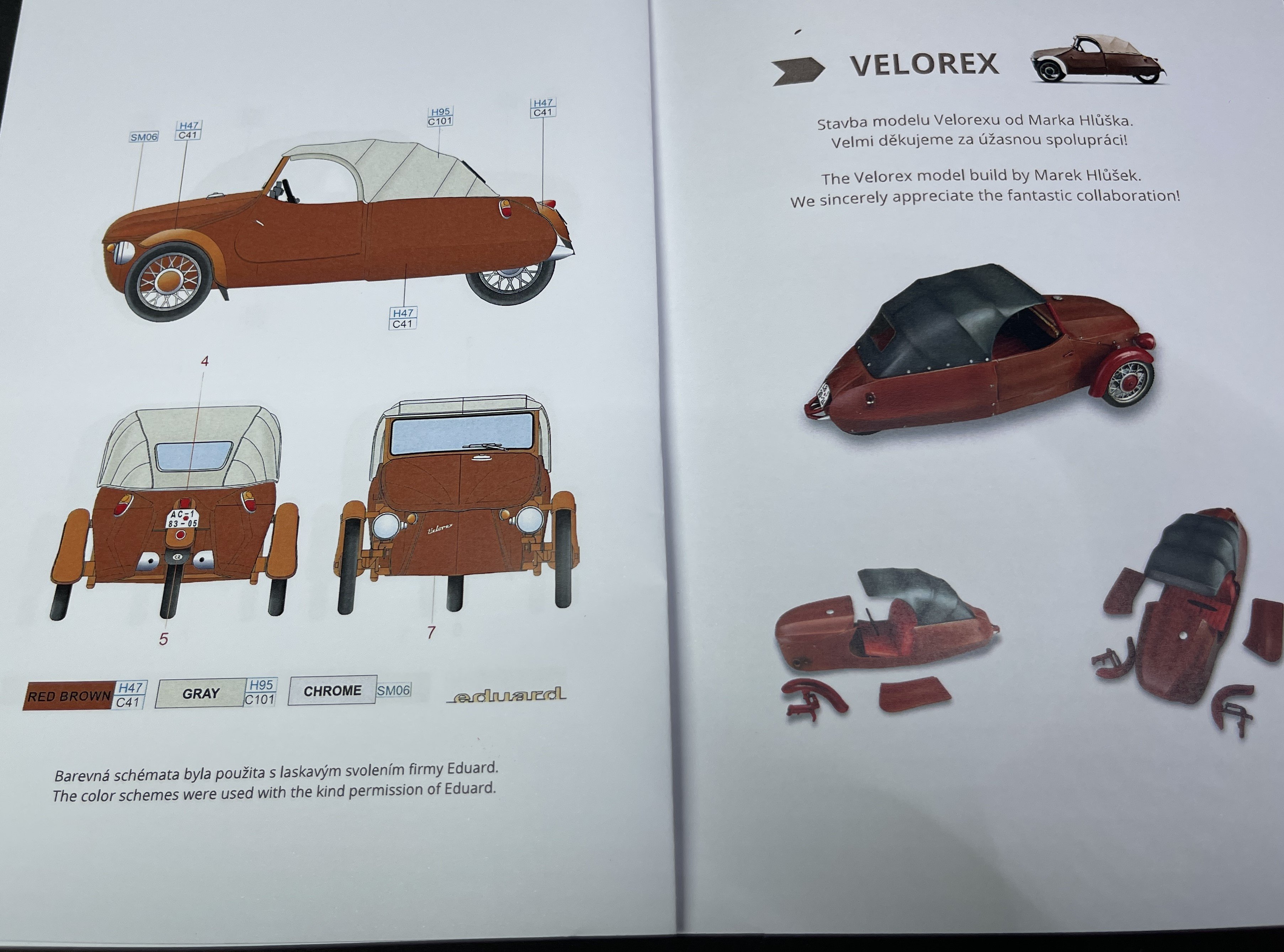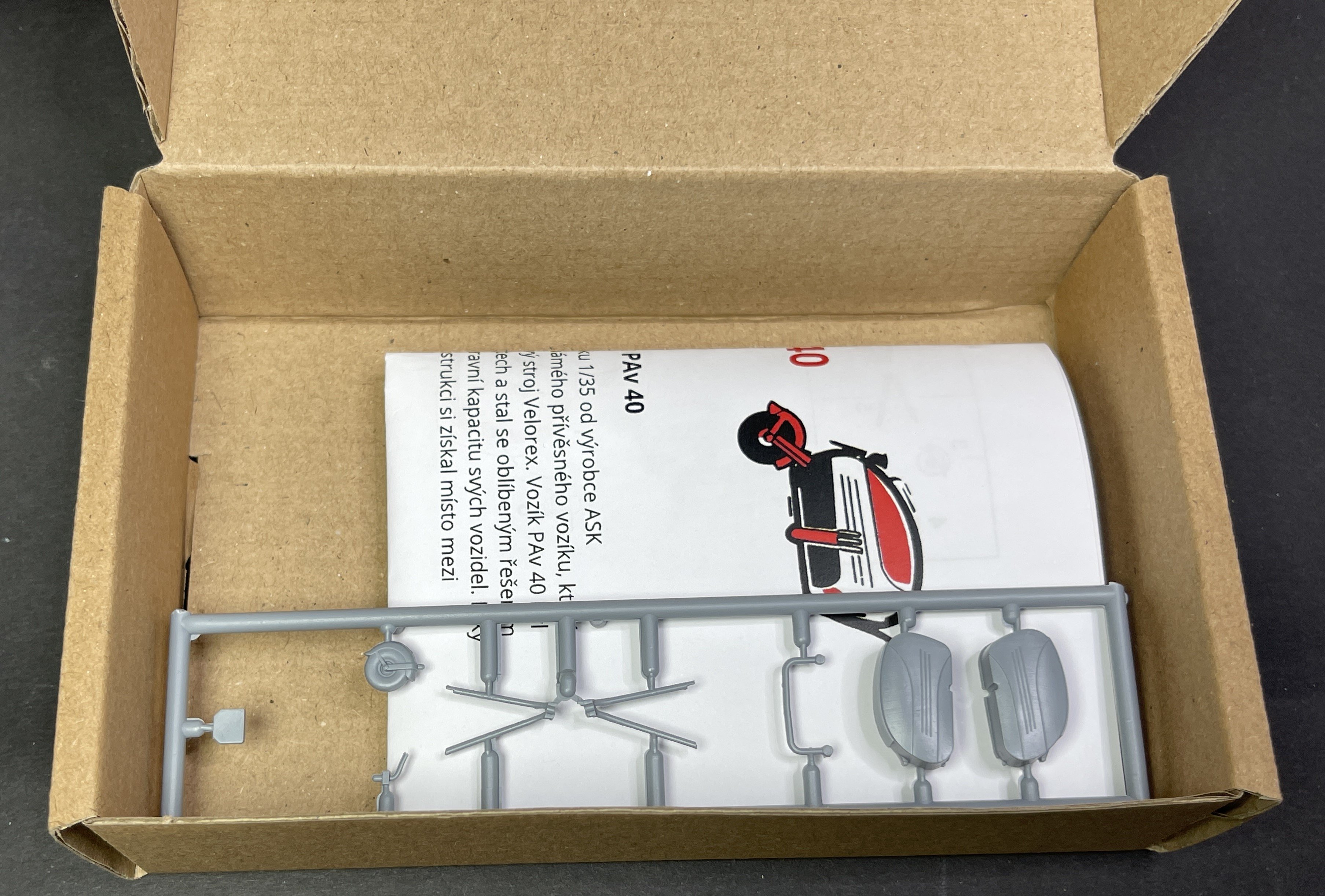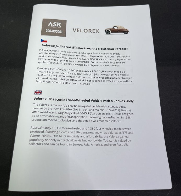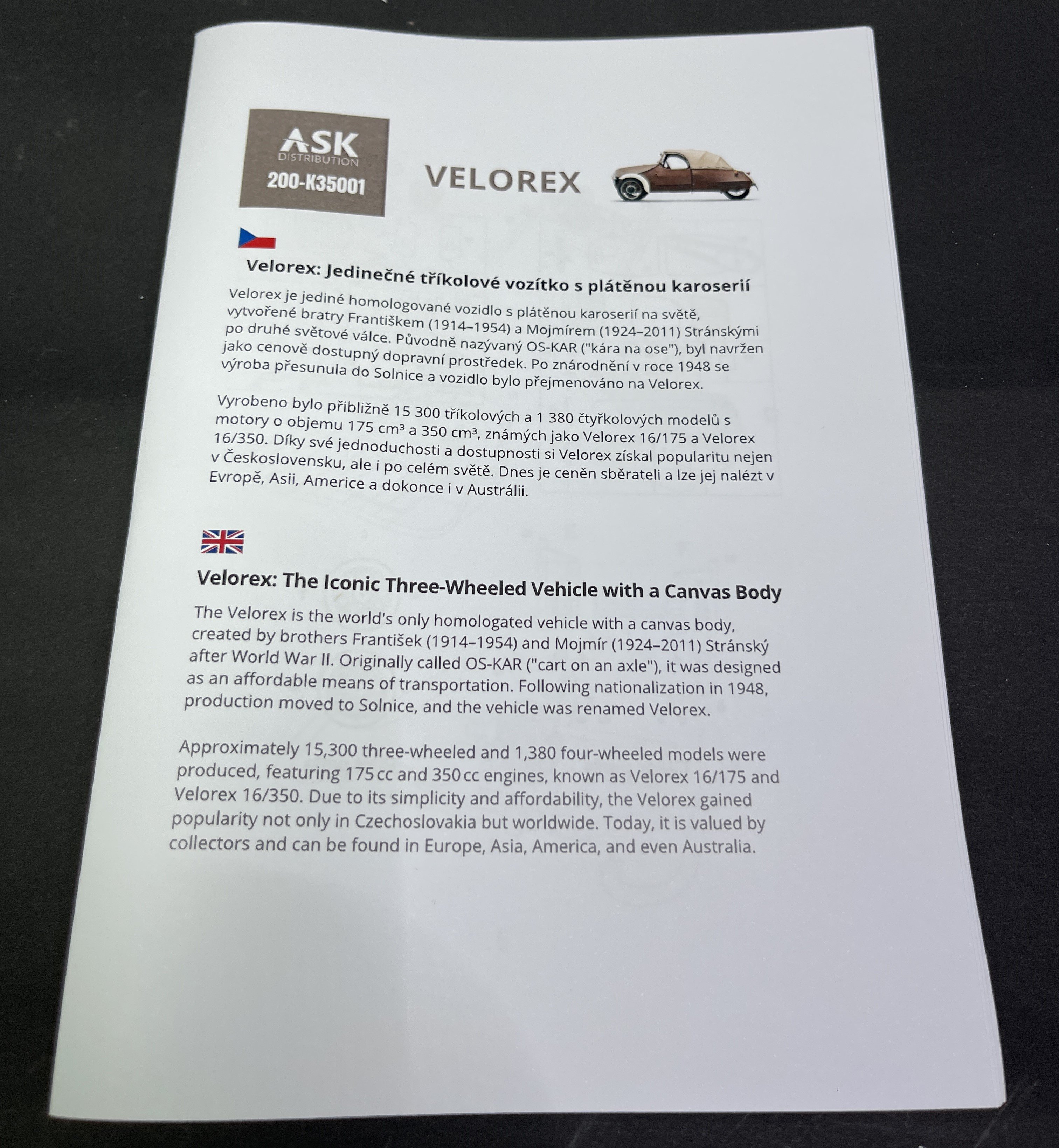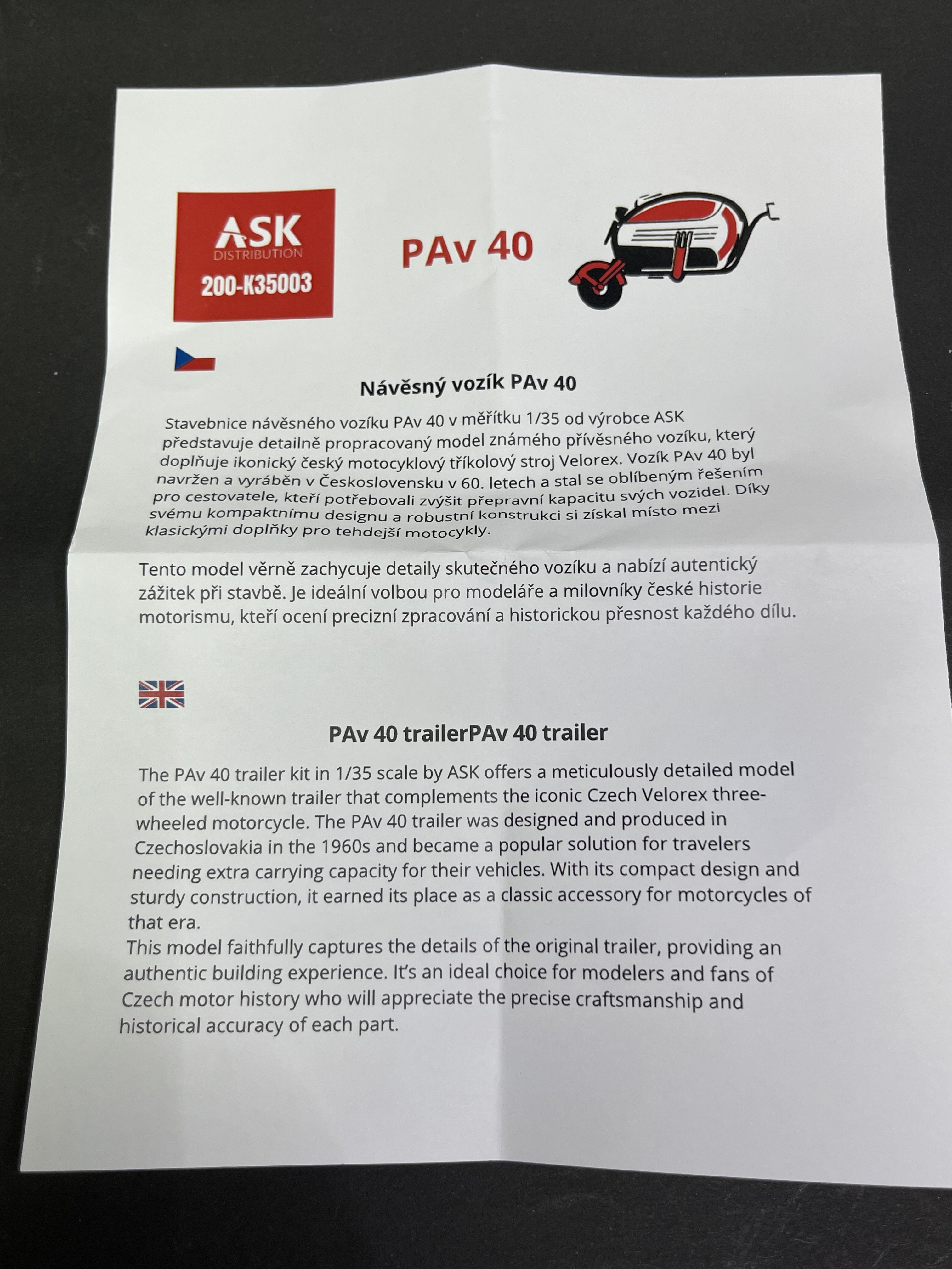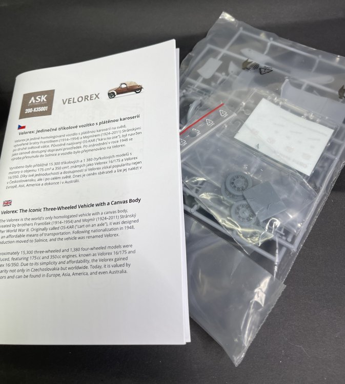 1:35 Art Scale Kit Velorex And Trailer PAv 40 Velorex – catalogue n.º 200-K35001 Available here – 24,50€ PAv40 – catalogue n.º 200-K35003 Available here – 3,30€ And Velorex 3D Print Wheels – available here - €5,30 Art Scale Kit (also known as ASK) is a model hobby shop and has growing in the modelling world with their decals, 3D Productions and tools. They have release their first injection mold 1:35 model. The Velorex and its little Pav40 trailer. The Art Scale Kit (ASK) 1:35 Velorex (kit number K35001). The first time I saw it, I thought: what? Velorex? I confess I never heard about it. “Based in Parnik, Czechoslovakia, the Stransky brothers (Frantisek and Mojmir) opened a bicycle repair shop in 1936. Inspired by the simplicity of Morgan's three-wheelers, the brothers decided in 1943 to build their own three-wheeled economy car, aimed at disabled veterans. That year their first prototype was constructed, using a tubular steel chassis and sheet metal for the bodywork. By the time the first batch of a dozen production cars was made in 1945, the duralumin bodywork had been swapped for a leathercloth-type material called Igelit, but the original tubular chassis was retained. Those Igelit panels were held on by press studs which made them easy to replace if they got damaged. The two brothers experimented with engines, with those first Oskars (as the car was now called) receiving a mix of 150cc, 250cc and 300cc two-stroke air-cooled engines. As an exercise in cheap motoring the Oskar was a triumph, as it cost about a quarter of the cost of a more typical car. The vehicle was about as faithful as one could get to the true spirit of the classic cyclecar. Components such as the engine, wheels, wings, and even the teardrop-shaped fuel tank were pure motorcycle. In 1950 the Stranskys' design was taken over by a government co-operative called Velo, and their workshop was transferred to Hradec-Kralove, later renamed Velorex. A year later half a dozen workers and the machinery to build the Oskar 54 (as it was now called) were once again relocated, this time to Solnice, for production to be ramped up. While just 120 Oskars were built in the whole of 1951, and 180 the following year, by 1954 production was running at the rate of 40 cars each month. This wasn't a good year for the Stransky brothers though, because in January Frantisek was killed while testing an Oskar prototype, then later that year Mojmir was sacked from the company for refusing to join the Communist Party of Czechoslovakia. In 1956 the company that made the Oskar was renamed the Velorex Oskar before later reverting to simply 'Velorex', and despite the car's advancing years it was in demand more than ever. Half of the cars made were going to disabled Czechs while the rest were being distributed throughout other Eastern Bloc countries such as Hungary, Poland, East Germany and Bulgaria. By 1959 120 Oskars were leaving the factory each month and in 1961 the investment continued with a new factory opening up to share the workload. Until 1963 the Oskar had been fitted with a choice of 172cc or 249cc single-cylinder engines, but from this point on the bigger engine was swapped for a 350cc Jawa unit, while the interior was also spruced up a little – not that the Oskar was ever what you would call luxurious. Oskar production continued right up to 1971 when an all-new four-wheel model took over, with the very catchy name of 453. But it was a disaster and production stopped after just two years, as the 453 couldn't compete with the Trabant which was much more usable and just as affordable – even if the waiting list to get one ran into several years. The joys of living in a communist regim” https://www.below-the-radar.com/velorex-oskar/ Also check the link for some great picture for color indication. This injection-molded plastic kit, developed with input from Velorex club ACR as it results on the back of box with the Velorex club bagde and a note of thanks. The box art is a profile drawing of the Velorex. This injection mold kit is the first offer in any scale, I think, of the Velorex and Pav40 trailer. This quirky vehicle model kit is quite appealing to auto modelers, diorama builders, or simply to the modeler that wants something quite different. The completed model measures approximately 80mm in length, making it compact yet detailed for 1:35 displays. So, inside the box, you got three plastic sprues, two plastic gray and one clear plastic, separately bagged for protection. You also get a set of 3D Resin printed wheels and a small decal sheet. I was quite surprised with the amount of detail of this little model kit, despite it`s 1:35 scale. The grey plastic is very well molded with some quite good details, with a little flash, easy to deal with. The clear parts are quite clear and perfect visible. The 3D wheels are very good as all 3D Printed parts from Art Scale. In grey plastic you get the engine (Jawa engine - no idea if is the 175cc or the 350cc) with two cylinder, exhaust, the tubular frame, canvas body, two roof options, separate doors, fenders and for the inside detail, seats, wheels, pedals and of course, the steering. The small decals sheets give the modeler the Velorex logo in black and in white and plates. The instructions are quite good with a small Velorex History. It has no color indication for the interior or other parts. However, gives you four profiles and the color used giving Mr Color indication color (a bit odd choice, at least for me). Complementing it is the separate 1:35 Návěsný Vozík PAv 40 trailer (kit number K35003). It’s a complete separate kit so you can buy the Velorex or the Pav 40. The trailer is a simple add-on designed specifically for the Velorex, replicating the real-world single-axle trailer used for extra cargo. Its comes in a very small sturdy box and inside a single grey plastic sprue with 8 parts with fine surface details, basically the same quality as the Velorex. The t