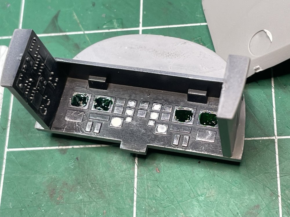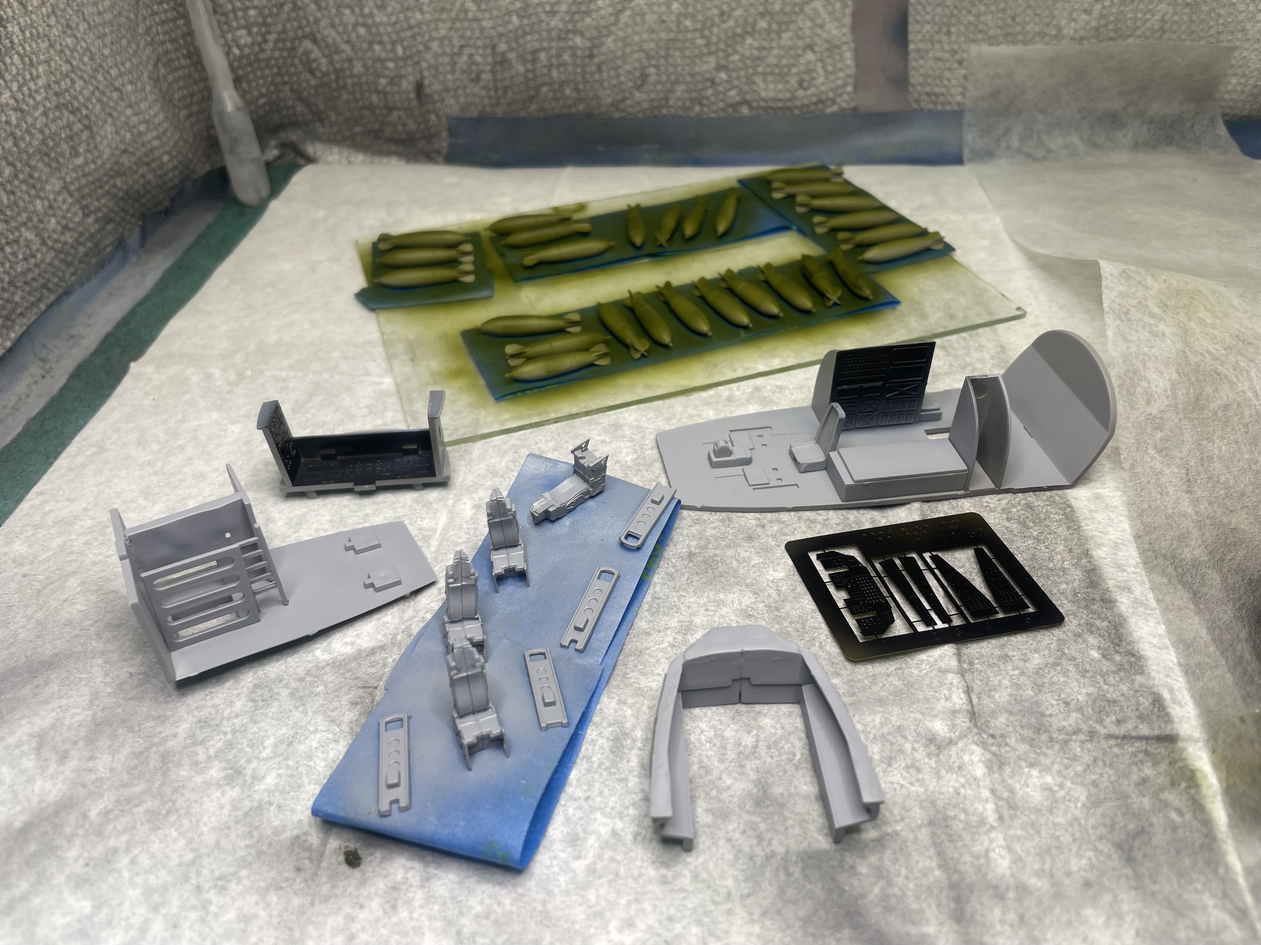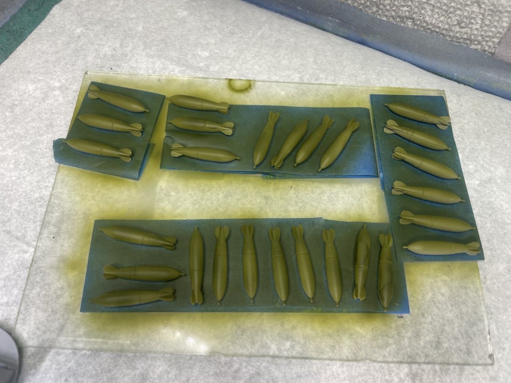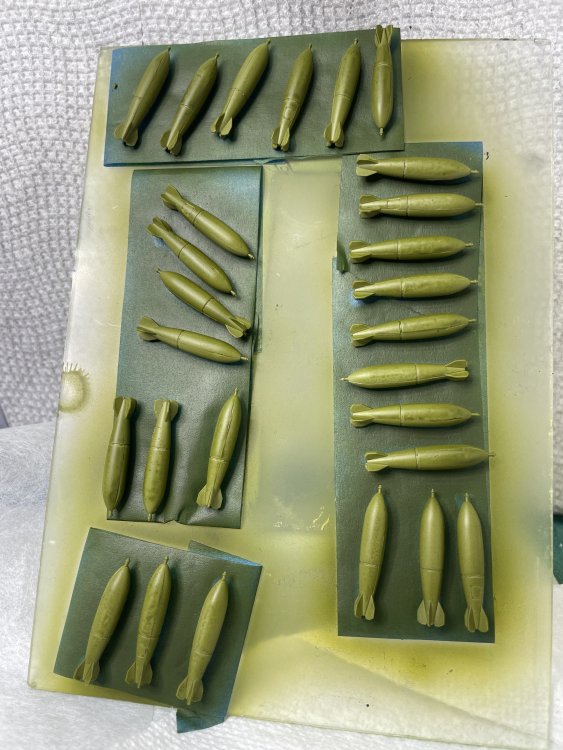 Made a LITTLE progress mostly because I ran into major airbrush issues (please see my message "Well, THIS is embarrassing"). Have most of the two-tier cockpit (I didn't know the cockpit was two levels! The Italeri kit doesn't show this level of detail) in Light Gray and the Instrument racks and PE instrument panels in black. All the black areas and the seats have a gloss coat getting ready for washes and detail painting. The bombs have an initial coat of Green but not full coverage yet. Here is my motivation for the bombs. They are greener than I thought they would be. Notice how high up the side of the fuselage the black comes on the plane: And my first coat of green. Had airbrush issues so this was the best I could lay down. The issue is fixed now, so hope to make more progress tomorrow. Will be layering a few colors.
