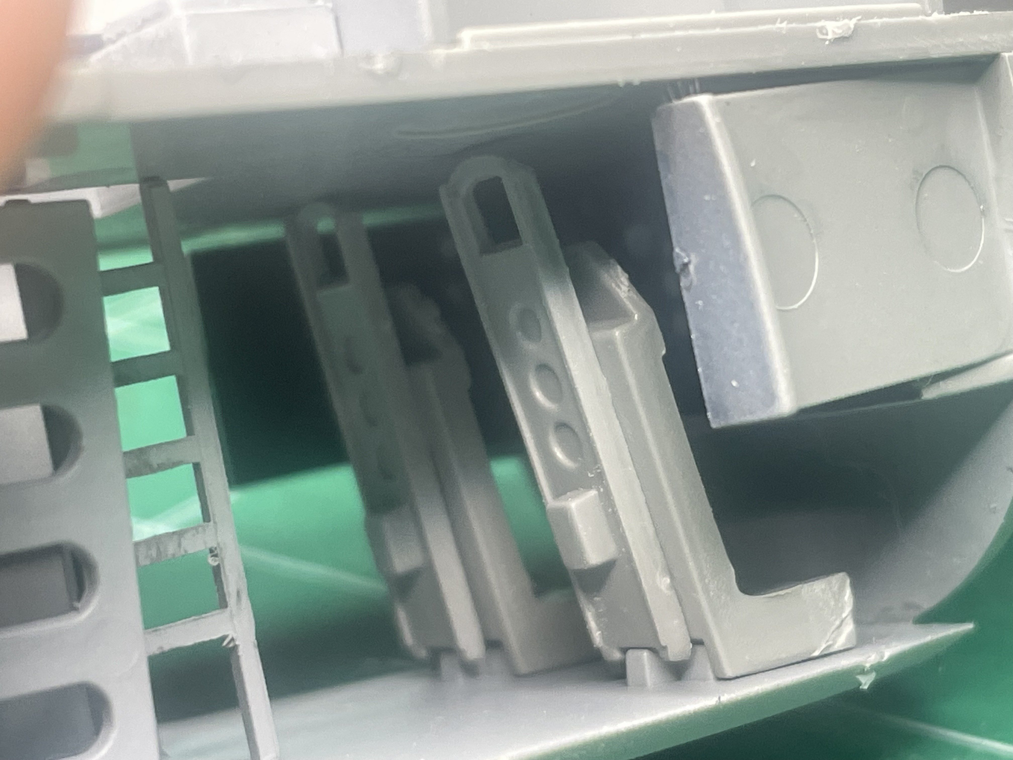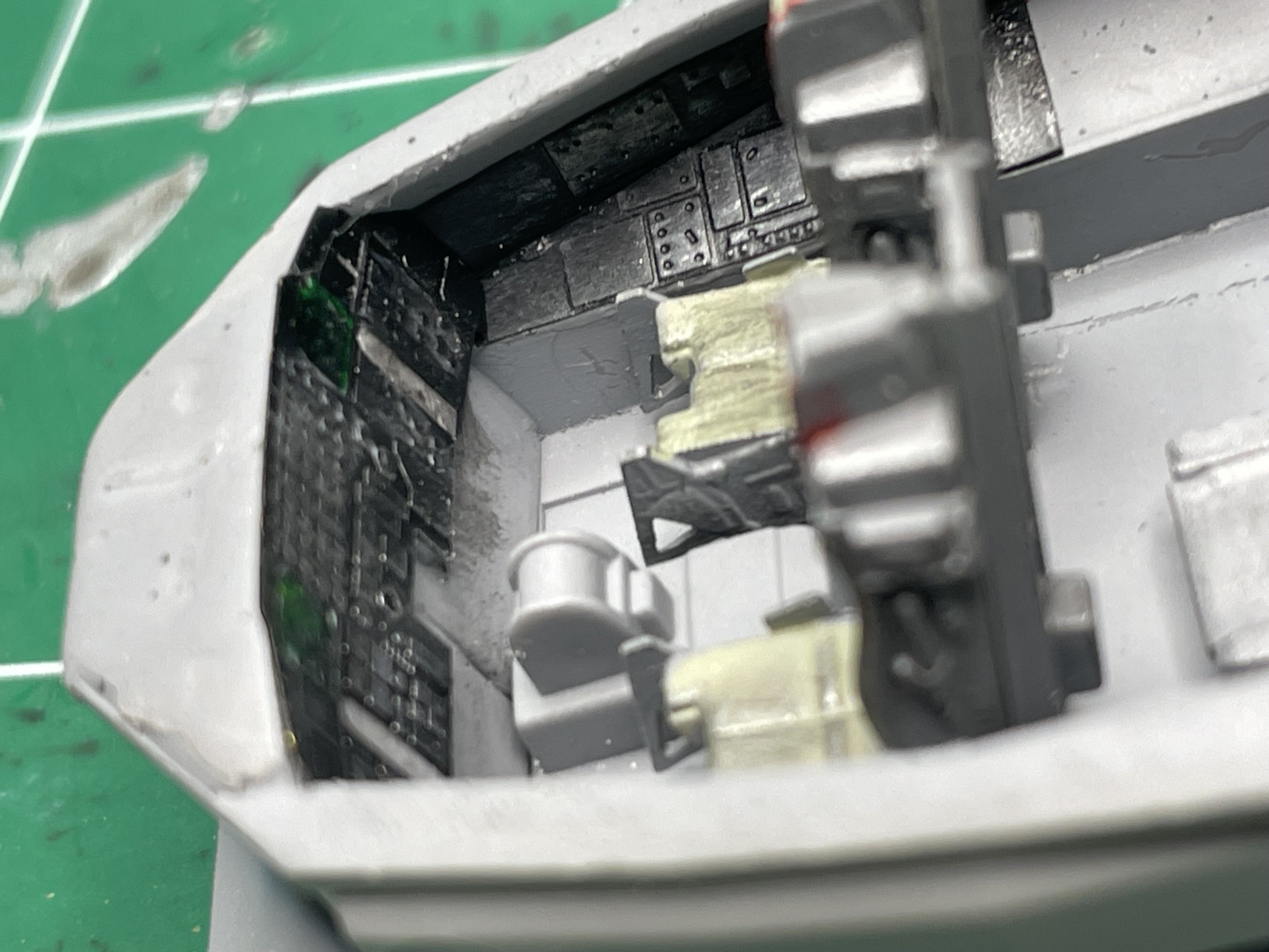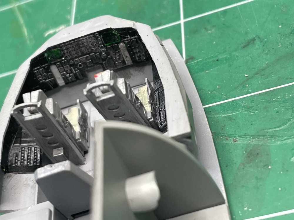 Made a LITTLE progress mostly because I ran into major airbrush issues (please see my message "Well, THIS is embarrassing"). Have most of the two-tier cockpit (I didn't know the cockpit was two levels! The Italeri kit doesn't show this level of detail) in Light Gray and the Instrument racks and PE instrument panels in black. All the black areas and the seats have a gloss coat getting ready for washes and detail painting. The bombs have an initial coat of Green but not full coverage yet. Here is my motivation for the bombs. They are greener than I thought they would be. Notice how high up the side of the fuselage the black comes on the plane: And my first coat of green. Had airbrush issues so this was the best I could lay down. The issue is fixed now, so hope to make more progress tomorrow. Will be layering a few colors.