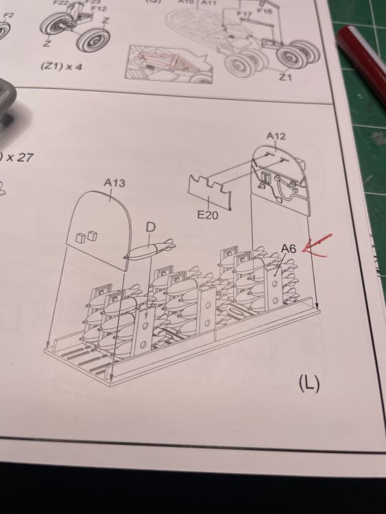 Pulled together the cockpit and again, the fit is interesting. Not a lot of locating help. But seems to be working out. Cleaned up some of the detail in the cockpit. The cockpit tub looks pretty good and the tub concept fits much better than the Italeri cockpit, which has more detail at the rear of the cockpit. These are supposedly the same size. Also the Italeri kit does not show the second level of the cockpit at all. NONE of that detail will be seen, but cool to know it is there! These guys didn't' have a lot of headroom! I'd have spent more time on this but... Some of the pour gates are really big, but all are on back surfaces (so far anyway). I did finally find some pictures of this area. Would have been cool to detail. Working on the bomb bay we again get to strange misses on the part of the instructions: it doesn't show the assembly of the bomb racks! Part A6 is shown completed, but nowhere in the instructions is how to put it together. It will not be hard to figure out, however. Base coat is completed on the bombs. Will do a top coat of darker green, then some color bands. The plane will be suspended from the ceiling so will be paying some special attention here That's it for now! Thanks for hanging in with me. Keeps me motivated to keep working on this beast.
