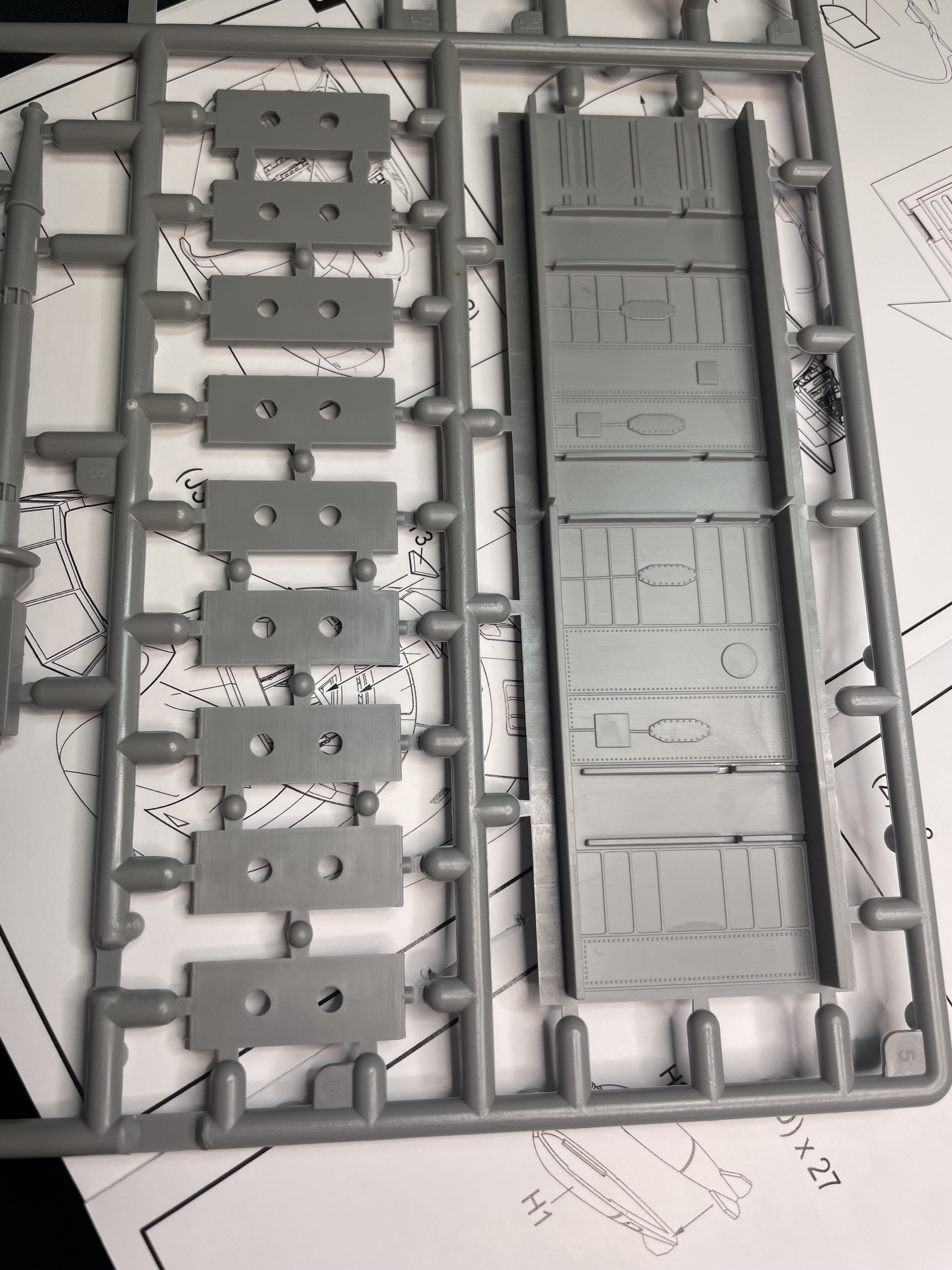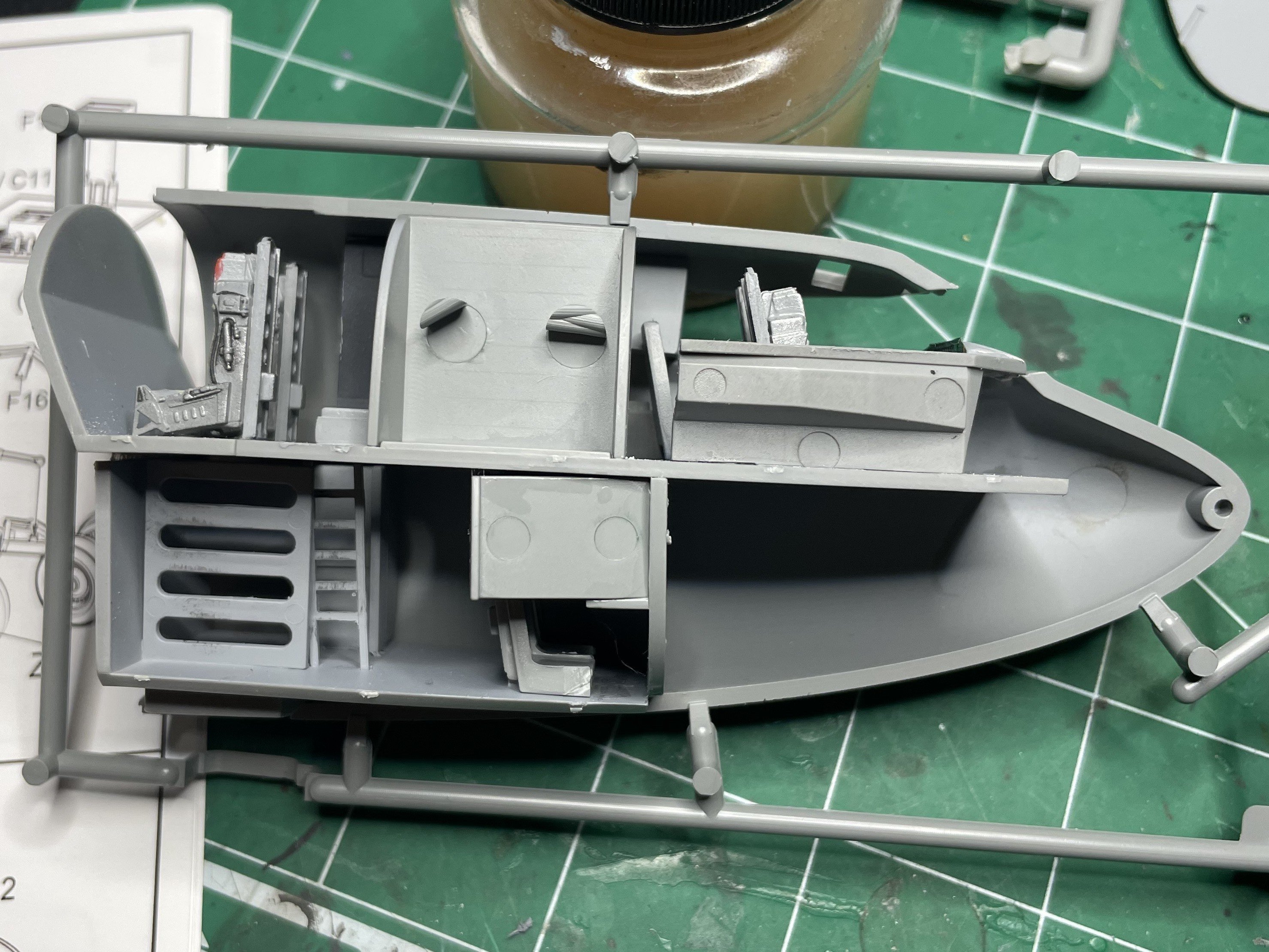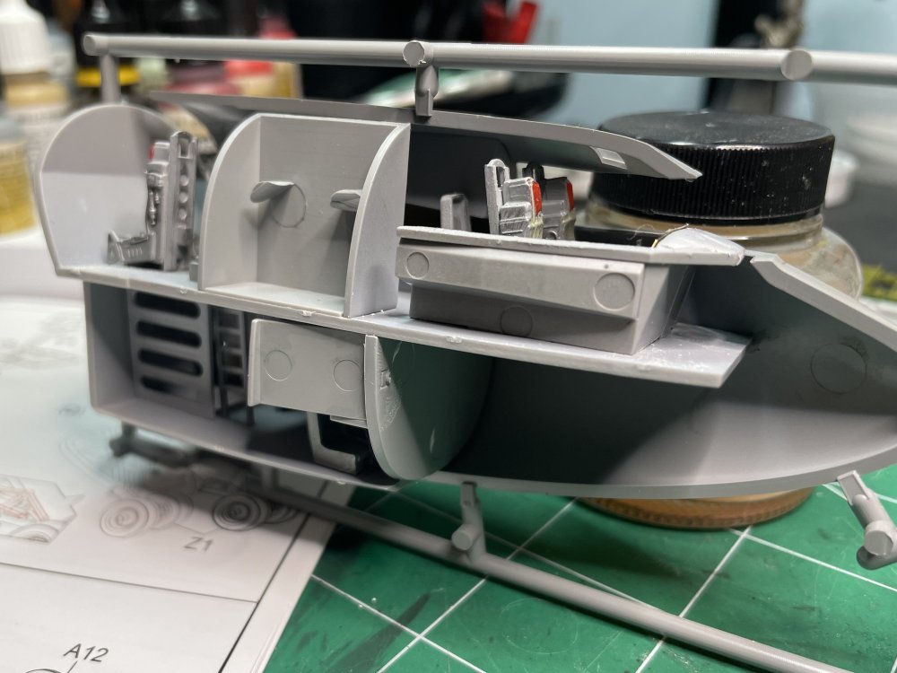 Making progress and showing some of the peculiarities of this kit: Many parts have no locating pins. Such as the cockpit instrument panel tub: The instruction sheet shows this as 1 piece. Took me a long time to realize this is actually two pieces. Very cool that there are PE instrument panels. Not cool that there are no decals to go over the panels. Going to paint the tub gray, then the PE panels Black and see what I can do from there. The PE fret has plastic over both sides. Interesting. Good detail but wish I had decals to go over them. Some really nice detail on the cockpit walls for the various stations. I probably should have painted these before assembling. Hmmm Location information from the instruction sheet means dry fitting is mandatory There is some minor flash to address and I've already figured out there is a fit problem with this next step. The floor is too long to fit the next step. More on that later.