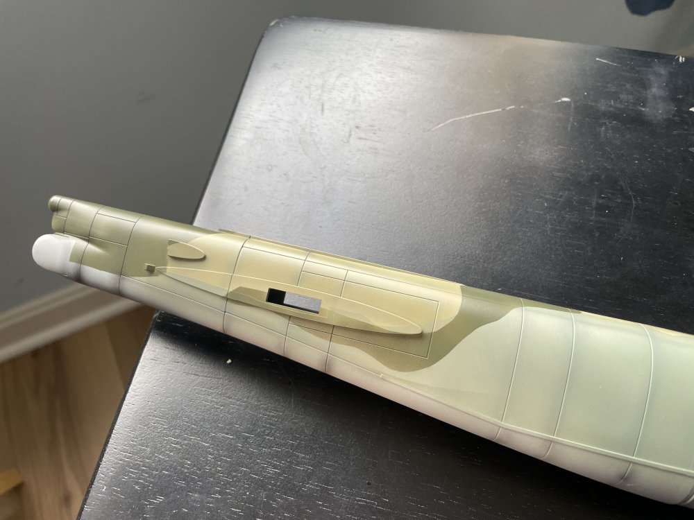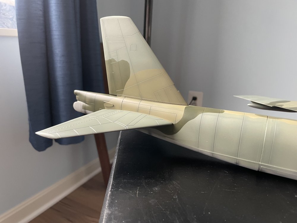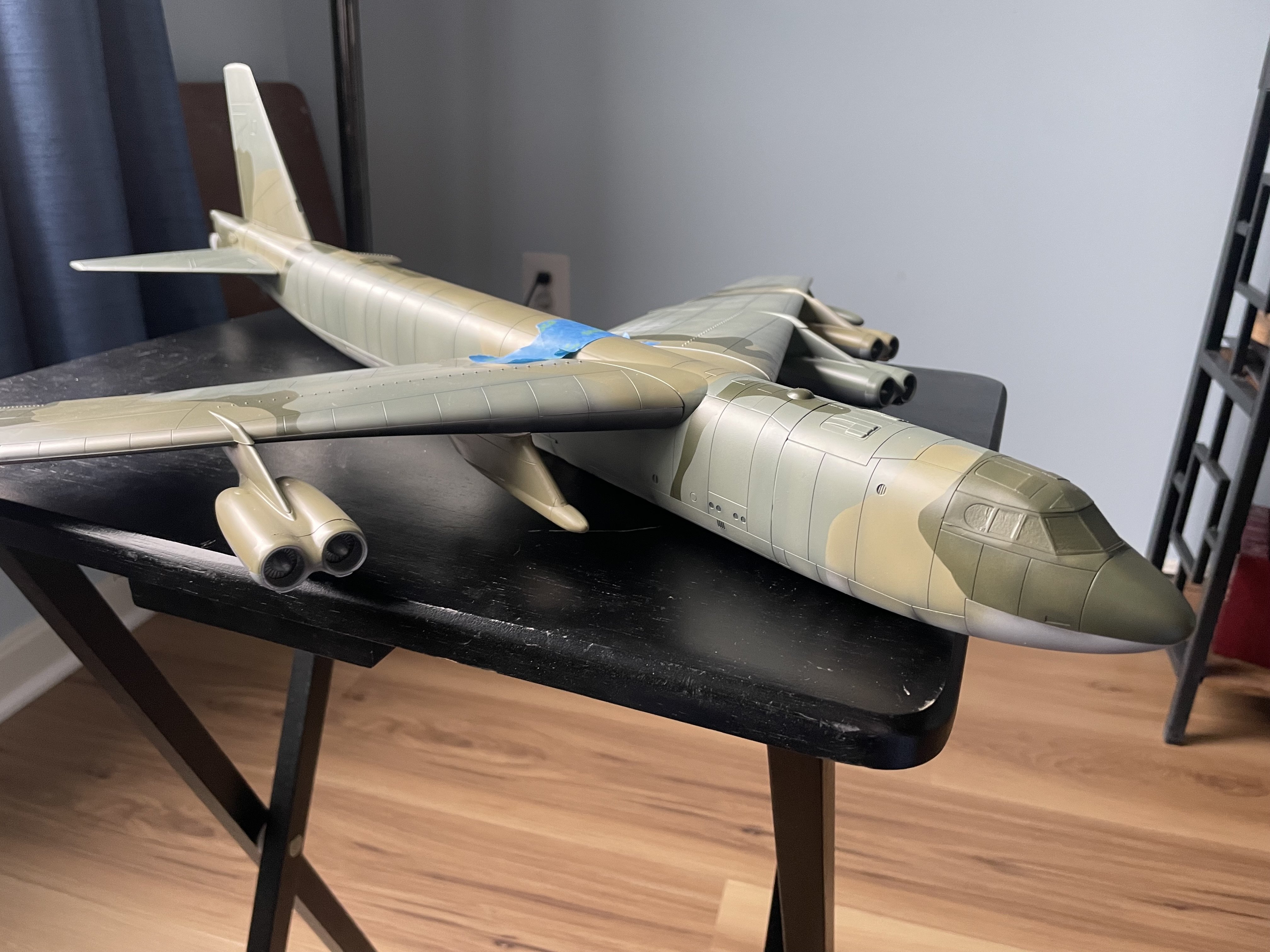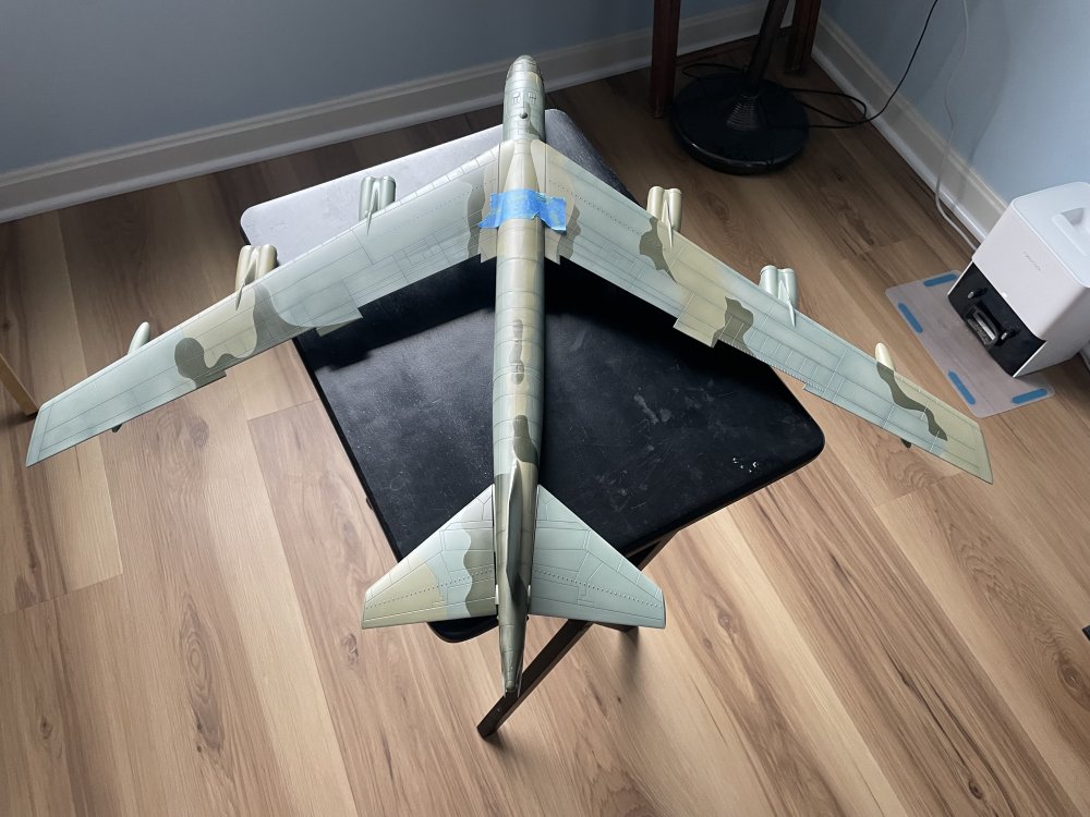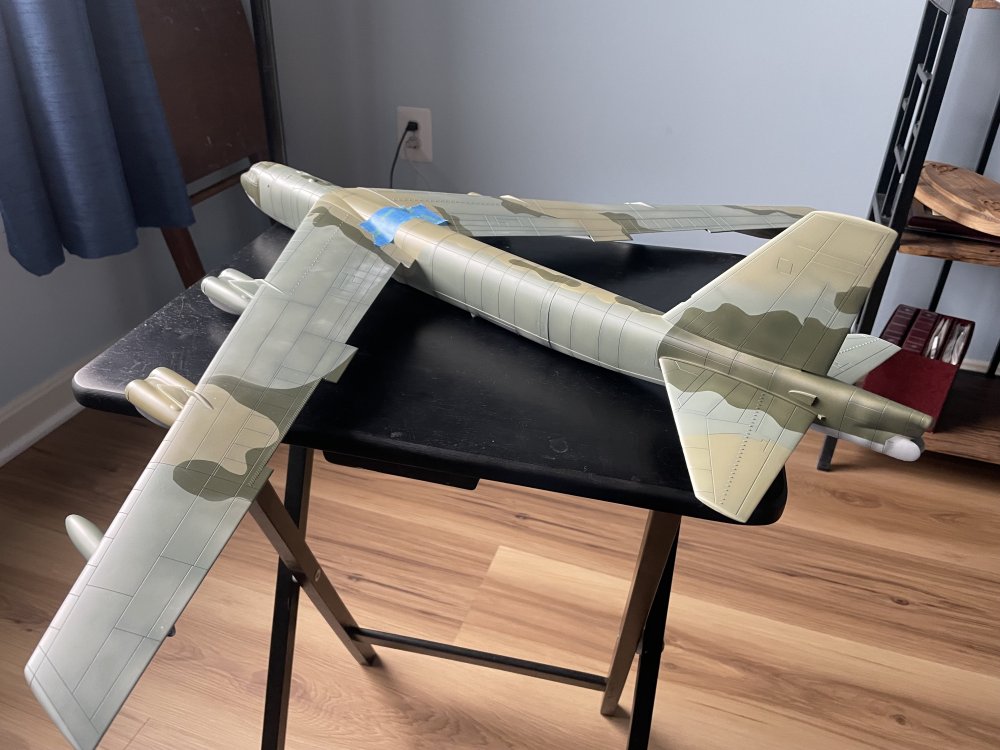 Making progress! Have completed the camo on the wings and have put down the first color on the fuselage. The tape is getting ready for the second color. Attached the engines which are an exercise in patience since there are no clear mounting points. And where the pylon meets the wing there is a gap, and the single pin on pylon top for the inside engines was about 2mm off of where it was on the engine pylon. Will take a bit of filler I think plus I did some paint damage gluing the pylons to the wing so will be doing some touch-up. And, yes, this thing is BIG....