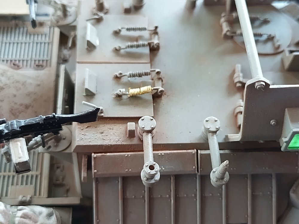 Afternoon, Many thanks, little bit of progress with glazing, replaced hatch spring, messing with stowage, one armour chain in place and some general touching up of paintwork. To do list - smoke grenade covers - one is WIP and needs some texturing, exhaust stains, more armour chains - will spray before fitting, they are reluctant to take paint. Might add a few boxes of supplies, guns need to be more matt and the final countermeasures antenna with PE 'crown' needs to be fitted, it's a bit delicate so will leave until last, Regards John -