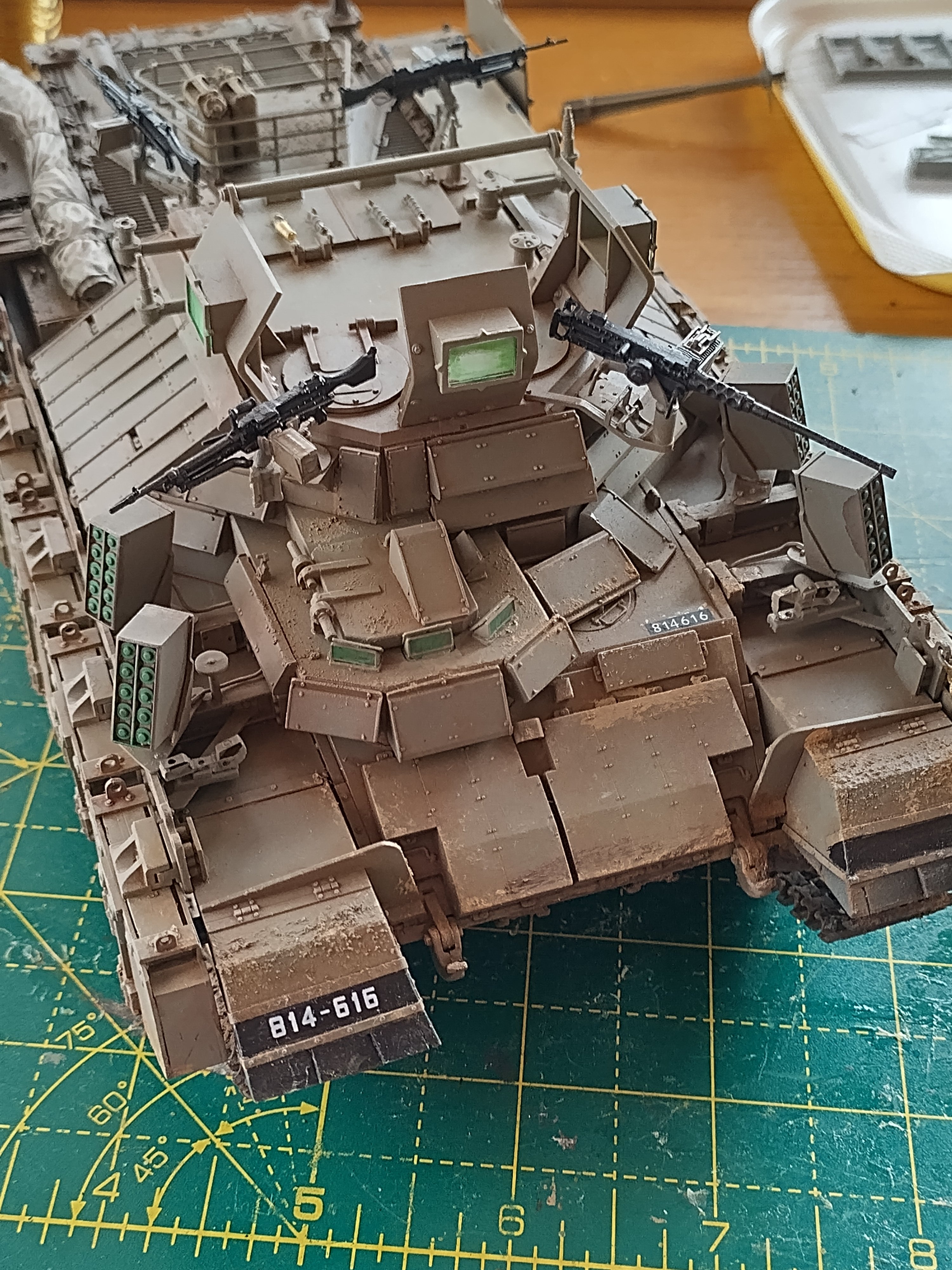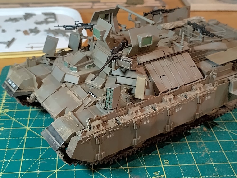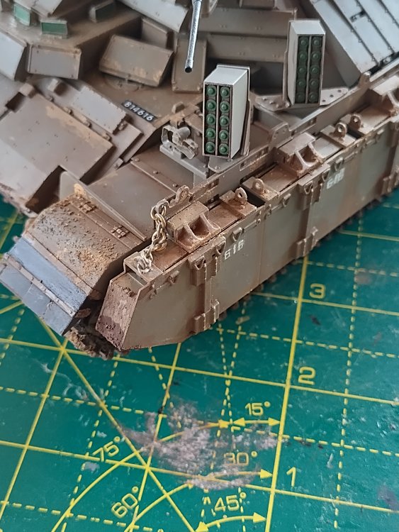 Afternoon All, Trying to get this one finished, started months ago and diverted away as usual. Have got tracks on and all the armour plates this afternoon, used a dark green primer and Mig faded Sinai grey, just getting ready to start some washes, weathering and get some pigments on the tracks.Few bits of detail to add to guns, aerials and some bits of equipment to add as stowage. Enjoyed the build, reactive armour a good puzzle to work out the fit - have just noticed I've lost a hatch spring, will have to wind a replacement. Regards John