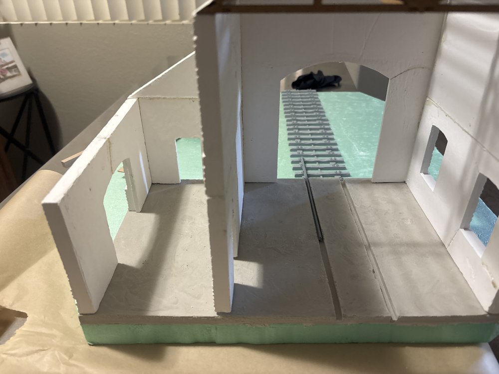 Not going to use the additional walls to the engine house. Going to have covered patio area. Store old locomotive parts. Changed wall on right side where I can use the gate doors. Going to add ramp to patio area for forklift. -
