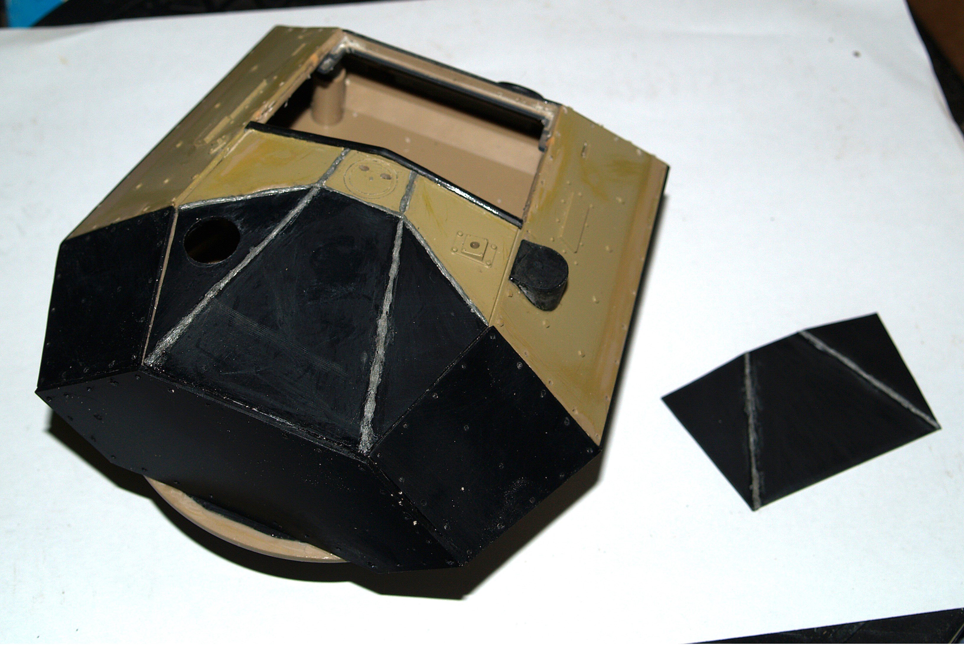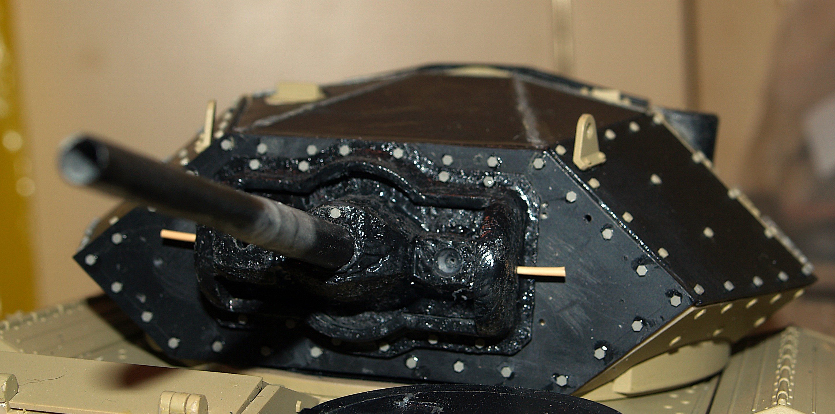 Some archive pic's of the carnage . . . Basic paint , I find red oxide too 'harsh' so use a chocolate brown over black primer . Sorry about the pic quality. Hull surgery - removal of side skirts , correctly centred turret ring and bits. Turret work includes reprofiling the horseshoe shape , narrowing the mantlet (single optic type), adding the '40mm' roof , late cupola , new hatch hinges , gunners visor , anti personnel mine launcher , ventilator and track hangers, and while I was at it , lowered the vision slits on the sides . . . Yadda yadda. . . .