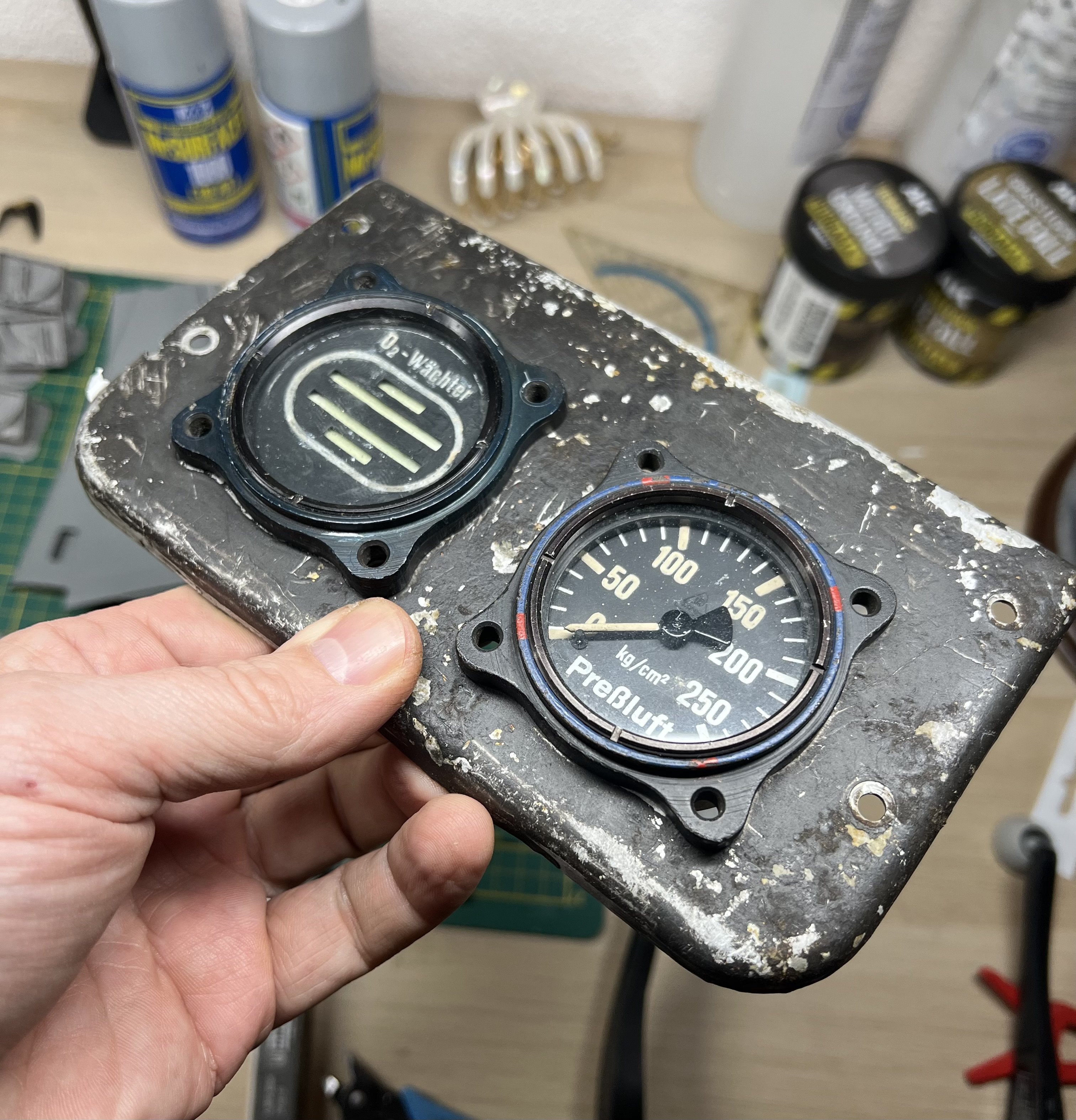So... managed to score this oxygen instrument - panel from the left side of the cockpit wall. Still has most of its RLM66 paint. I might have both instruments in my stash. Need to check. This will go perfect with this build. Not sure on how I'll mount it, but I'll figure something out. -
