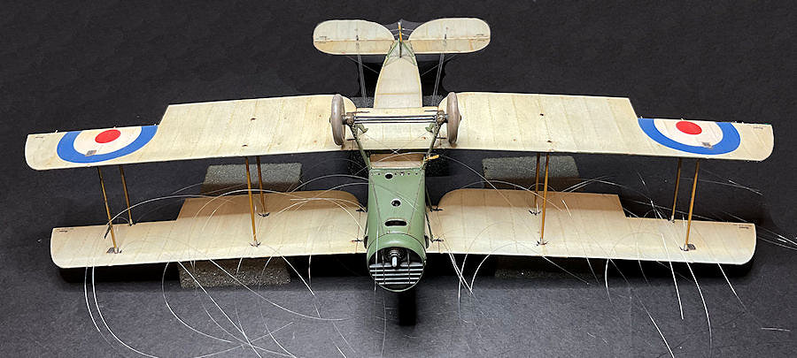 sandbagger Posted October 21, 2023 Author Posted October 21, 2023 Hi all, Upper wing fitted and pre-rigged. In total there are: 6 cabane strut bracing wires 2 drag wires 8 incidence wires 8 landing wires 16 flying wires (8 pairs). Pre-rigged using 0.12 mm diameter mono-filament and 'Gaspatch' 1:48th scale Brutish late turnbuckles (for streamlined wires). Now it's onto final rigging to the lower wings before adding the aileron control cables, Mike 4 1