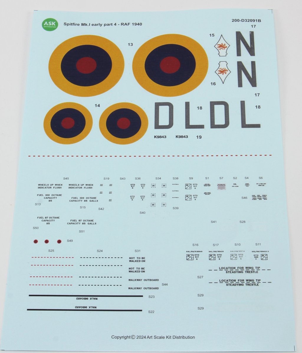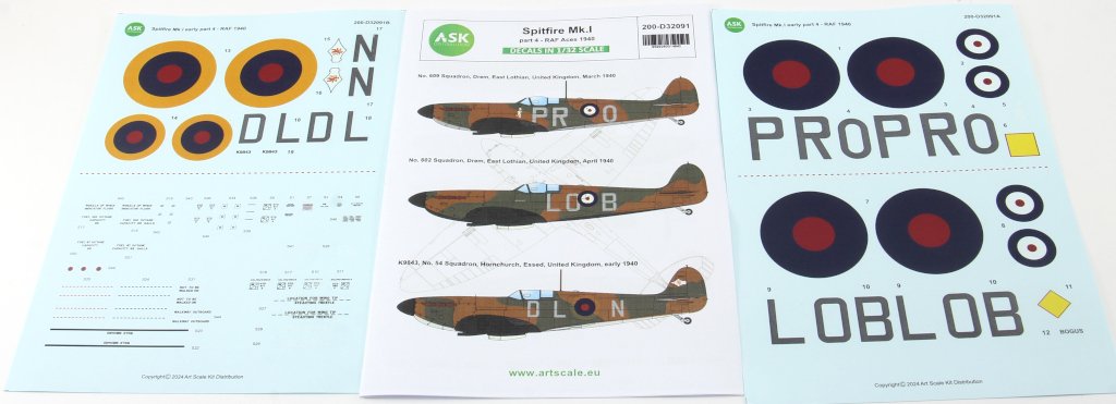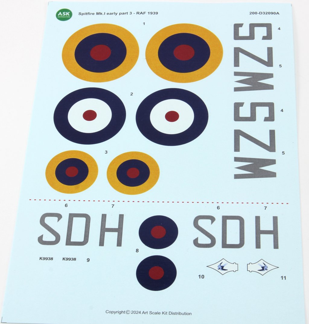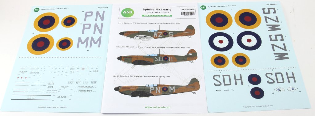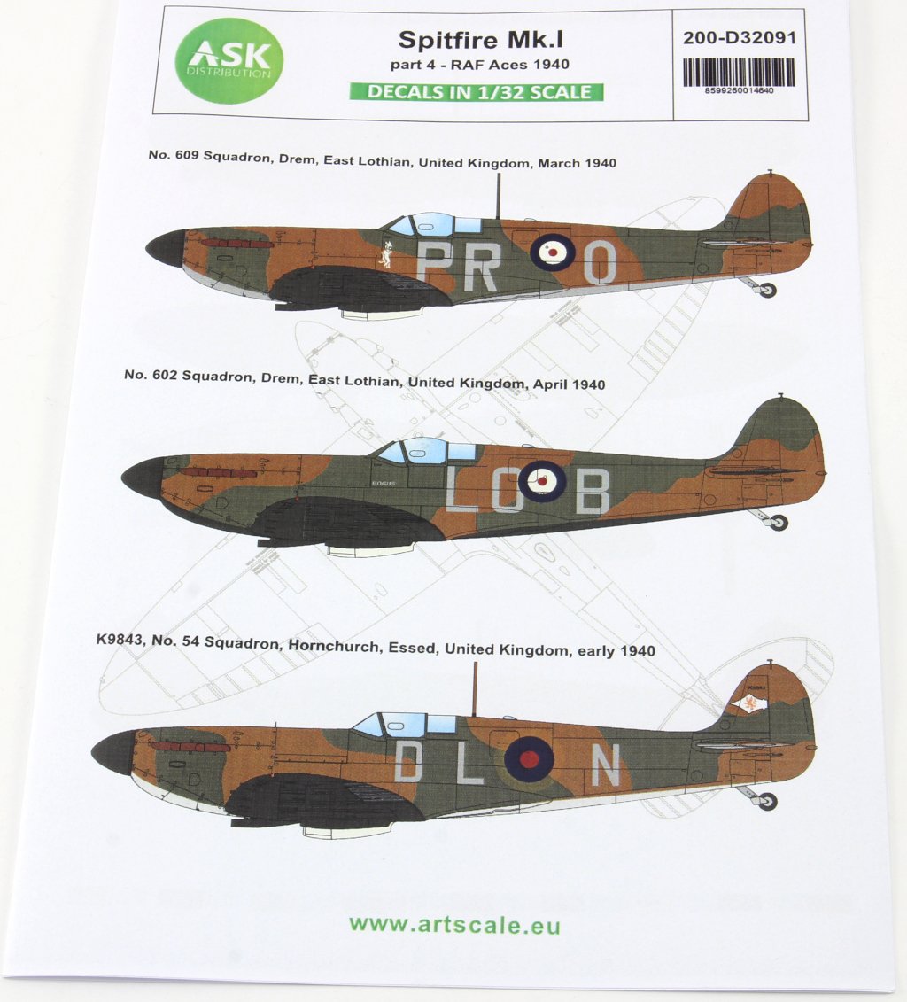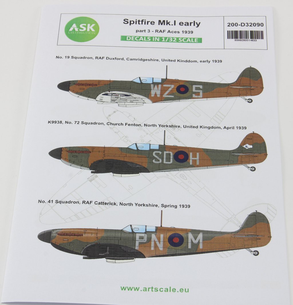 rverissimo Posted Wednesday at 11:25 PM Posted Wednesday at 11:25 PM ASK - Art Scale Kit Decal sheet 1:32 Spitfire Mk.1 Decals ( several sheets) sets available here Introduction Currently available are several 1:32 scale options for the early version of the iconic Spitfire Mk.I, including the highly anticipated release from Kotare Models, which covers the initial variants through to the Mk.Ia (mid-production) and raising the bar in terms of quality, detail and finesse as a reference of the best molds technoly available. The older Hasegawa offering may also serve as a more budget-friendly alternative, for which these decals can be used. These decals were produced in collaboration with Eduard, which in itself is a mark of quality. The printing is of superior standard, with well-defined colours. The roundels are perfectly centred and the decal film is minimal. However, for the more perfectionist modeller, trimming the excess film will help reduce the risk of silvering. The set includes three decal sheets, allowing for a choice between three different liveries, along with a complete set of service stencils and warning markings. Instructions The instructions (printed on an A5 sheet) present the three available liveries with clear four-view profiles, showing the camouflage patterns and decal placement. Suggested paint references include equivalents for the Gunze and MMP ranges. Stencil placement is also thoroughly covered, with dedicated four-view diagrams and notes regarding the use of white decals in cases where the wing is painted black. Also included is a brief historical and operational summary of each aircraft represented. so let's check the sheets! Spitfire Mk.I early part 2 - RAF aces 1938 / 1939 Ref. 200-D32089 price 20,37€ this sheet supplies decals for the following airframes: K9962, flown by S/Ldr. Andrew Farquhar, CO of No. 602 Squadron, RAF Abbotsinch, Renfrewshire, United Kinddom, May 1939 K9906, flown by F/O Robert Stanford Tuck, No. 65 Squadron, RAF Hornchurch, Essex, Summer 1939 K9797, flown by Sgt. George Unwin, No. 19 Squadron, RAF Duxford, Cambridgeshire, United Kingdom, October 1938 Spitfire Mk.I part 32 - RAF aces 1939 Ref. 200-D32090 price 20,37€ This set present the following decorations: (WZ-S) No. 19 Squadron, RAF Duxford, Camridgeshire, United Kinddom, early 1939 K9938, No. 72 Squadron, Church Fenton, North Yorkshire, United Kingdom, April 1939 (PN-M) No. 41 Squadron, RAF Catterick, North Yorkshire, Spring 1939 Spitfire Mk.1 Part 4 – RAF Aces 1940 Ref: 200-D32091 Available here Price: 20,37€ This set present the following decorations: No. 609 Squadron, Drem, East Lothian, United Kingdom, March 1940 No. 602 Squadron, Drem, East Lothian, United Kingdom, April 1940 K9843, No. 54 Squadron, Hornchurch, Essed, United Kingdom, early 1940 Conclusion A highly recommended decal sheet for those looking to depict an early Spitfire, still bearing its pre-WW2 markings—each option unique and appealing in its own way, just as only a Spitfire can be! Many thanks to Art Scale Kit (ASK) for providing the review sheets. Ricardo Veríssimo