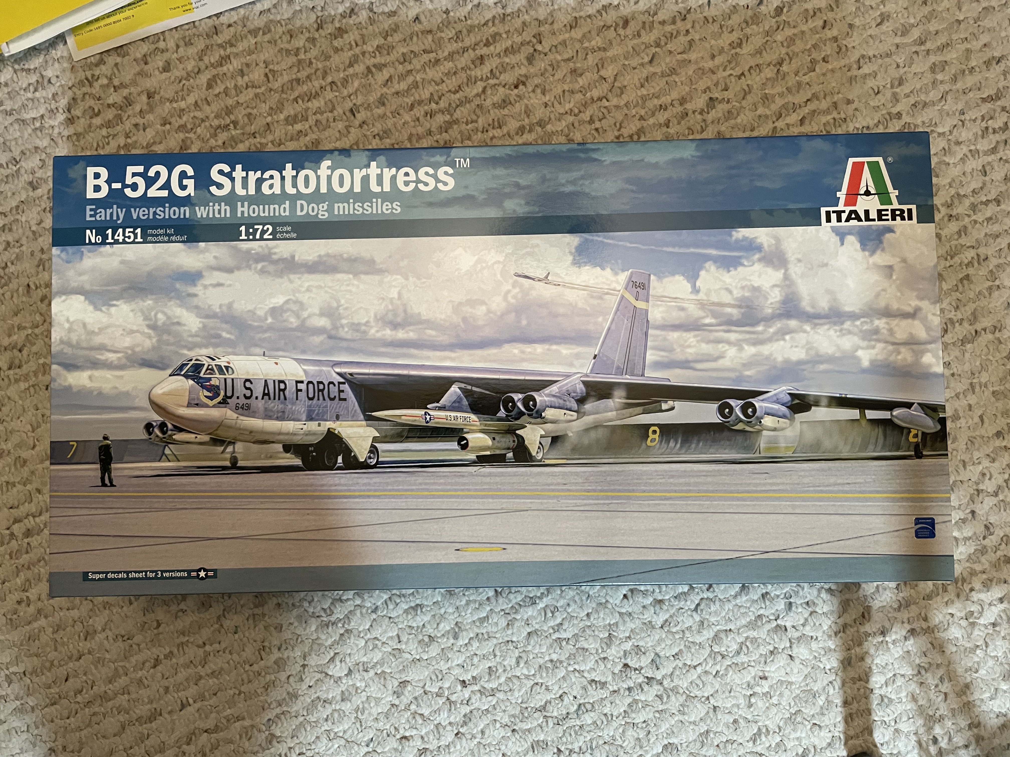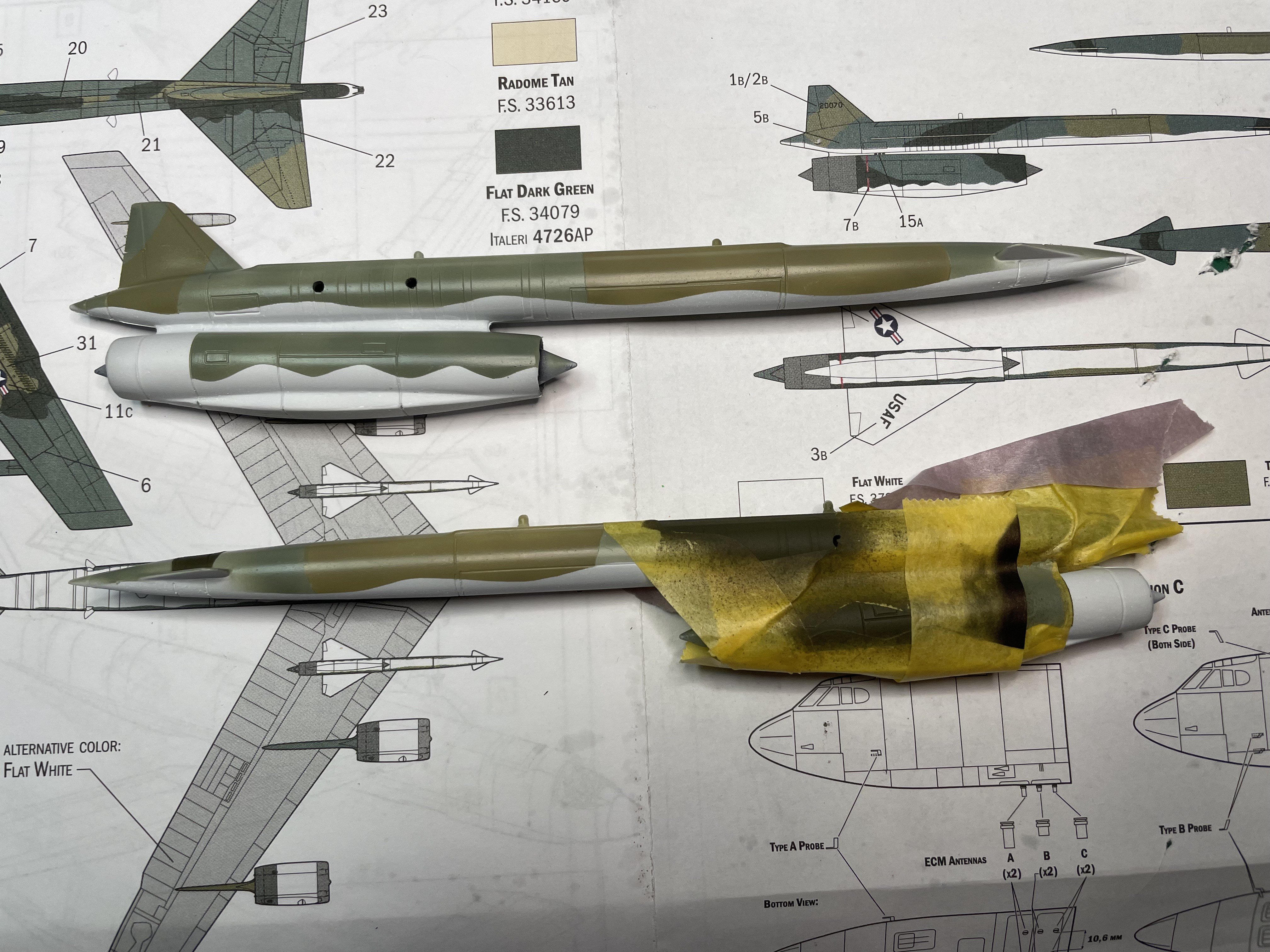 CANicoll Posted 19 hours ago Posted 19 hours ago Hi all! I'm kinda back. Too much having gone on and going on to get into, so let's jump into this build. A friend has a huge collection of mostly diecast planes but does not have a B-52. We are trading this build for a nice Burbon (of which I have so little knowledge to be useless on the subject). But my friend has over 500 bottles and knows his stuff. Sorry to be so absent - I'm sure I've missed a lot of what you all have going on. Have missed you all! Here is the kit, however I will be doing one out of Barksdale AFB in SEA camo: I debated on the Italeri or the Modelcollect but my friend bought the Italeri kit so here we go. This thing is MASSIVE.. OMG. There is literally NO detail in the bomb bays, and the early G's did not have wing pylons for bombs. Just the nuclear Hound Dog missiles which were never used in Vietnam. But my friend wants the missiles, so... The build will be showing 'in-flight' and I'm thinking of printing off an aerial shot of a Vietnam bomb run and having this 'fly' over the picture, attached to a picture/display frame. More on this later... Kinda disappointed in the cockpit, but it is 1/72 so it is not as bad as it could be. However, it turns out I used the wrong IP. There were 2: One flat panel intended for use with the IP decal, and a panel with the raised gauges, switches, displays, etc. Yeah, I used that one for the decal with tons of setting solution. However, in this scale, through the cockpit windows, will anything be seen?? Isn't that nice! They had a bed in the cockpit... Since my friend wanted the missiles, here they are, getting their camo. I'm primarily using MRP paints but could not get the Flat Dark Green in MRP so thought I would try the AK Interactive paints. I can't decide if that is a mistake or not. I failed to ready any reviews before I bought a couple of bottles of the Dark Green (did I mention this is a huge plane??). Lots of reports of sputtering even with thinning, that the paint doesn't thin well with their own thinner, and various concoctions of other thinners, retarders and what-have-you. I bit the bullet, thinned it about 50% with the AK thinner and stirred the heck out of it. Still seemed to separate in the cup. Weird. However, the Dark Green, despite sputtering a lot while spraying, seems to have sprayed pretty smoothly. Anyone have thoughts about the AK paints? More to come! 2