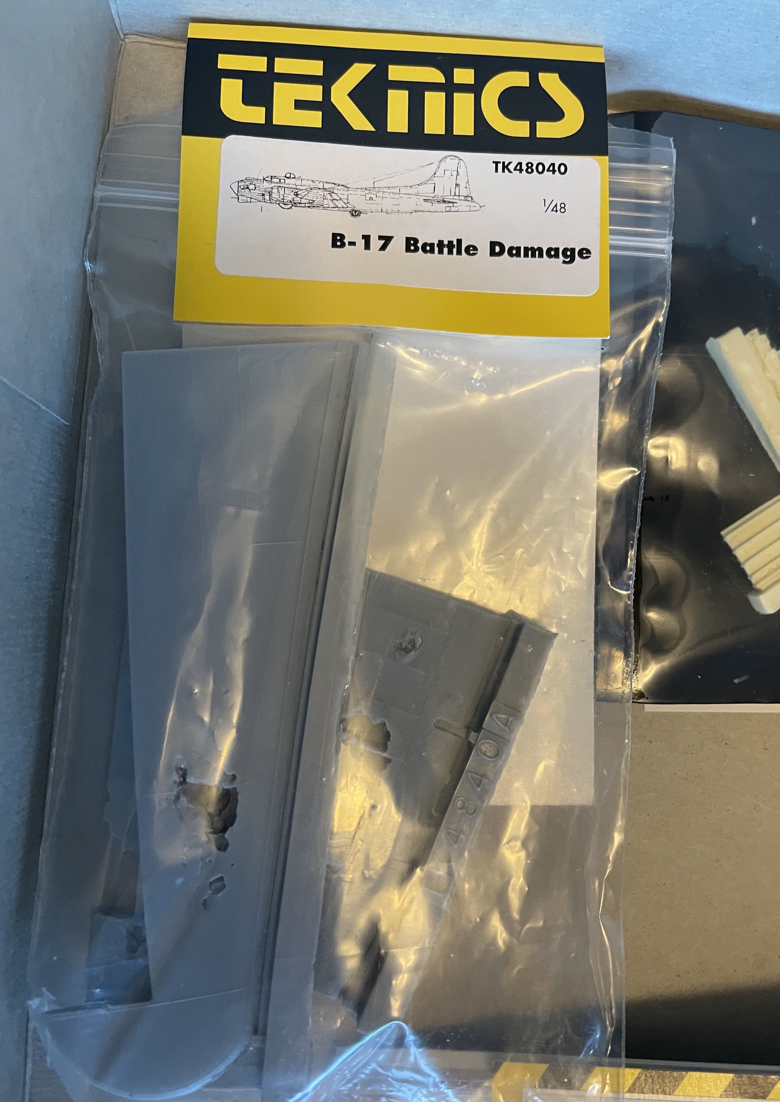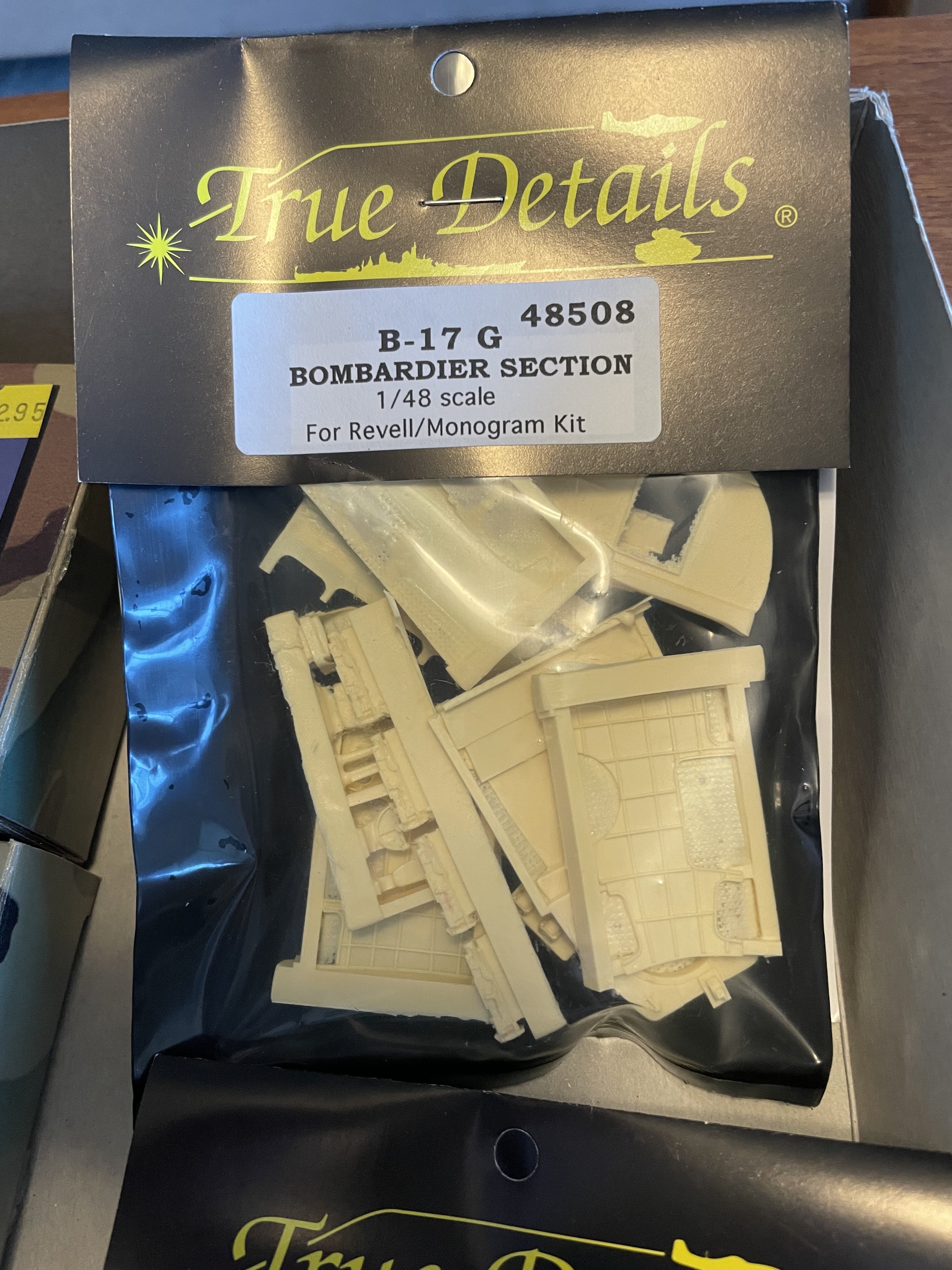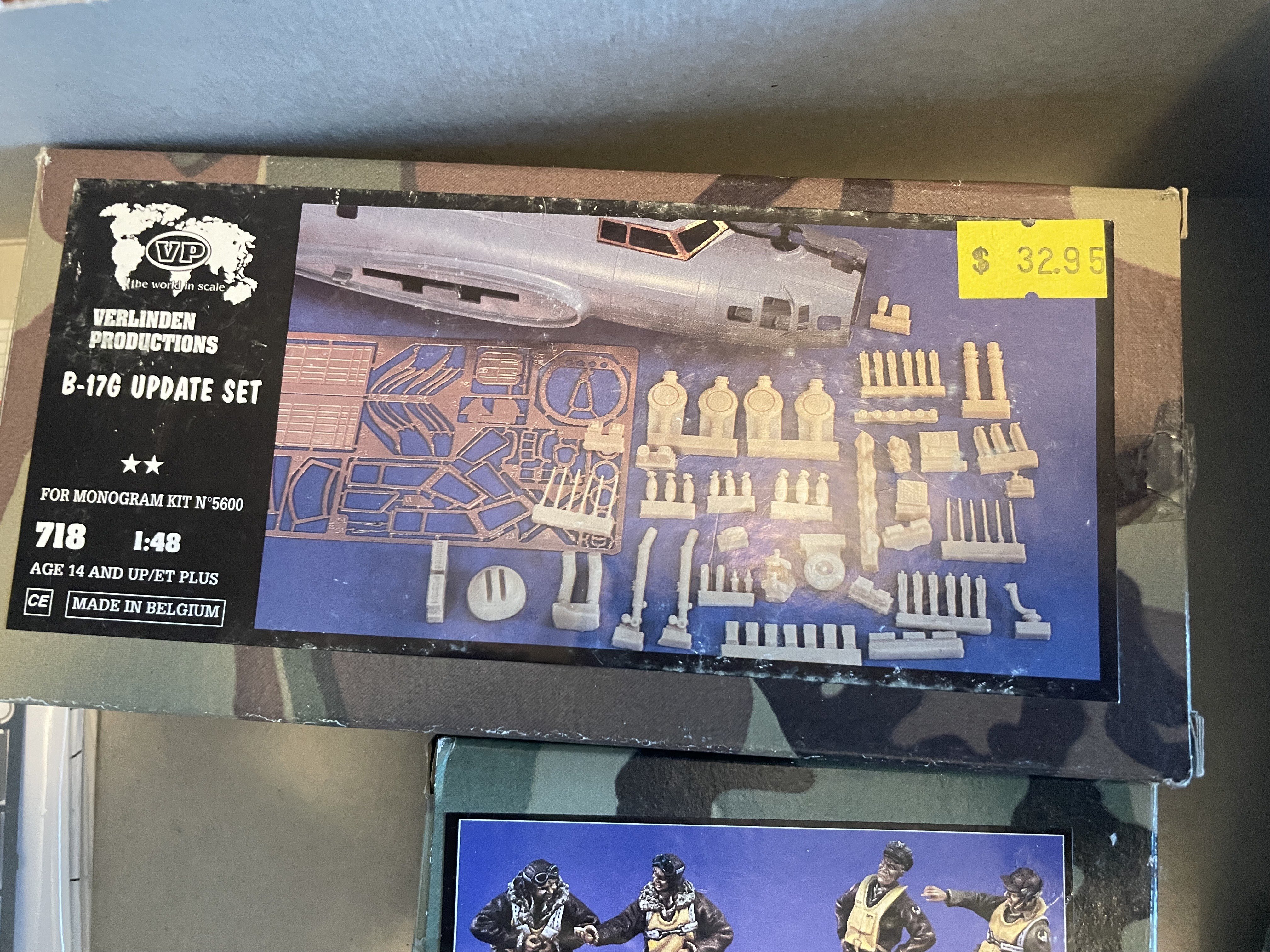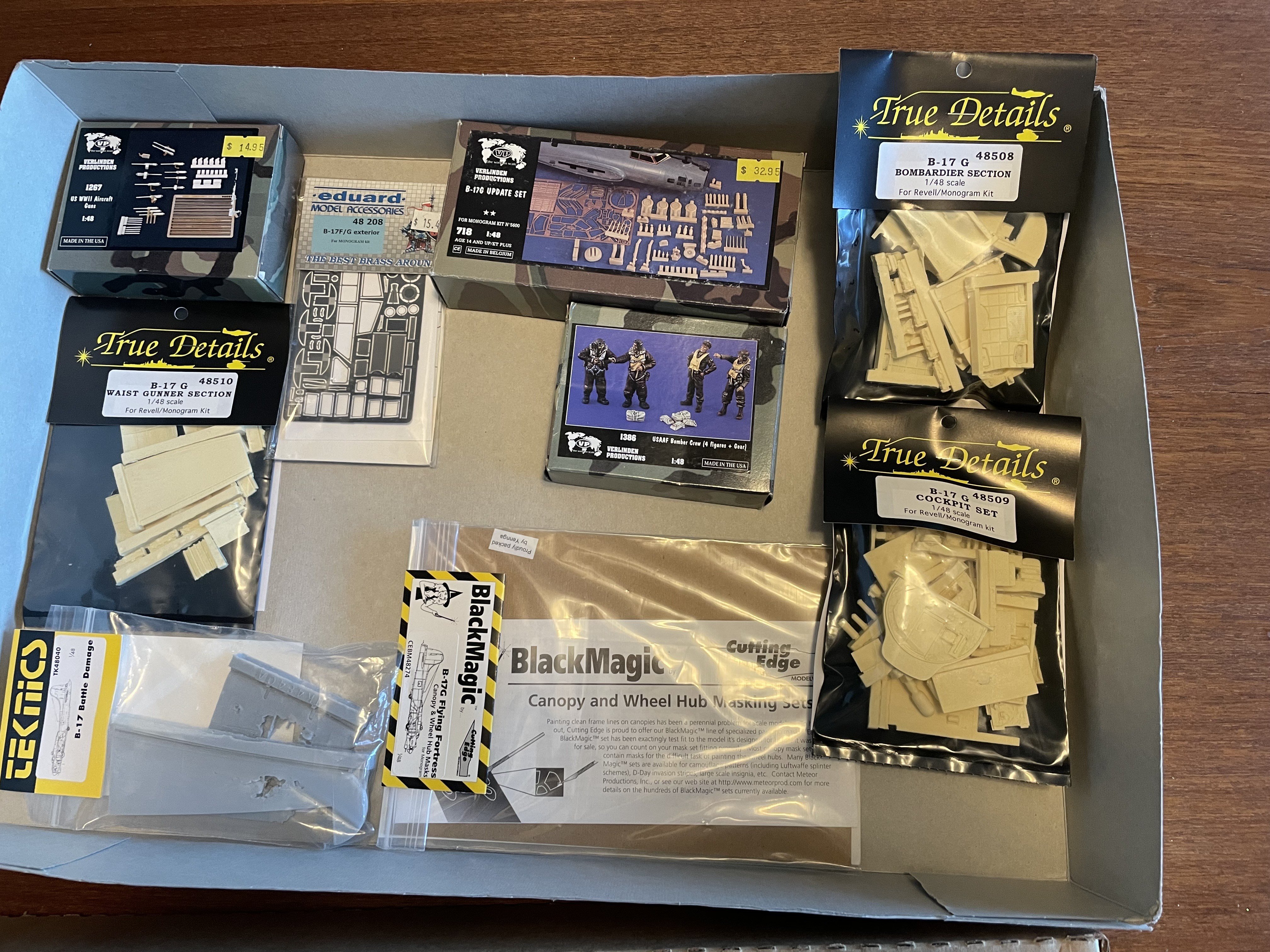 CANicoll Posted 19 hours ago Posted 19 hours ago Friends, Have decided to part with this find from my closet. This is the venerable Monogram B-17G kit, number 5600, with lots of goodies to spruce up the inside and out. Nothing started and best as I can tell all of the sets are complete - they have been sitting in this box for who knows how many years! If you want to see inside the AM boxes, let me know and I'll post more pictures. Best as I can tell, all the bits and the kit add up (on EBay anyway) to about $250-$275 plus shipping. The Teknics Battle Damage and the Verlinden update together go for over $100 on Ebay. Crazy. Looking to let everything go for $125 plus shipping. I can't see myself getting into this kit, with this much AM. Maybe if it was a late-production G with the staggered waist positions then I could do my late-friend's B-17G. But nope! Any takers?