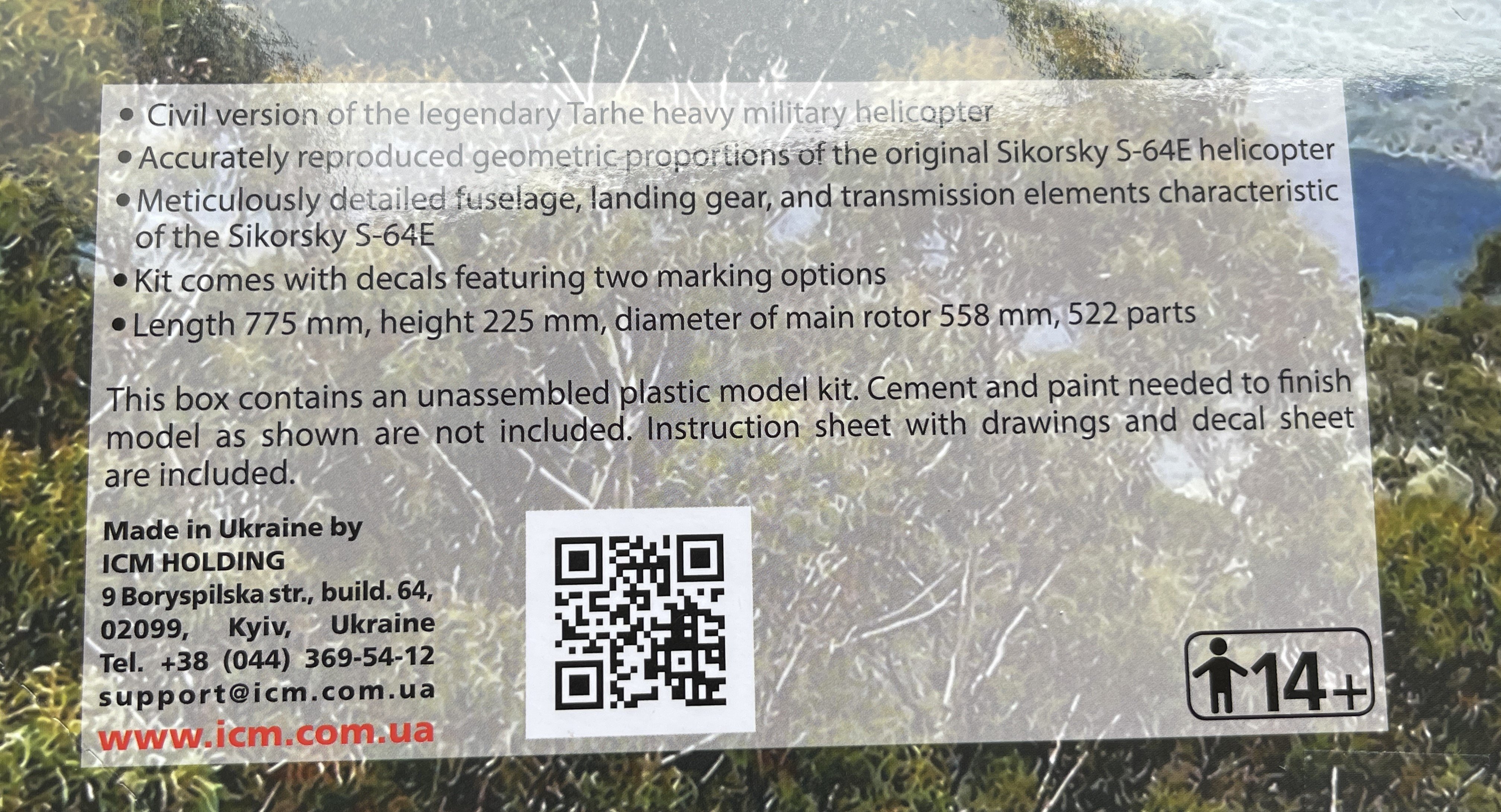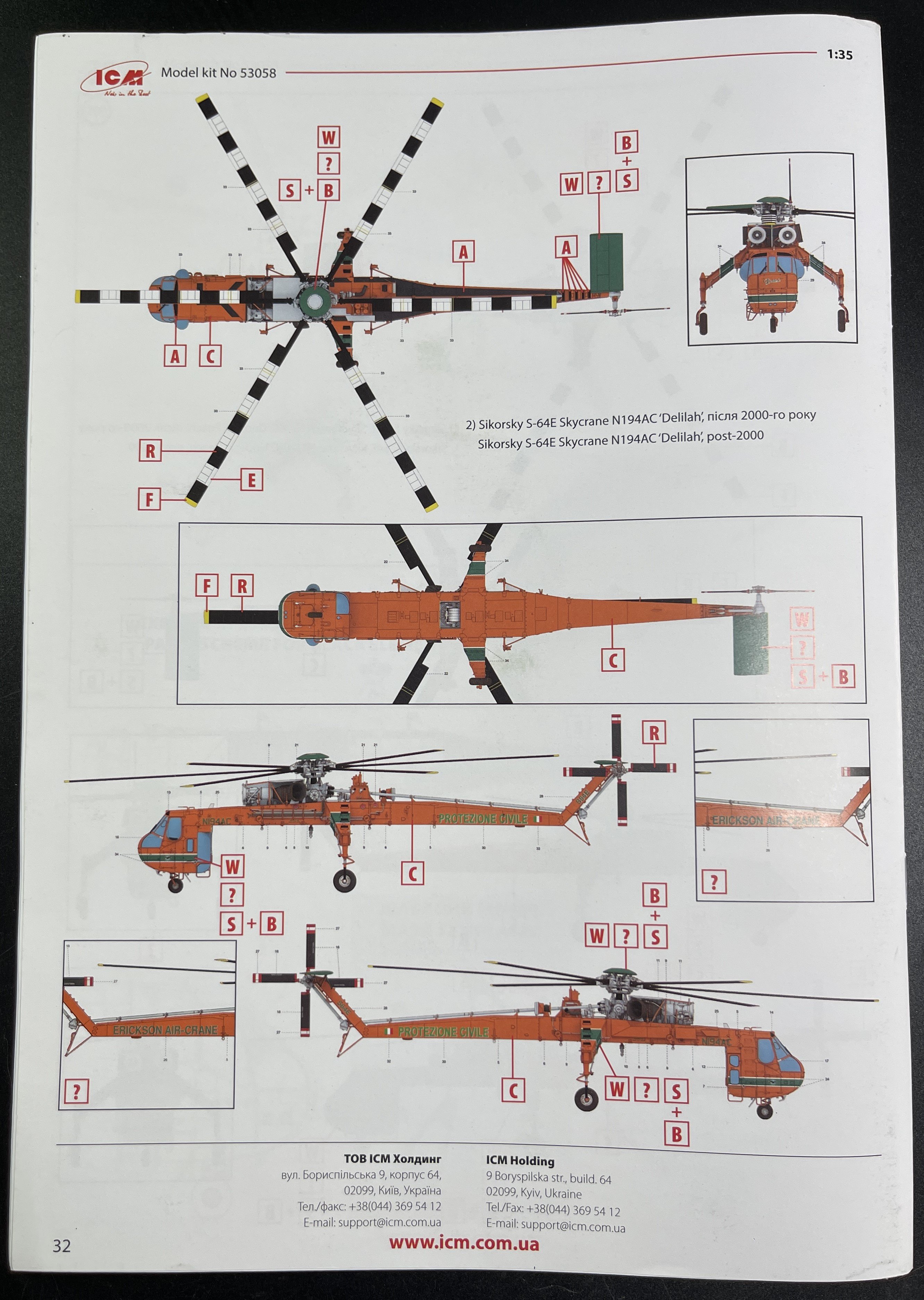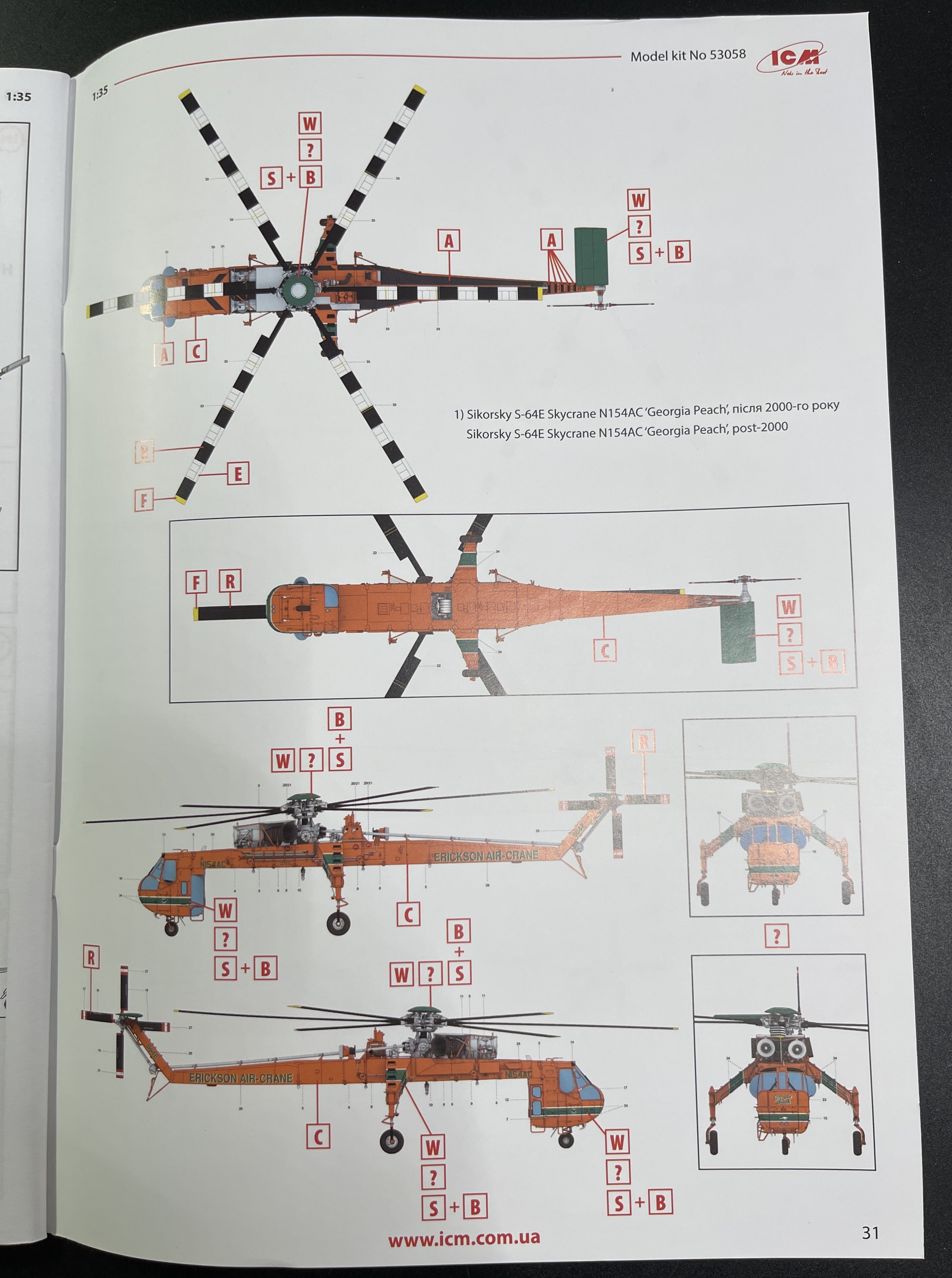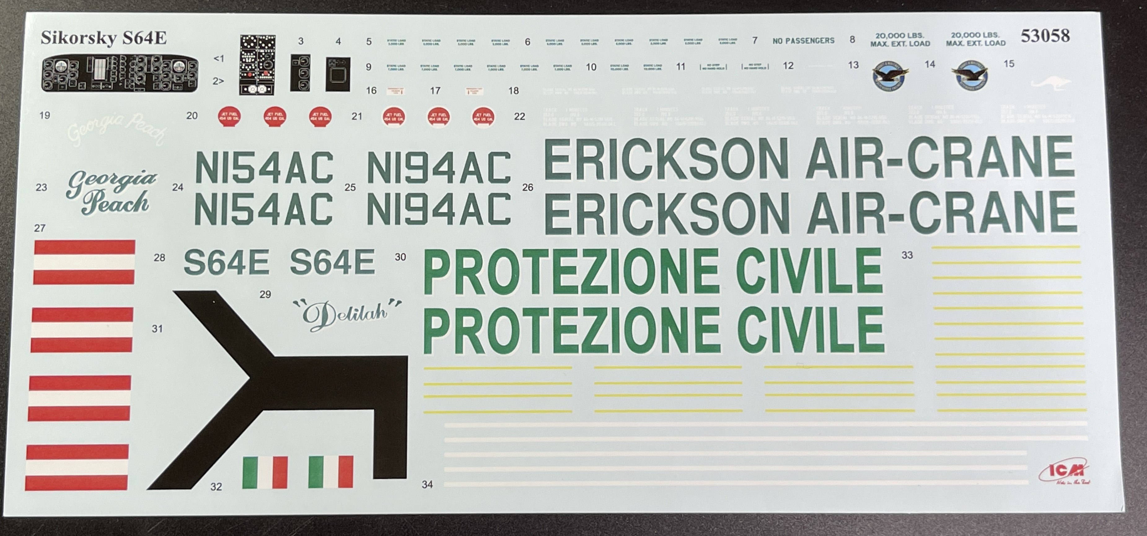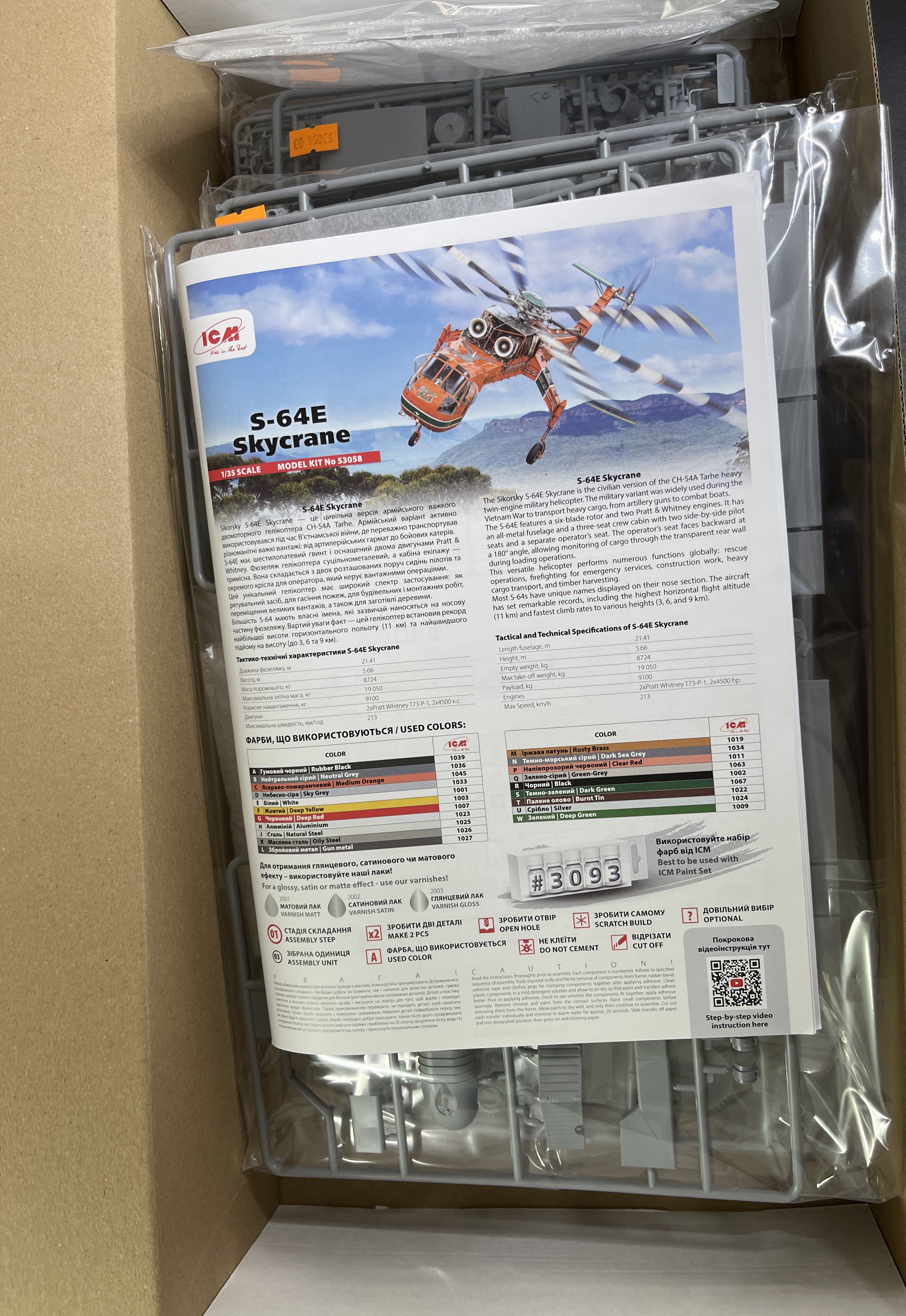Administrators Fran Posted Sunday at 10:06 PM Administrators Posted Sunday at 10:06 PM 1:35 S-64E Skycrane Cat n.º 53058 Price tag: €139,50 Available here ICM done it again. A huge Sky Crane hit the shelves once again but this time is the Civilian Version I already had the privilege to review the Military version, the CH-54, so I will check this review in terms to see the new parts to make the civilian version. There is a lot of video of the S-64 in flight - https://www.youtube.com/watch?v=cXTrWevjjro This particular version almost the one on this box (this one on the video is “Elvis”. https://www.youtube.com/watch?v=e36yFXl35Mo And in this page, a lot of pictures of several S-64E. The sky is the limit! https://www.jetphotos.com/aircraft/Sikorsky S-64E Skycrane Here are some pictures of the real thing... ICM where is the water tank? Please do it! As for the military version, the box is the same size (very big one) and with full of plastic. The plastic is typical from ICM, in grey colour, with very good surface details as are all ICM models kits. In my model I have some moulding lines that are easy removed and perfectly normal in a standard model kit. Don't have any flash. The moulding quality is quite good in all dimensions, large parts and very small parts. The surface detail is quite good, actually, is best one I have ever seen in an ICM model kit so far. Next review it will be the Hampden so let’s see if it surpasses the Sikorsky. We already have a pleasure to review the previous release of the CH-54 so the main thing is to find whats is in this box that is different from the Military version besides, the obvious decals. Comparing with the military version, this civilian version has more three sprues, the N, the L and the M. All others are the same but there`s a lot of parts not to use. You will get, by the end, a lot of spare parts. Starting with the clear parts, this version brings in the N Sprue the side windows with the bubble side (sorry if that is not the correct word for it) so the pilot and co-pilot can have a much clear view to the ground. The new clear sprue: The L sprue, gives the modeler, new front reactors, new instruments panels, new side instruments, and mainly a all-new upper main body. Finally, the M sprue brings some extra parts as turnbuckles, struts, hinges and others small details. As for seatbelts, ICM don’t give them moulded on the seat (thanks!!!) but also don’t give any PE (as they don’t have outsourcing – it`s a all in product) so you will have to source out somewhere, either aftermarket either scratchbuild. As overall, the plastic quality is impressive, with nice molding, sharp details, and no major flash. External features like rivets, panel lines, and structural elements are well-reproduced, enhancing visibility under paint. The engine bays are nearly fully exposed, inviting weathering and aftermarket enhancements like wiring or resin details and there`s a lot of AM for the Sikorsky. The decal sheet is a quite large one, very well printed, with good color and pigment saturation. The sidedown is only two schemes : Erickson Air-Crane N154AC "Georgia Peach" Protezione Civile N194AC "Delilah" Some of the decals are quite big so be careful in handling and placement. The instructions booklet The instruction book is a A4 size with 32 pages with the first and last page in glossy paper. The instructions are easy to follow, with very good drawings with good parts identification and indication where to fit. The colour indication. Not my first time telling this but one of ICM CEO said, in one podcast (Models from Ukraine) that ICM wants to be an “all in company” so all the ICM production is a vertical one, they made the CAD, the steel molds, the decals and now they are making also paints. It`s, in fact an all new approach in the modelling world but ICM is getting there because I already saw, finally, in one of my usual model shop (Art Scale Kits) ICM paints on sale. So the colour being only ICM references starts to be a non-issue to the novice modeler (attention, this particular modeler is not for the novice one) that simply can get some ICM paints quite easily in a foreseeing future. As usual, in all ICM kits now, there`s masking tape template. Conclusion: Again, ICM clearly wants to give to all modellers, a quite good direct products straight from the box, and they actually did it very well and leaving room for the aftermarket players and to modellers that want a little more detail. Surface panels line detail is very pleasing and the intakes, engines and transmission provide a lot of detail straight from the box. Just one low.... Please ICM gives us a the water tank and all the gear associated!! You can make a impressive and quite detail replica straight from the box and that`s something and I totally understand that ICM wanted to get there, as after all it`s not a cheap kit and it couldn’t be cheap! Is enormous and FANTASTIC and Its CIVILIAN! So it’s a perfect to all even to Military Modeller.. VERY HIGHLY RECOMMEND