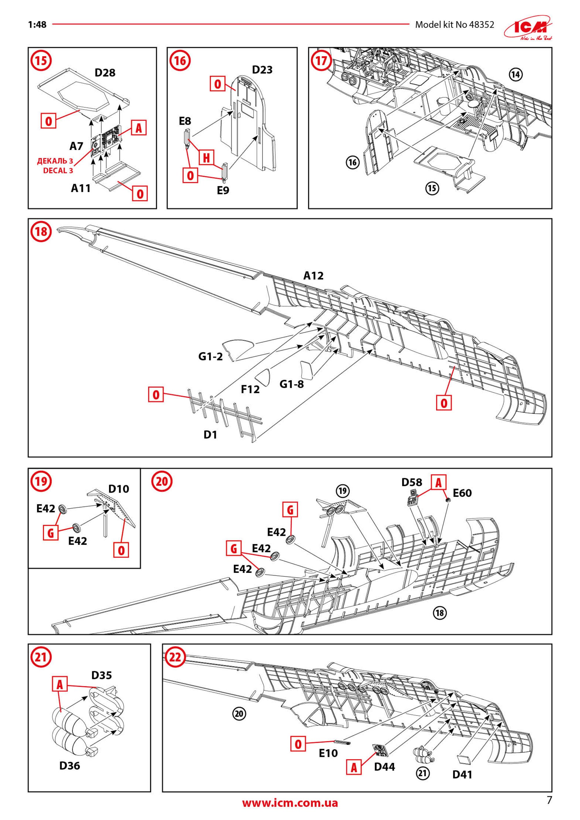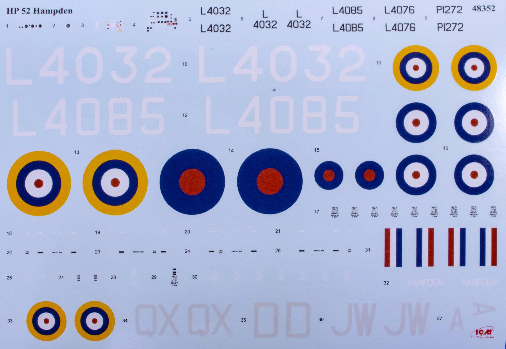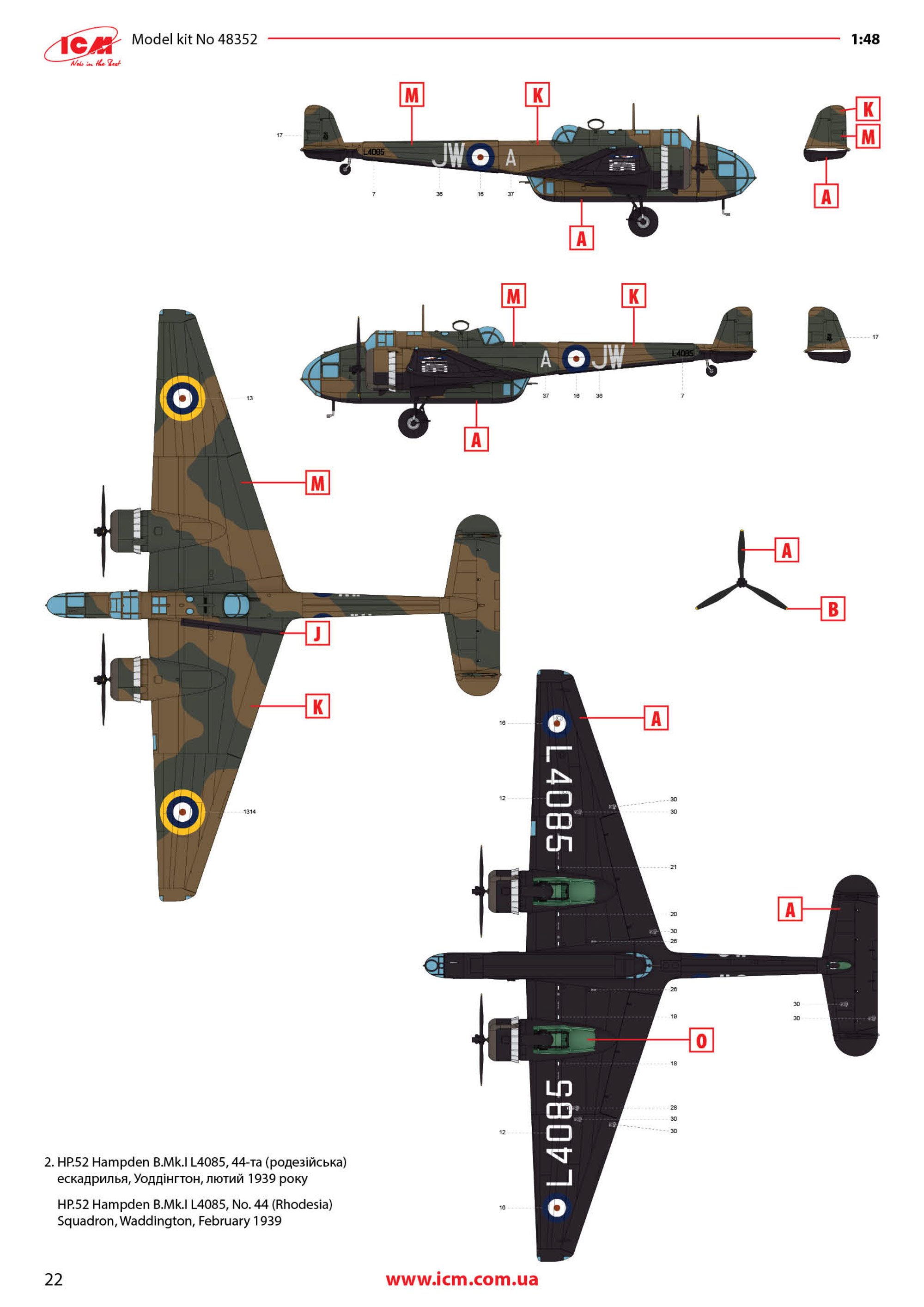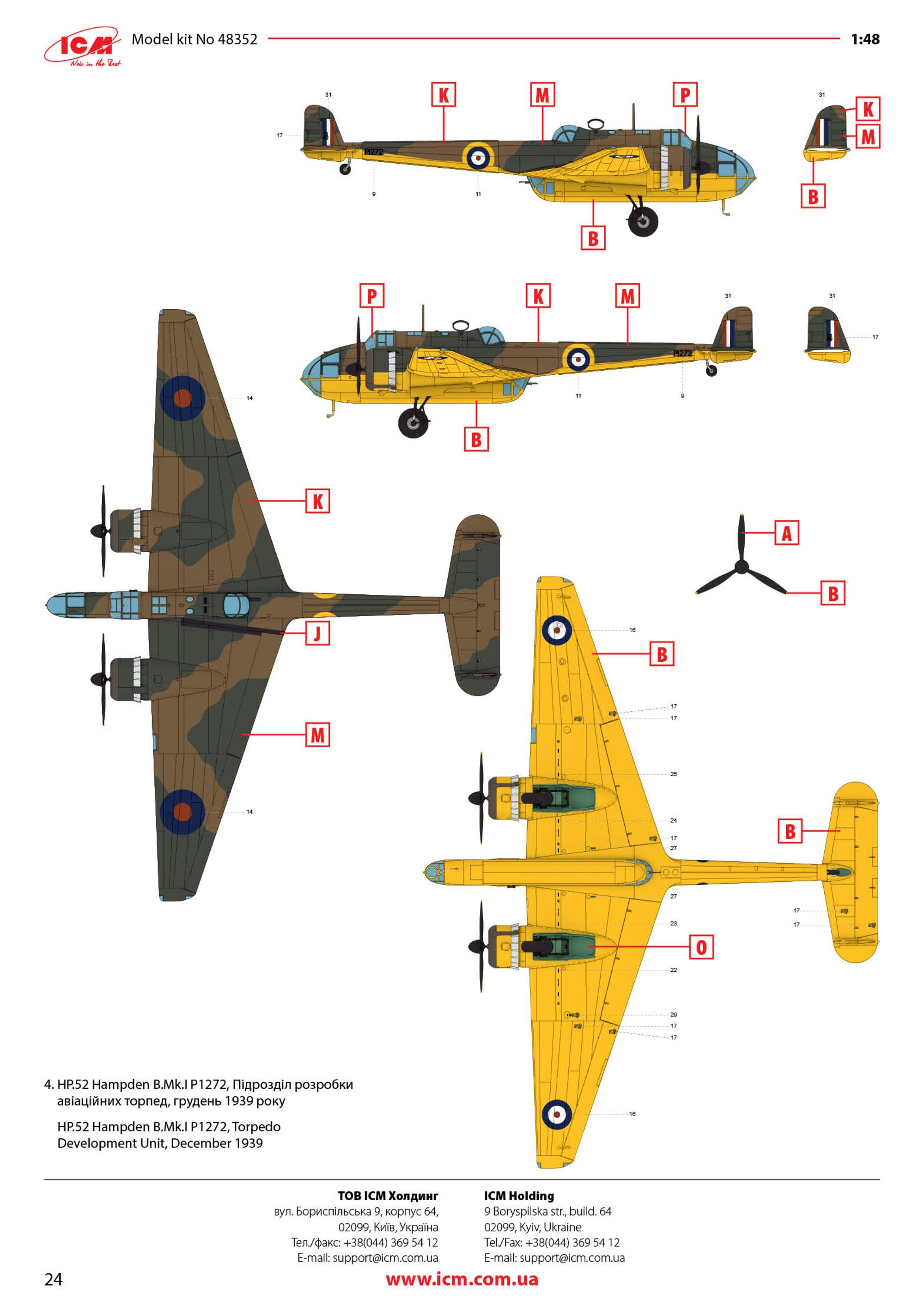 Administrators JayDee Posted Saturday at 12:24 PM Administrators Posted Saturday at 12:24 PM 1:48 HP.52 Hampden B.Mk.I ICM Catalogue # 48352 Available from Jadlam for £62.95 he Handley Page HP.52 Hampden B.Mk.I was a British twin-engine medium bomber developed in the 1930s to meet the Royal Air Force’s requirement under Air Ministry Specification B.9/32 for a fast, modern bomber. Designed by Handley Page and first flown on 21 June 1936, the Hampden featured a distinctive slender fuselage and stressed-skin all-metal construction with two Bristol Pegasus radial engines. Its compact, streamlined shape earned it nicknames such as the “Flying Suitcase” or “Flying Tadpole” from crews, who also found its interior extremely cramped for the four-man team of pilot, navigator/bomb-aimer, wireless operator and gunner. Early production Hampden B.Mk.I’s were ordered in 1936 and began entering squadron service by late 1938 with units such as No. 49 Squadron RAF. When the Second World War broke out in 1939, the Hampden was one of the main bombers in RAF Bomber Command’s arsenal and flew a wide range of missions in the early part of the air war over Europe. It participated in night bombing operations, including the first RAF raid on Berlin in 1940 and the massive 1,000-aircraft raid on Cologne in May 1942, and was used for leaflet drops, mine-laying over the North Sea and other strategic tasks. Despite respectable speed and manoeuvrability for its time, the Hampden’s defensive armament was initially too light to protect it effectively from enemy fighters, which eventually saw its role in daytime raids fade as losses mounted. By late 1942, Hampdens were being withdrawn from front-line Bomber Command duties. After leaving the main bomber force, many Hampden B.Mk.I aircraft found a second life in Coastal Command, where they were adapted for torpedo-bomber and maritime reconnaissance roles through 1943. Modifications included deeper bomb bays to carry torpedoes and additional under-wing racks, enabling the type to serve in anti-shipping missions until the end of its operational career. A total of around 1,430 Hampden aircraft were built in the UK and Canada before production ceased in 1942, and although none remain in flying condition today, several examples survive in museums or under restoration, preserving the legacy of this early wartime workhorse. The kit As is standard with ICM kits, the Hampden is packaged into a rigid, corrugated box with a top opening flap, and a separate glossy lid that sits atop it. Inside the box, there are three resealable cellophane sleeves that contain a total of NINE medium grey styrene sprues, and a further TWO in clear styrene. The latter sprues are also wrapped in foam and separately bagged within the main sleeve too. A full colour 24-page instruction booklet and decal sheet are also included. At the time of writing, there is also a follow-up Hampden release, but despite that, the parts breakdown will require all items on this sprue to be used in this build. The most obvious are those fuselage halves, showing what a narrow width aircraft this was, and must've been fairly cramped in comparison with contemporary aircraft of this type. Unusually for ICM, the whole external airframe is also riveted! The rivet detail is perfectly subtle and will look great with a little dirt and weather over it. Internally, the fuselage has a wealth if stringer and former detail that'll be hidden amongst the avionics you will install. The long inner floor is also here, and on there other side, it doubles for the bomb bay ceiling at the rearmost area. As this is a universal part between Hampden releases, you will need to drill out a series of holes for the munitions mounts. This is clearly seen in the manual. Also moulded here are the aft access hatch, open/closed bomb bay door options, radio equipment, and aileron wing mounts. This is the first of two sprues that contain wing parts; starboard upper and port lower. Wings are moulded with separate ailerons and landing flaps of which you can see them here, typically provided as halves. The tail lower fin halves are moulded here too. The next sprue contains the other two wing halves. You will find more control surface parts here, as well as the rudders and internal wing reinforcing structures. Most of the cockpit elements are to be found on this sprue, as well as bulkheads and stabiliser upper/lower halves. There are TWO of these sprues included, containing many of those items duplicated around the airframe, such as engines, props, main gear bay doors, cowl sections, fins, main gear struts, and wheels. Detail is excellent throughout with some decals also supplied to supplement some of the finer cockpit detail parts. THREE of these sprues are included, but quite a few of the parts here will be relegated to your spares box. Bomb racks are moulded on this sprue, for use with this release. Both of these sprues are crystal clear; something I can never clearly show in my photos. Some of these parts have options present too, depending on which machine you will opt to build. Framing lines are also sharp, meaning masking should be quite easy. Mask templates are included in the manual, but to be honest, I'd likely decide to use a set of pre-cut masks from Eduard etc. Decals A single decal sheet is included that contains markings for FOUR machines. Printing is excellent, with the inking being thin with solid colour, minimal carrier film and perfect registration. Marking options are: HP.52 Hampden B.Mk.I L4032, the first production Hampden, Radlett, June 1938 HP.52 Hampden B.Mk.I L4085, No. 44 (Rhodesia) Squadron, Waddington, February 1939 HP.52 Hampden B.Mk.I L4076, No. 50 Squadron, Waddington, September 1939 HP.52 Hampden B.Mk.I P1272, Torpedo Development Unit, December 1939 Instructions The 24 page manual is printed in full colour, with clear line drawings for each step of construction. Plenty of clear annotation is supplied for specific de