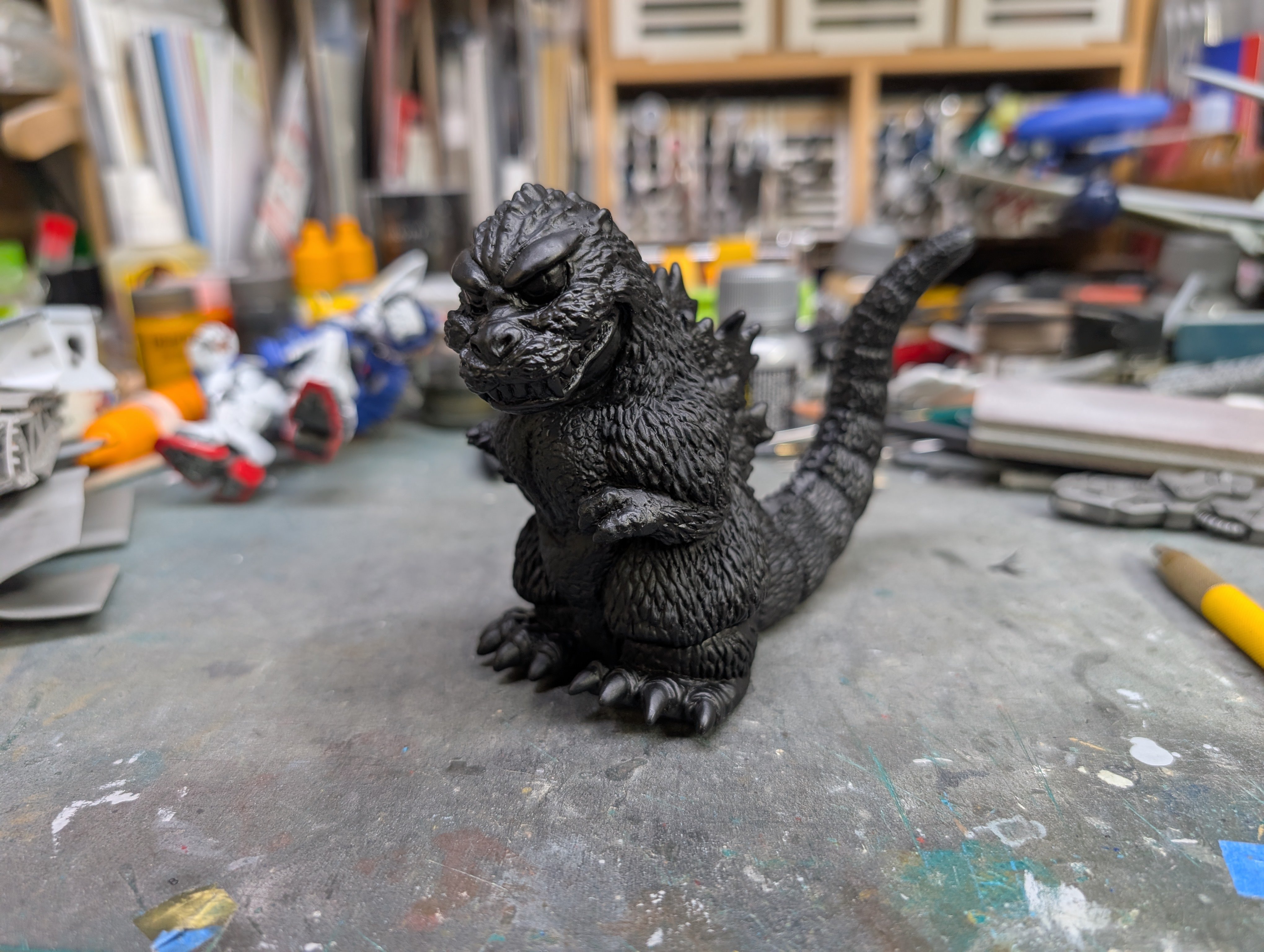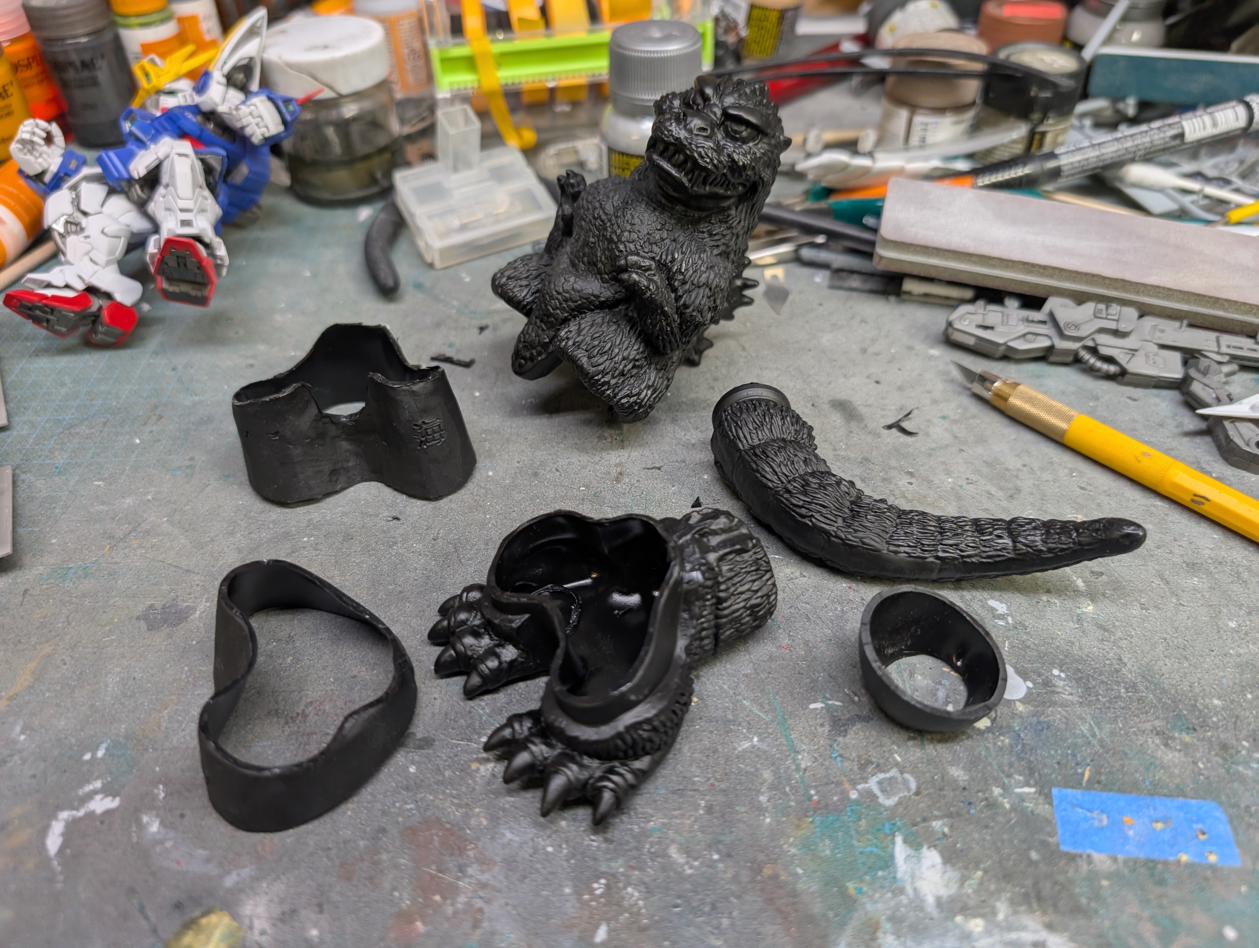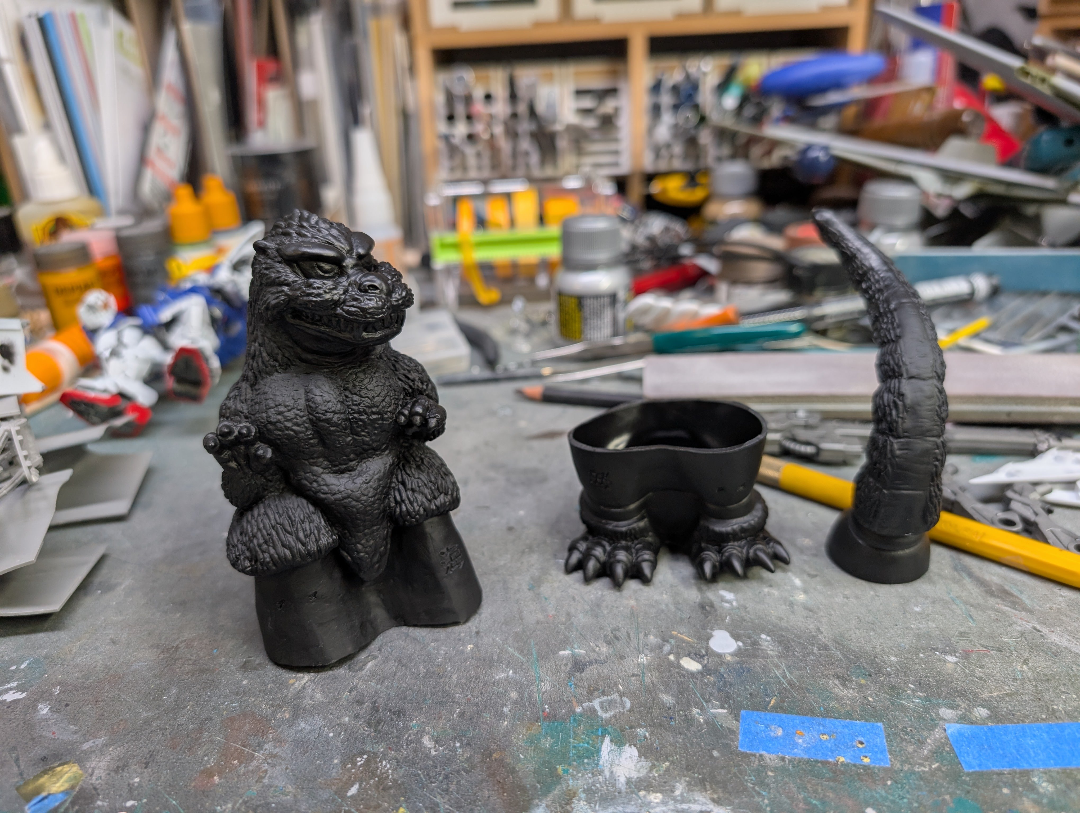 BlrwestSiR Posted 48 minutes ago Posted 48 minutes ago Japanese garage kits back in the '80s and '90s featured a lot of unlicensed vinyl models. Mostly figures but also vehicles. A few have recently been reissued and are even licenced now. That's the case with this Chibi Godzilla I picked up last year. Made by Kaiyodo, it even has a trademark registration on it. It's a simple kit, just three parts. The excess vinyl gets trimmed off. They generally put in some cut lines to help guide you. Tail and lower body press fit together. Then add the upper body and the assembly is done. Now the fun part- the paint job. 1