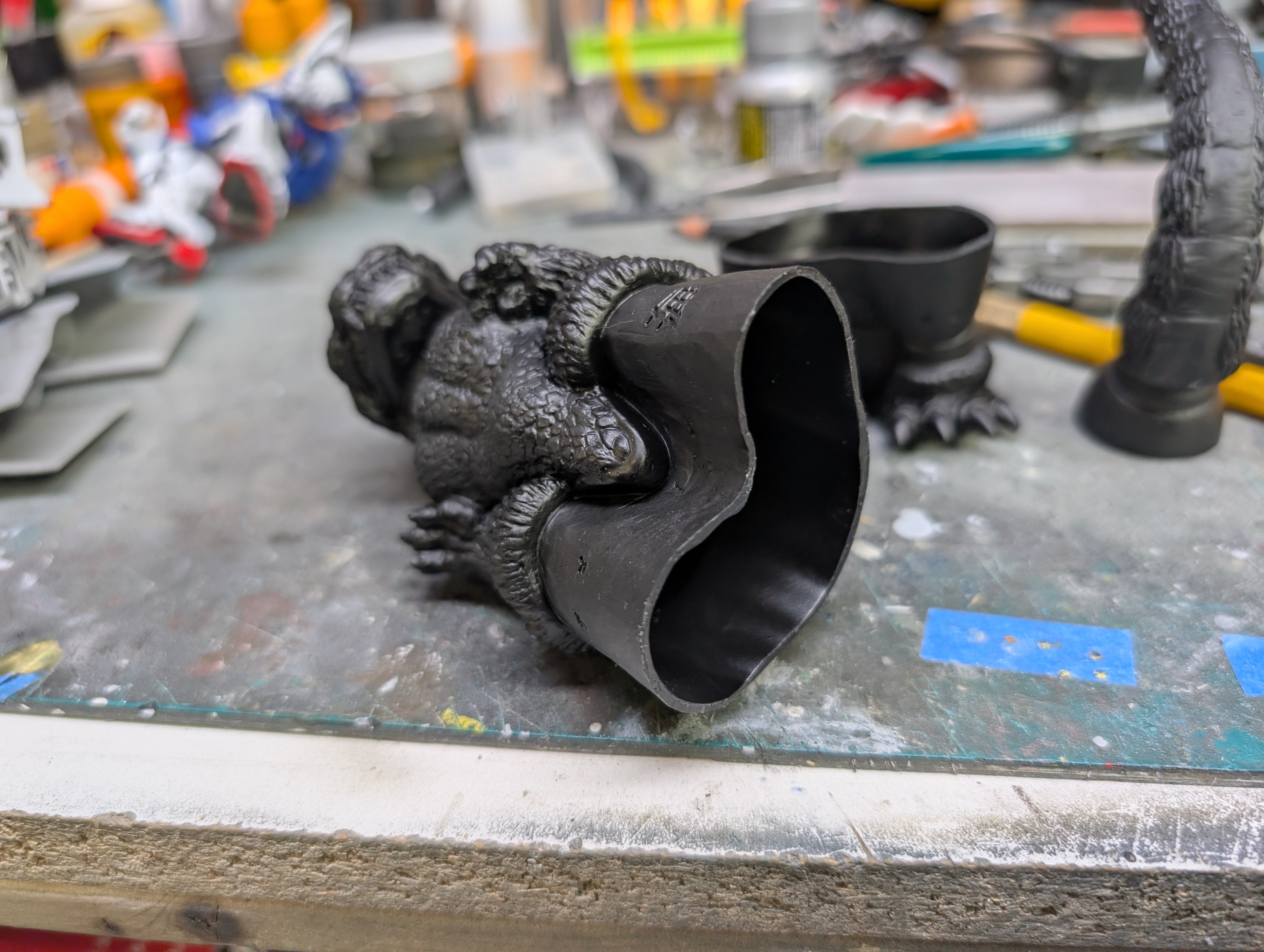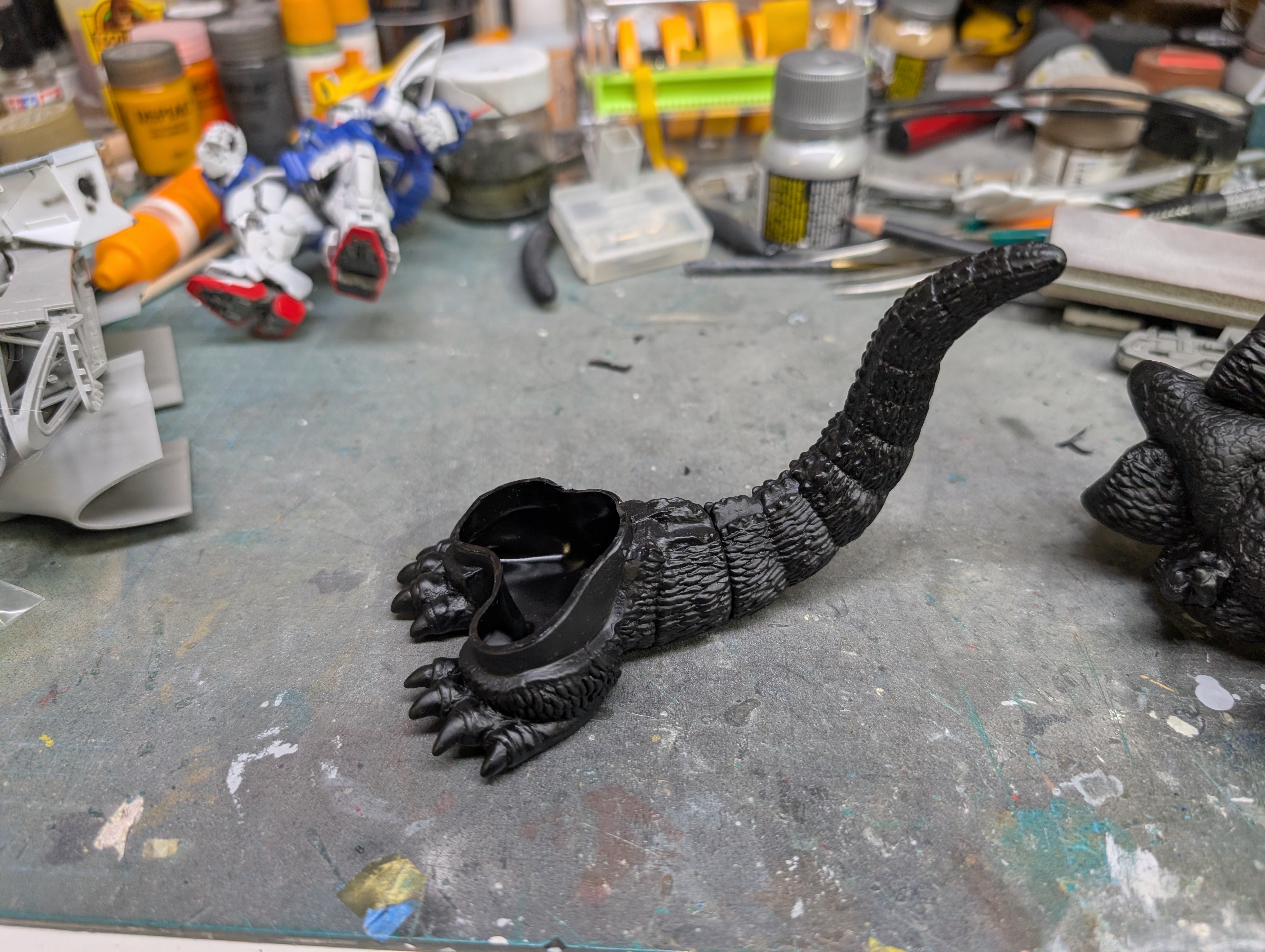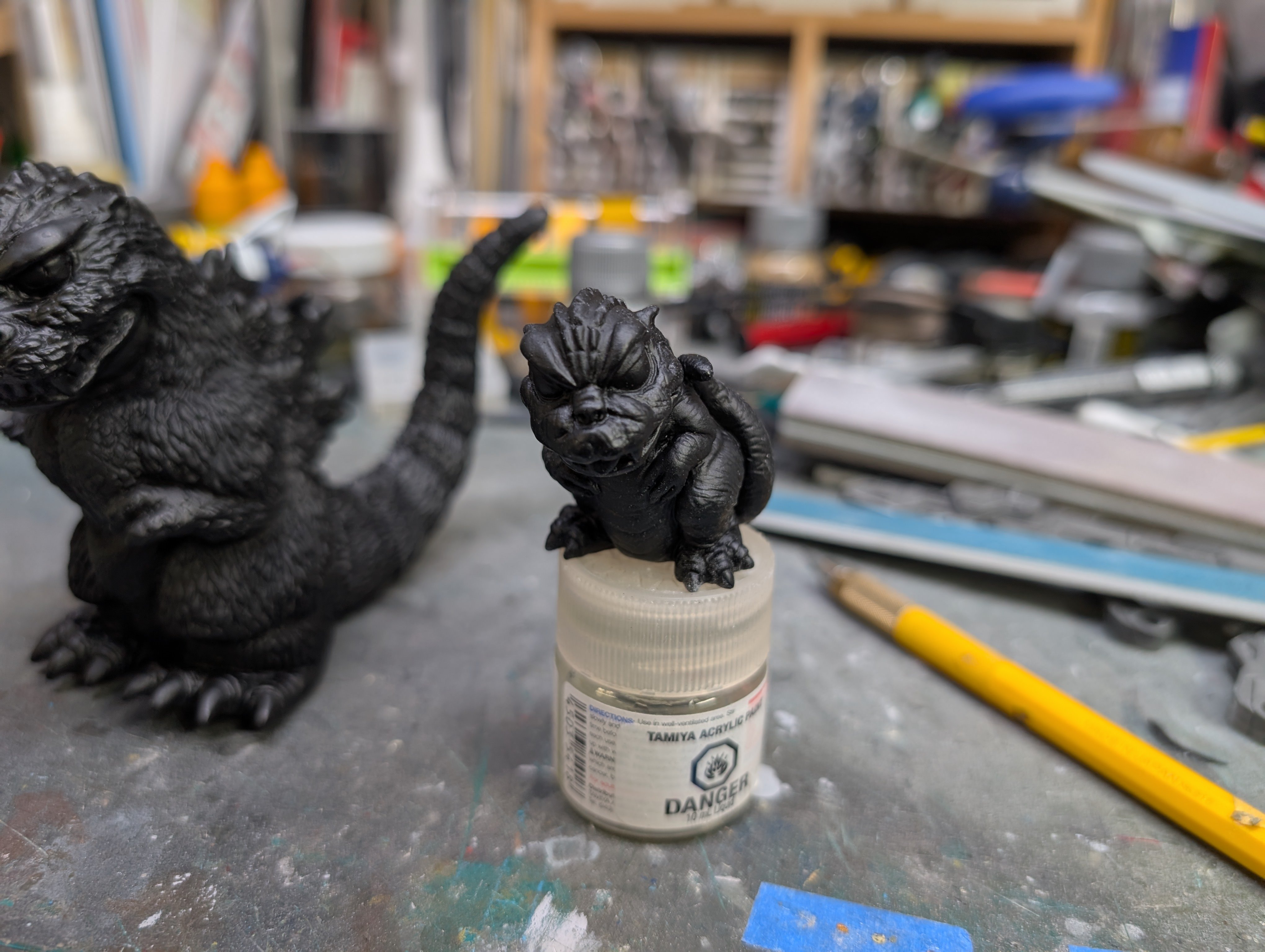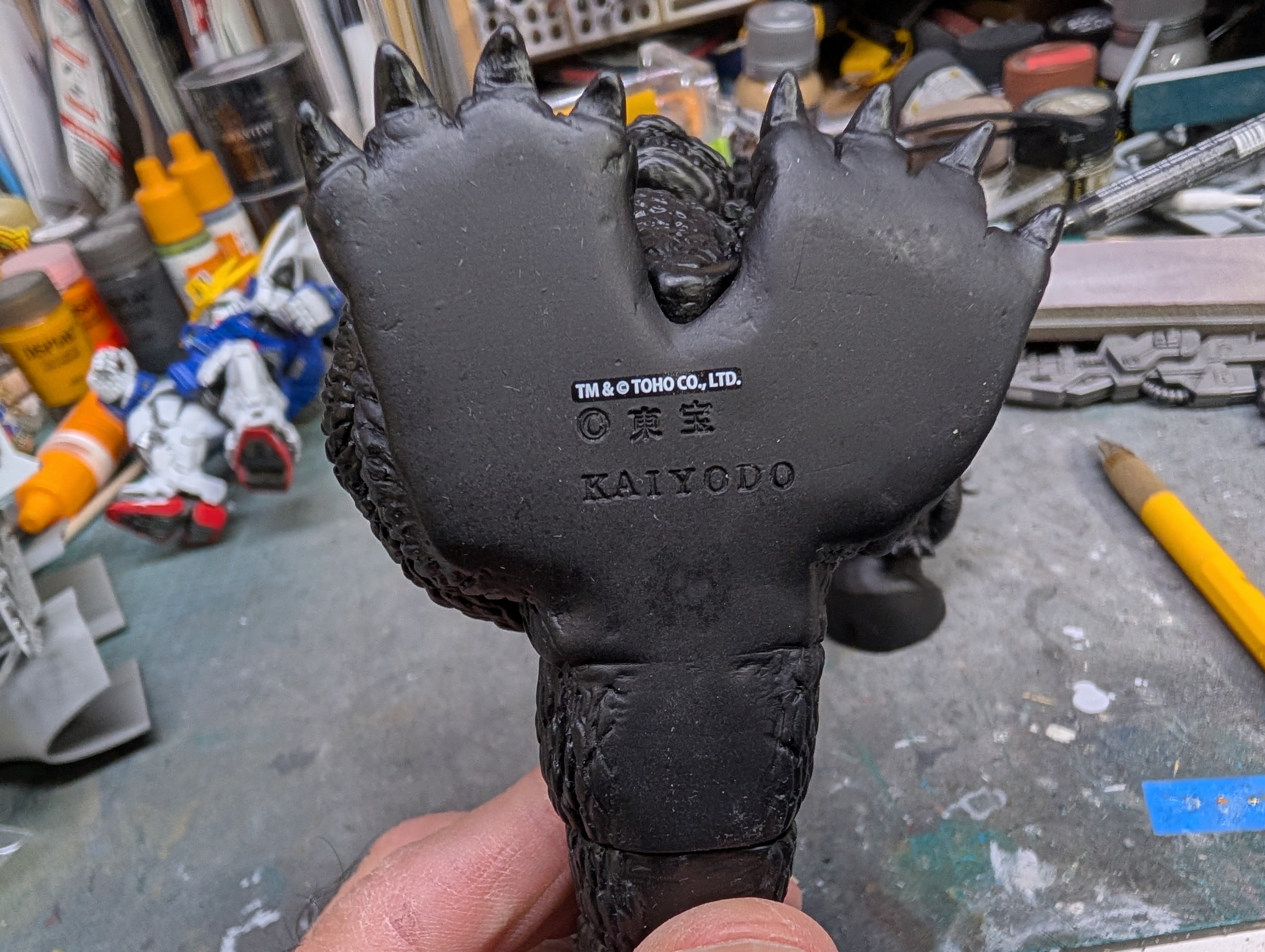 BlrwestSiR Posted 48 minutes ago Posted 48 minutes ago Japanese garage kits back in the '80s and '90s featured a lot of unlicensed vinyl models. Mostly figures but also vehicles. A few have recently been reissued and are even licenced now. That's the case with this Chibi Godzilla I picked up last year. Made by Kaiyodo, it even has a trademark registration on it. It's a simple kit, just three parts. The excess vinyl gets trimmed off. They generally put in some cut lines to help guide you. Tail and lower body press fit together. Then add the upper body and the assembly is done. Now the fun part- the paint job. 1