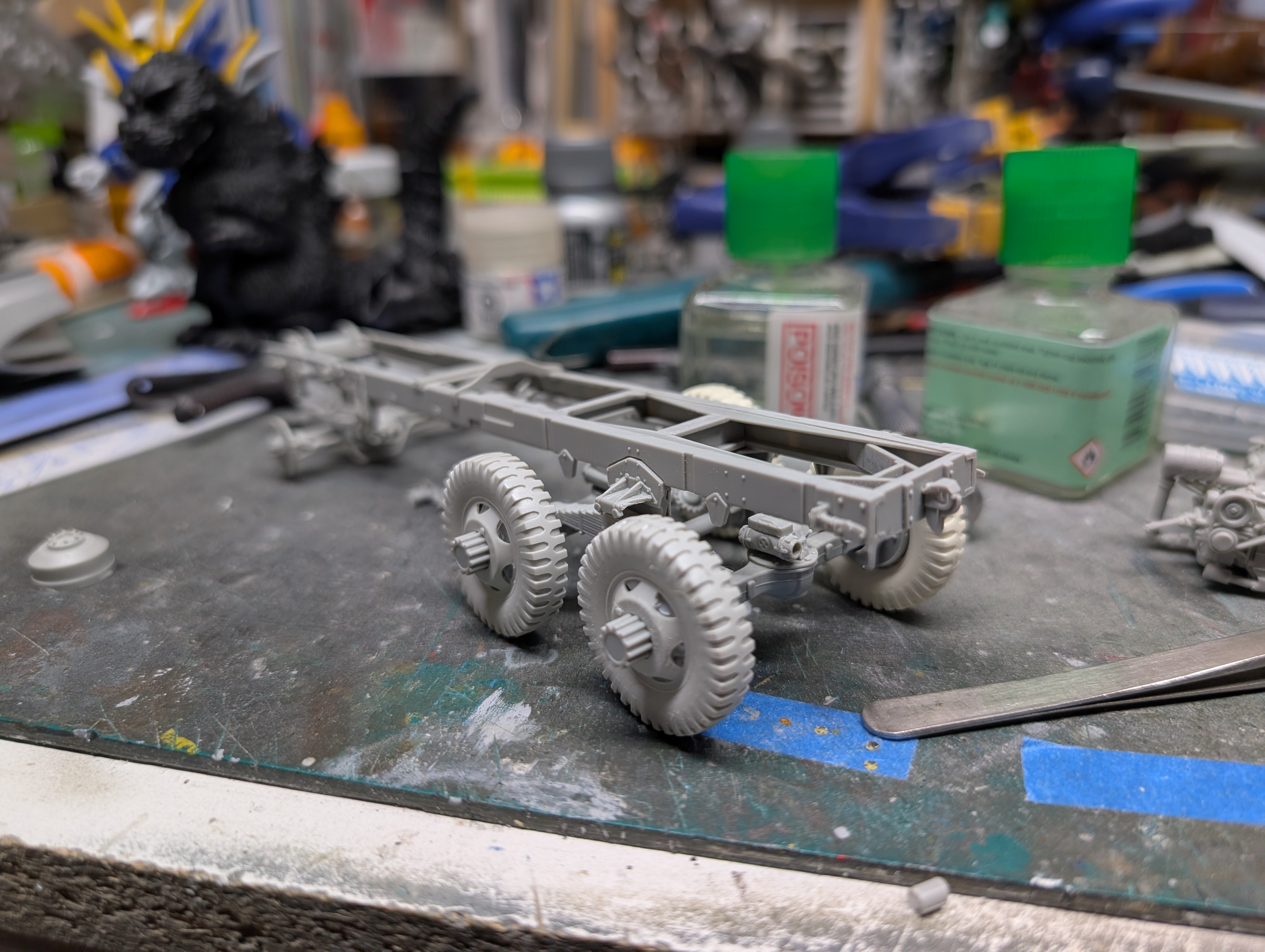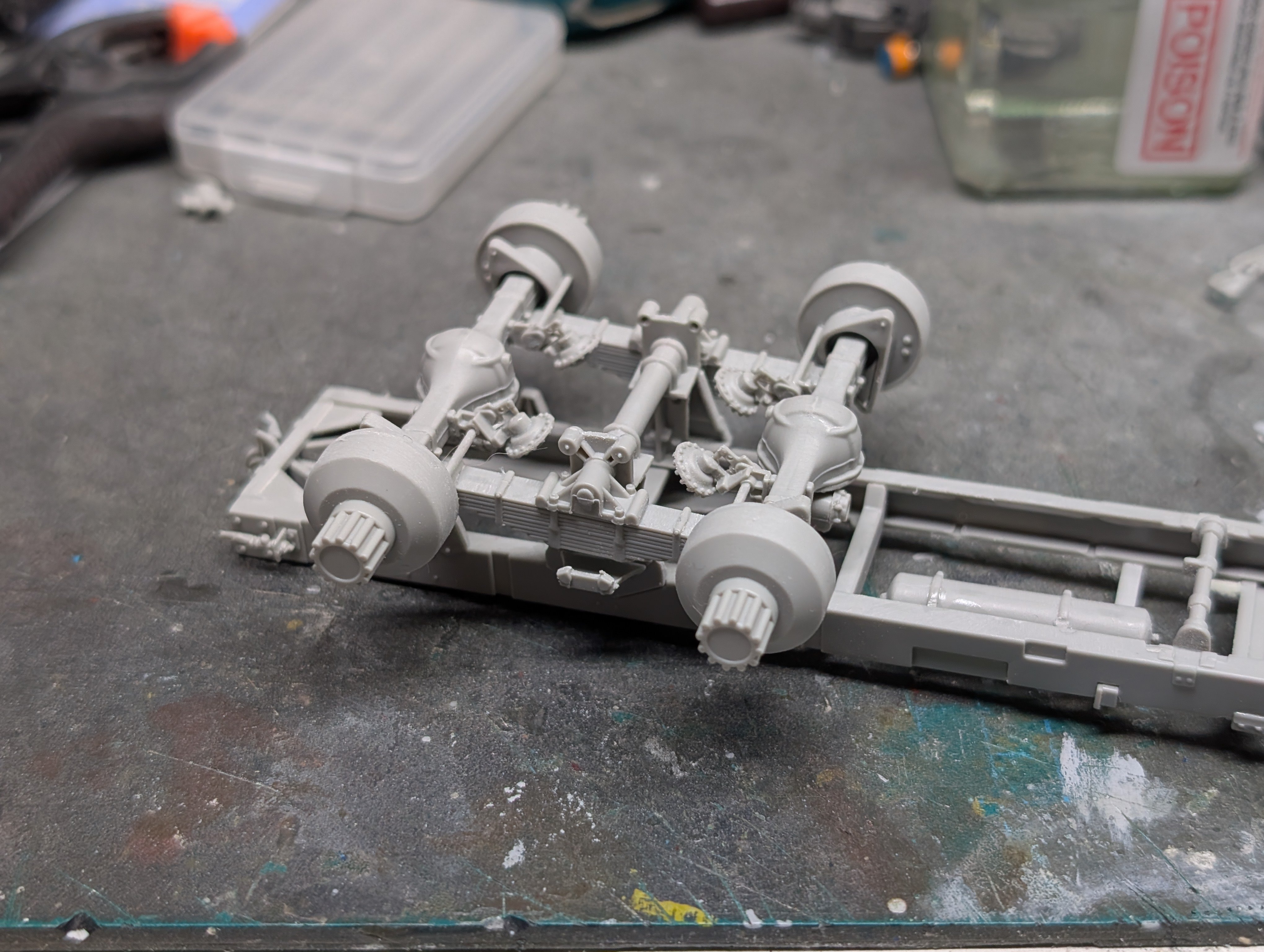 BlrwestSiR Posted 23 hours ago Posted 23 hours ago More work done on the Diamond T. Rear suspension is done except for the linkages. I decided now was a good time to make sure things are square and did a test fit of the wheels. I have the resin ones but they're just copies of the kit wheels with no additional detail so probably not worth the money. 2